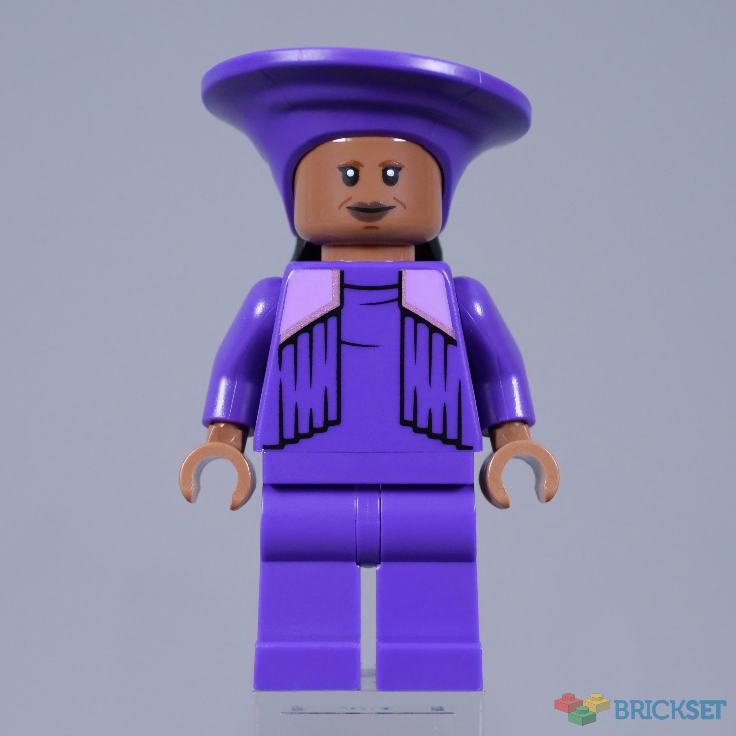 As the counsellor on the Enterprise, Deanna Troi stands out among the bridge officers in her lavender garb. The jumpsuit's exact shade is hard to translate to LEGO colours because dark bluish grey is arguably the closest modern match to the mauve onscreen, but the classic sand purple memorably used for Zam Wesell would be ideal, so it is a shame that could not return.