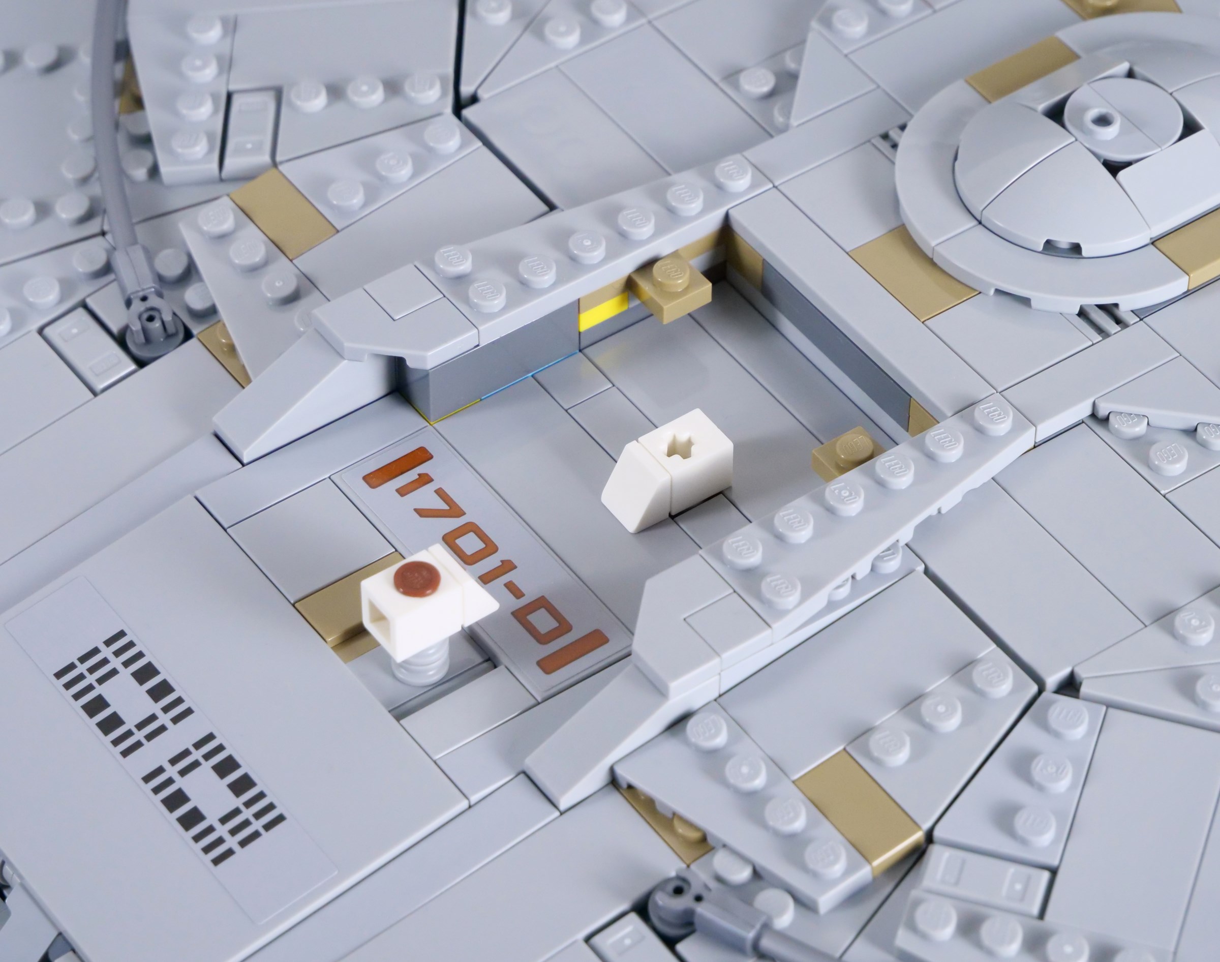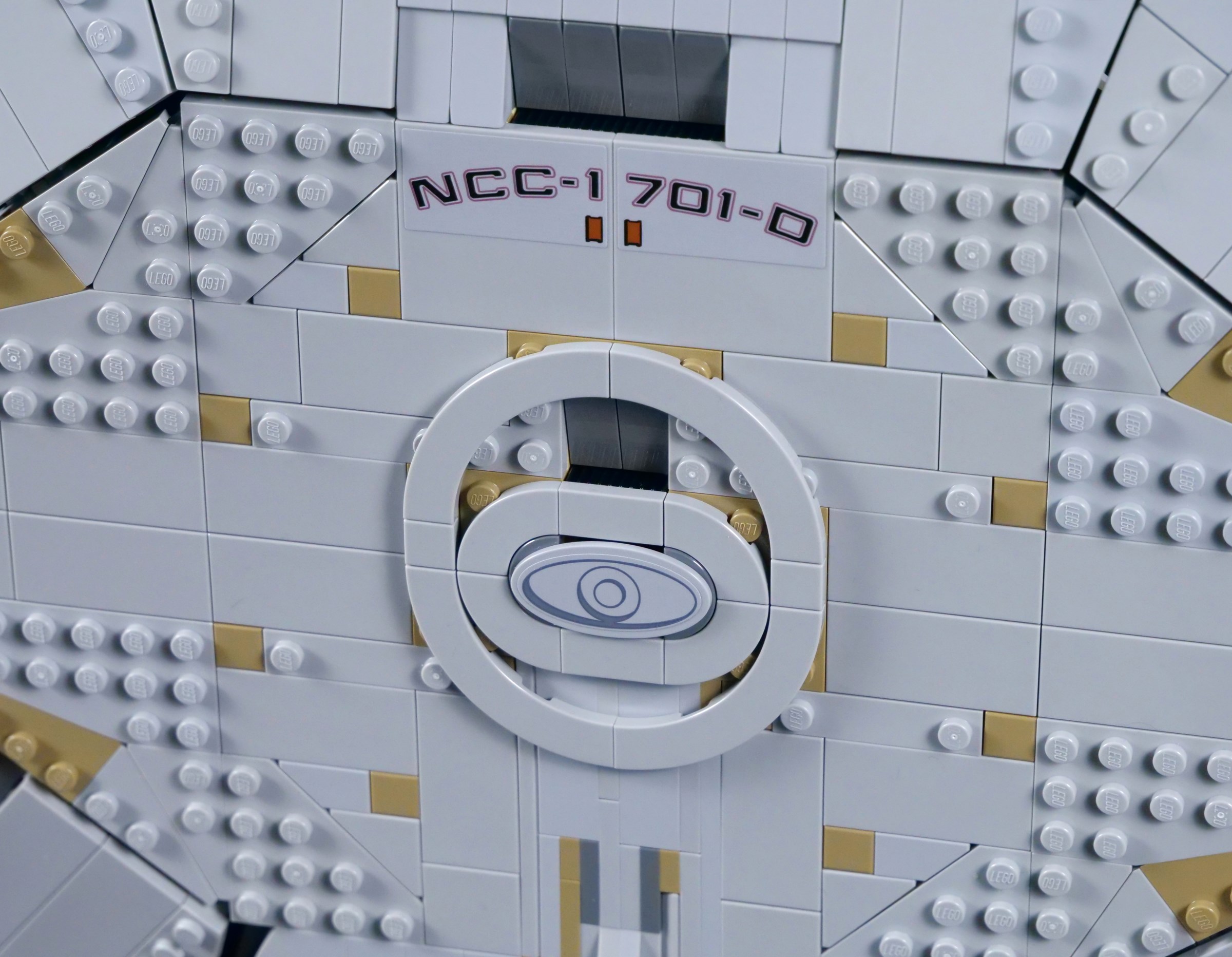 The texture on the hull surface looks splendid though, using ingots, grille tiles and the natural seams between LEGO pieces. The vessel's name and registration are both printed on a 6x12 tile and the bridge dome is accurately positioned just aft of the saucer's centreline. The stud on top also reflects a circular detail found on the original filming models.