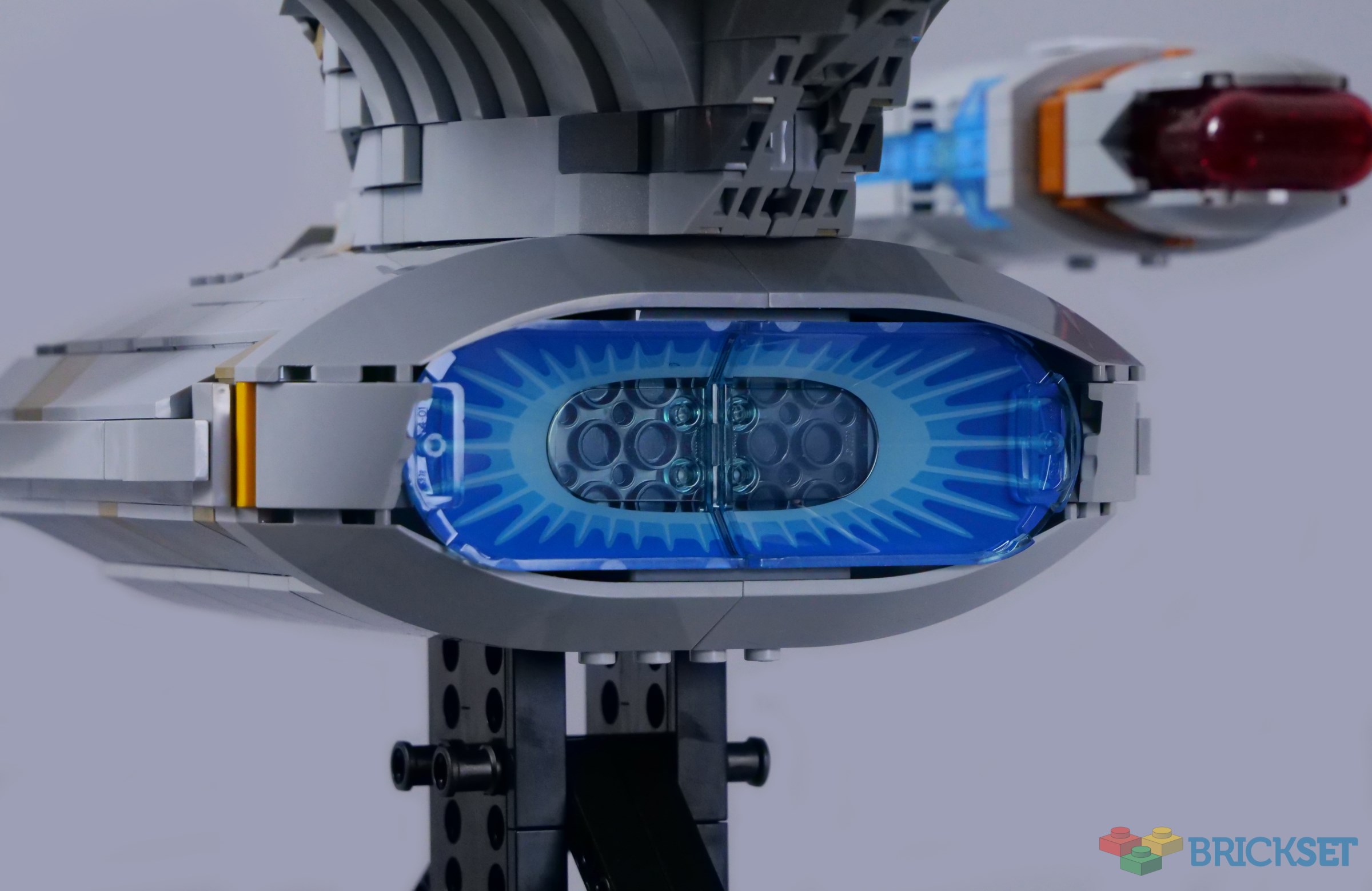 I was a bit disappointed to find no microscale recreation of the bridge inside the saucer. There would obviously not be space for anything nearing minifigure-scale, but there is a small hollow area housing the ship's dedication plaque. Picard memorably studies the plaque while delaying before accepting a hail from the alien Sheliak in The Ensigns of Command.
