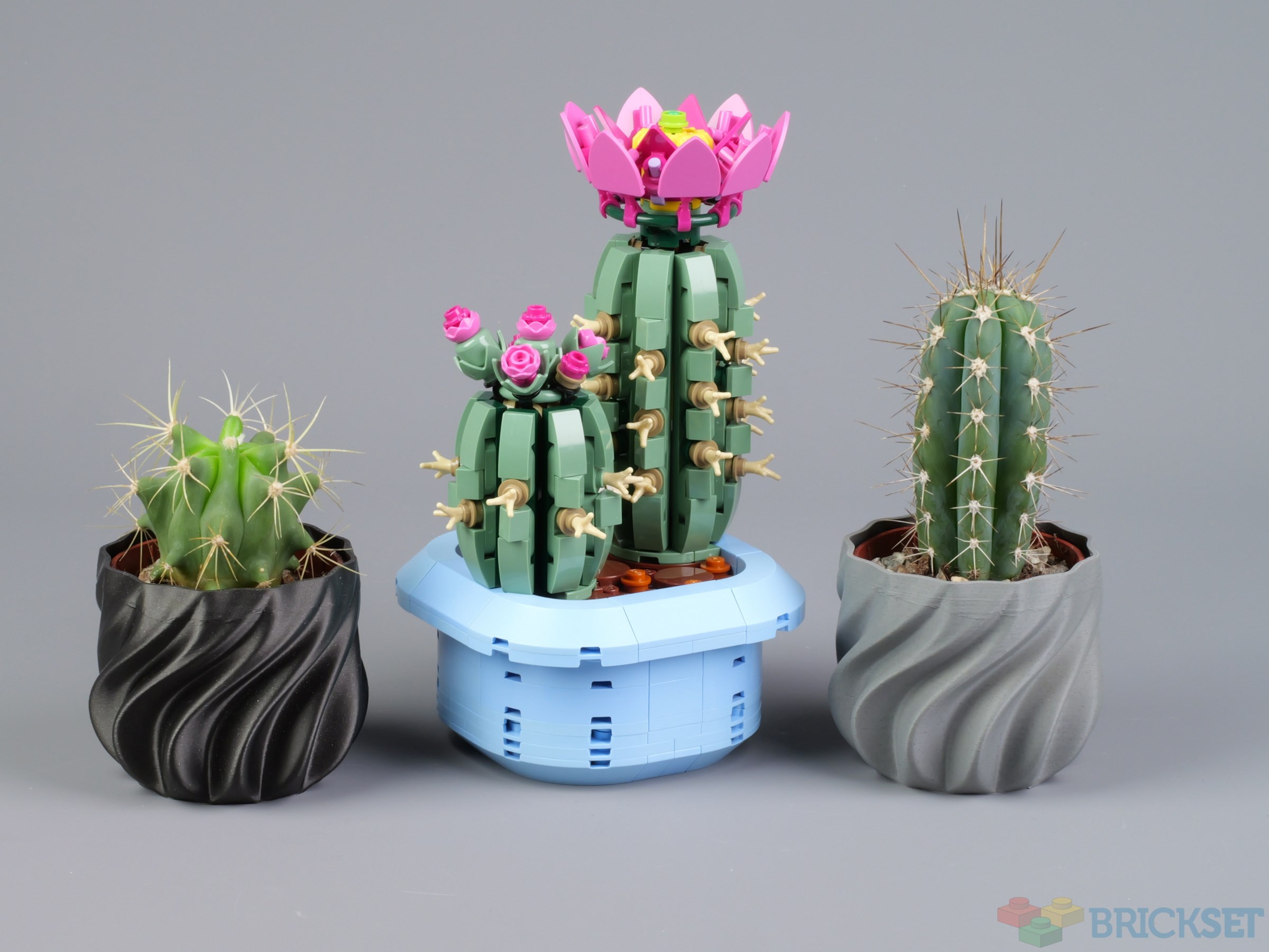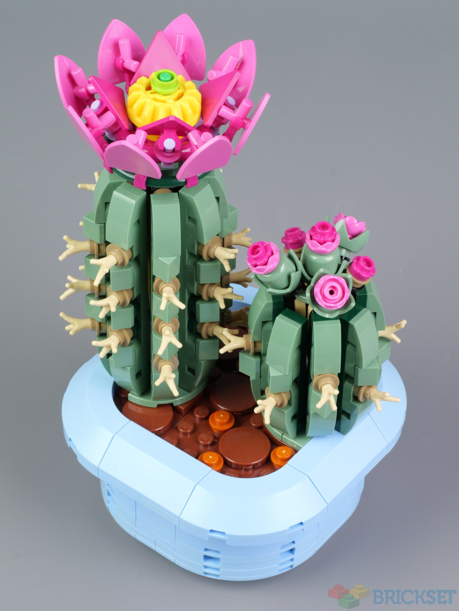 The 8-sided barrels of the plants are cleverly constructed in two halves, each with 4 sides, which are then slotted together and held in place with a 3.18 bar in the centre. The small cacti utilises a new dia-3 ring with five connection points to hold the flower heads in place.