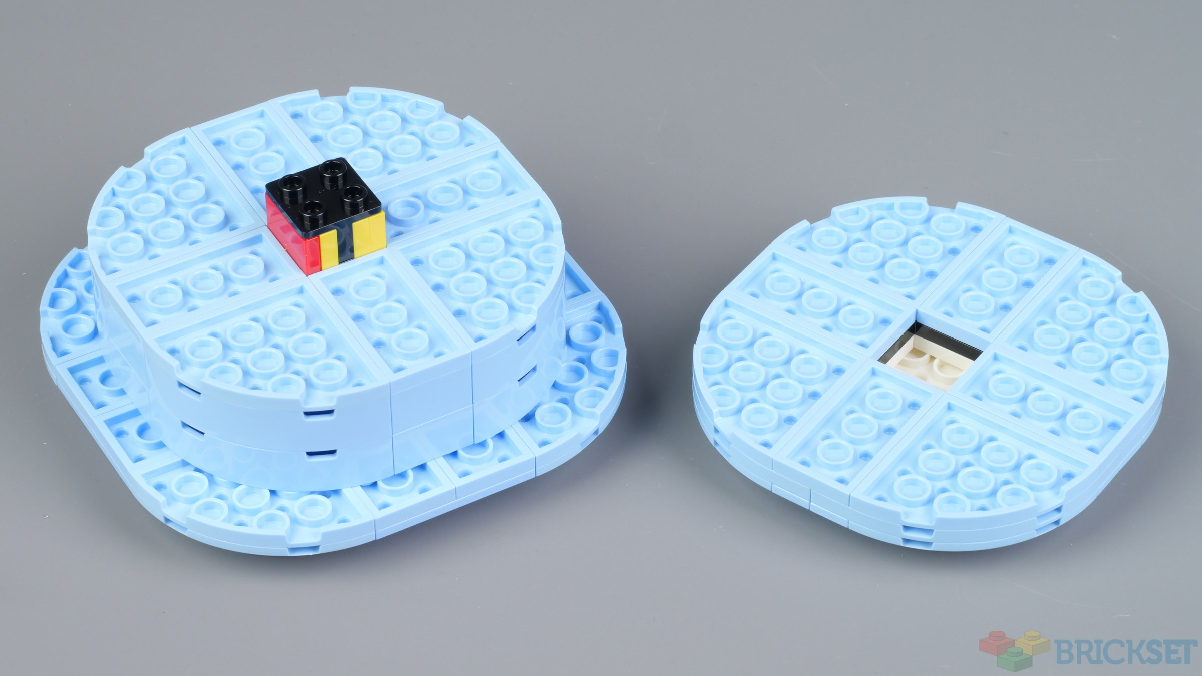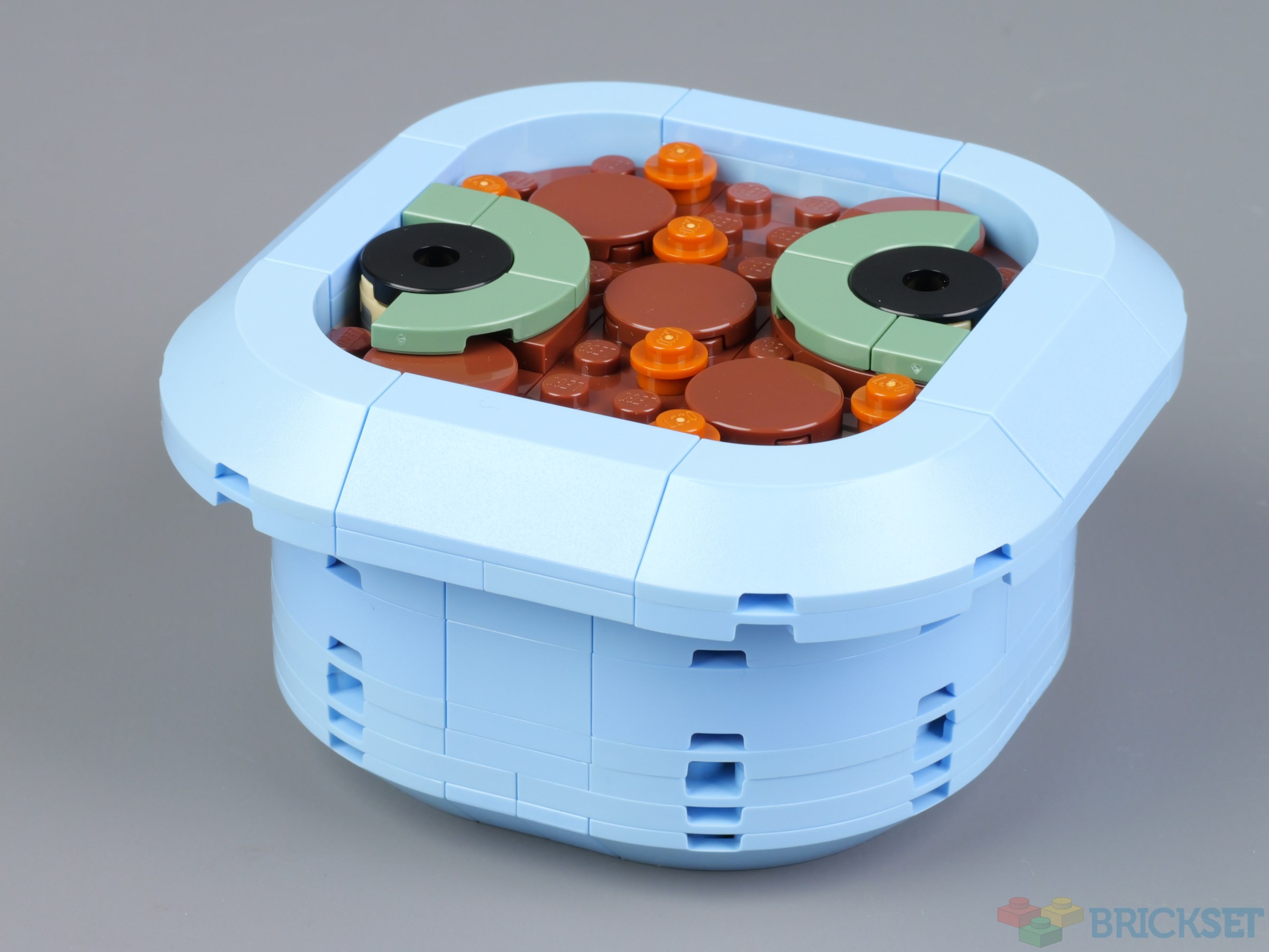 The pot is built using light royal blue pieces, some of which are new in that colour. The bottom section is constructed upside-down and held in place with a SNOT cube in the middle.