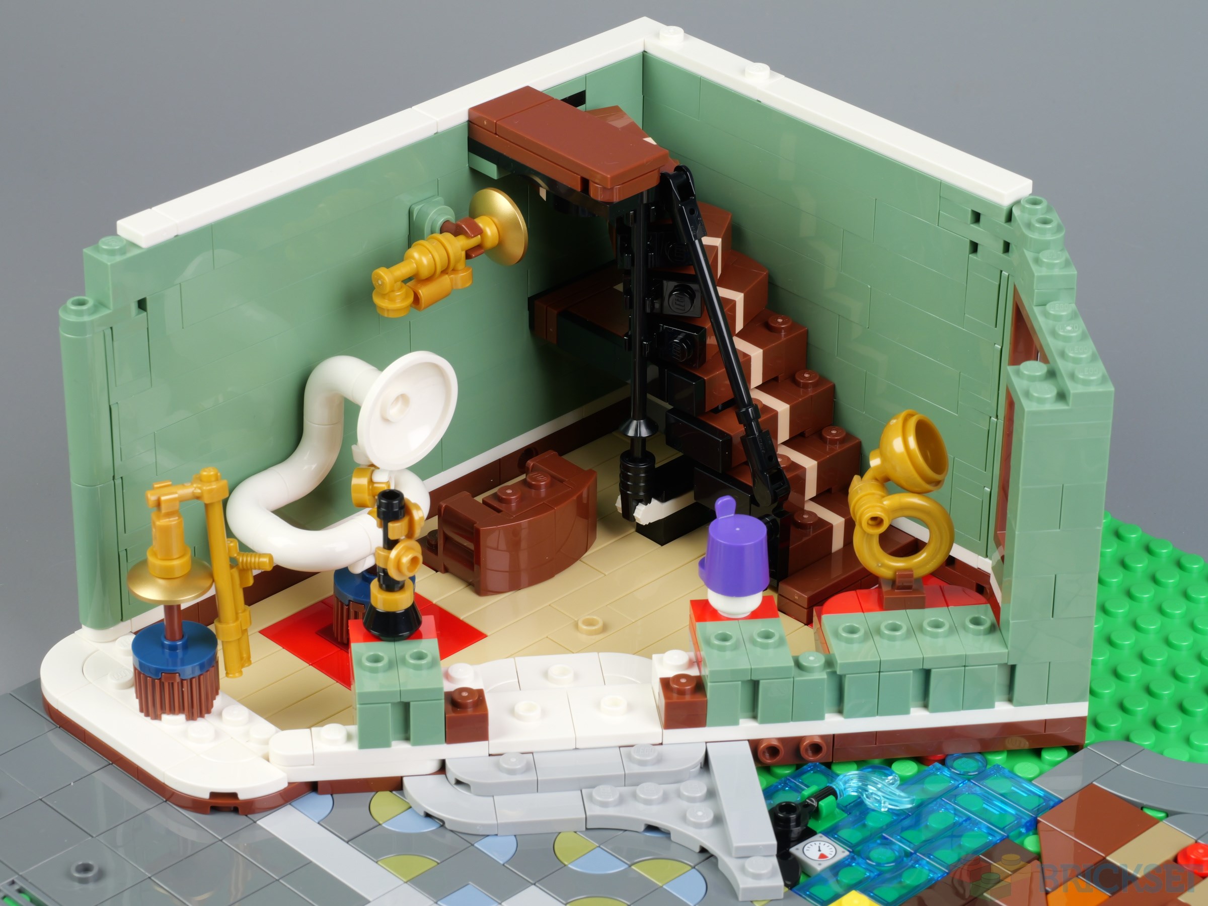 The contents of the shops are best observed before their front walls are added and in the music shop we can see various brass instruments, including a trumpet, tuba, and various horns.
