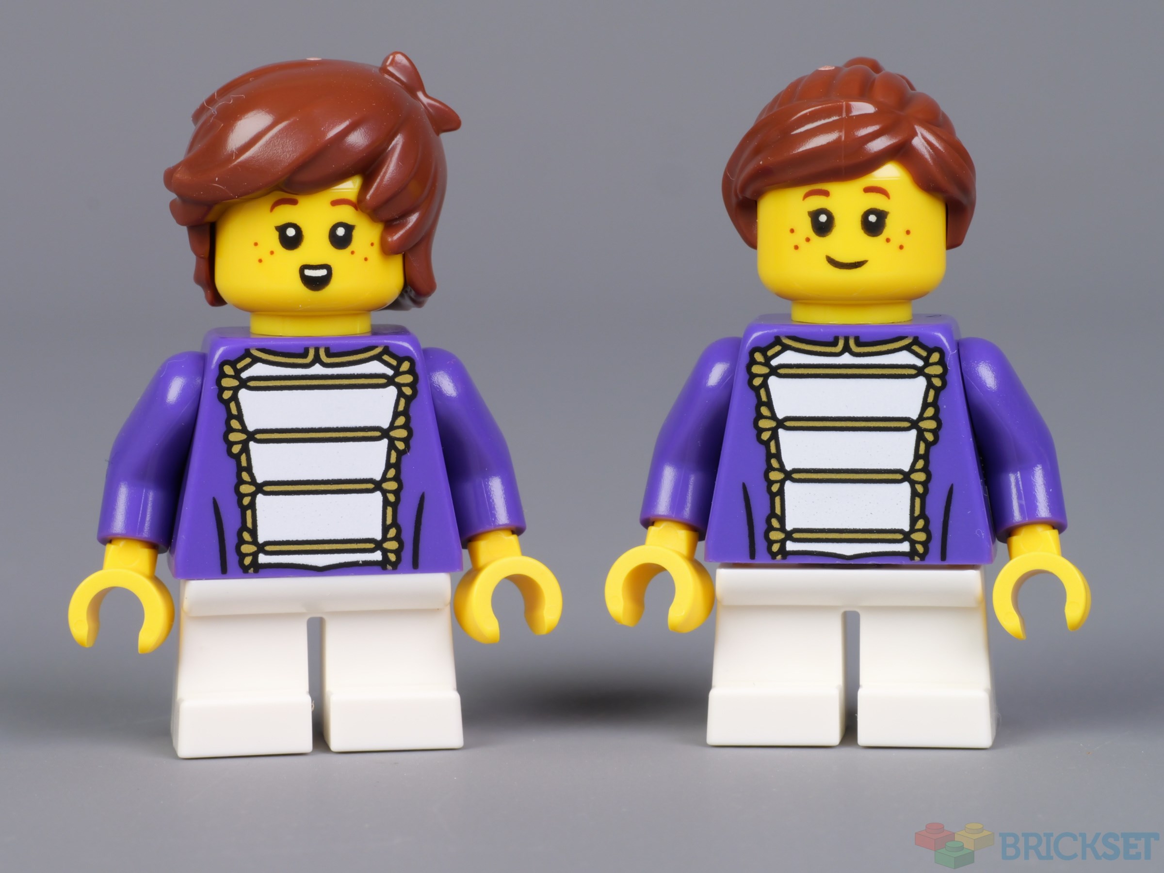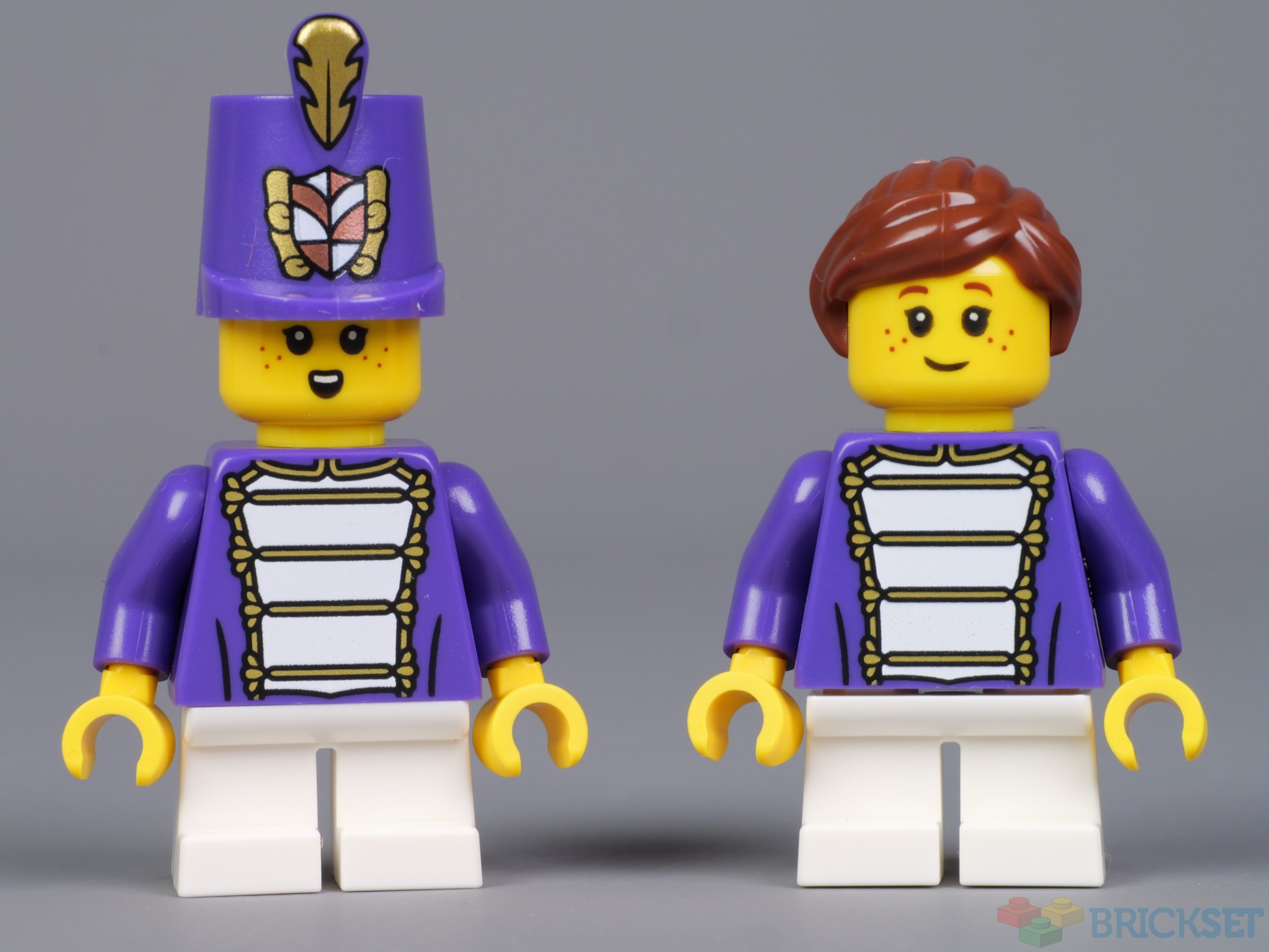 Seven minifigures populate the set and the highlight of the selection is definitely the two young band members who, according to the set's designer, are twins. Their torso is new, and the tall cap, or shako, normally worn by the Imperial Guards in Pirates sets, is new in dark purple. The print on the front is the Billund coat of arms. A second one is provided for the other girl, and can be found in the shop.