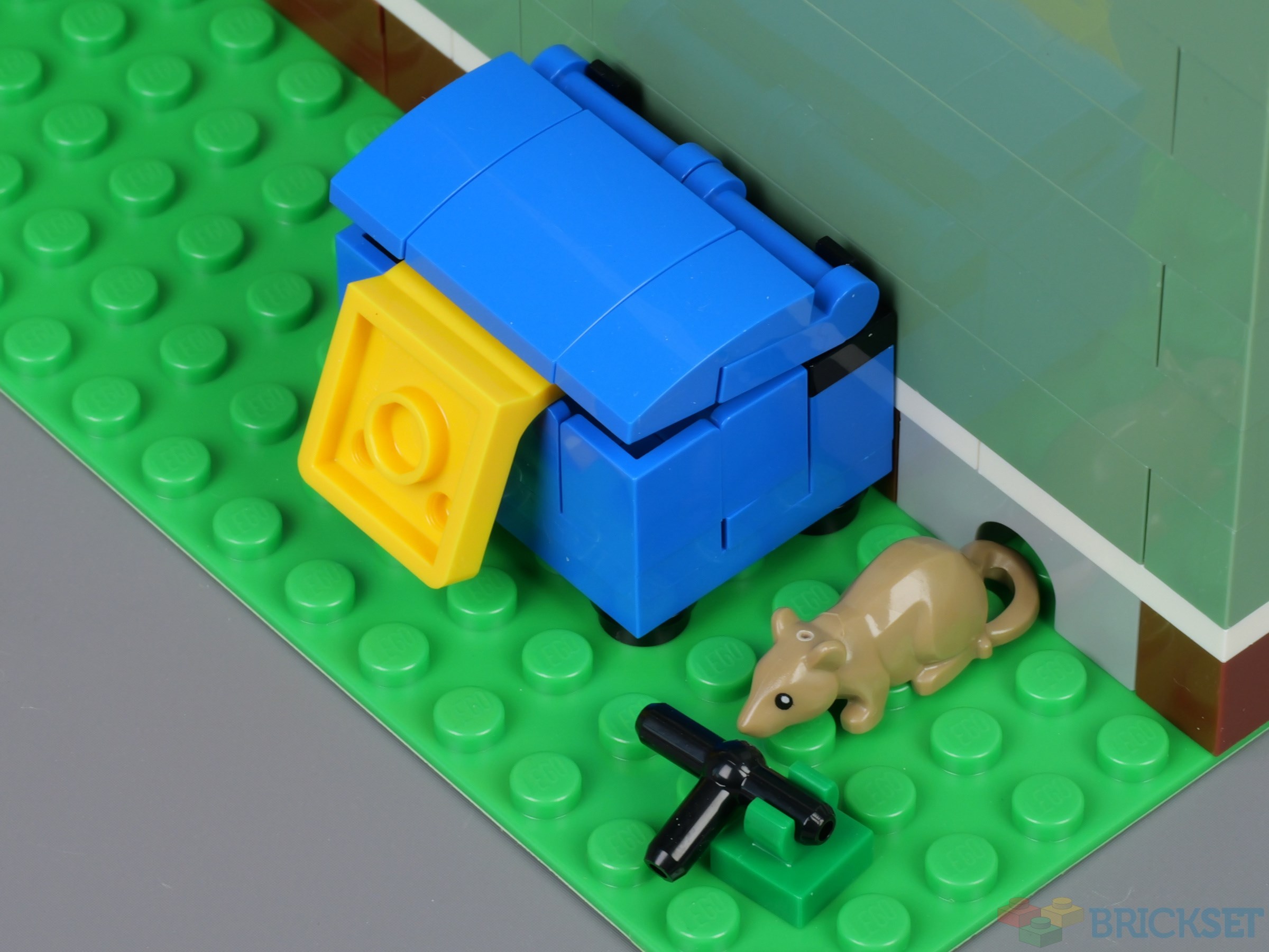 Another interesting detail is the wheelie bin at the back with an old-style minifig chair in it. The piece used to be a staple in modular buildings but brick-built ones are expected nowadays, and in his review over at The Rambling Brick, Richard suggests that perhaps the fact it's been thrown away symbolises the shift to fancier alternatives.