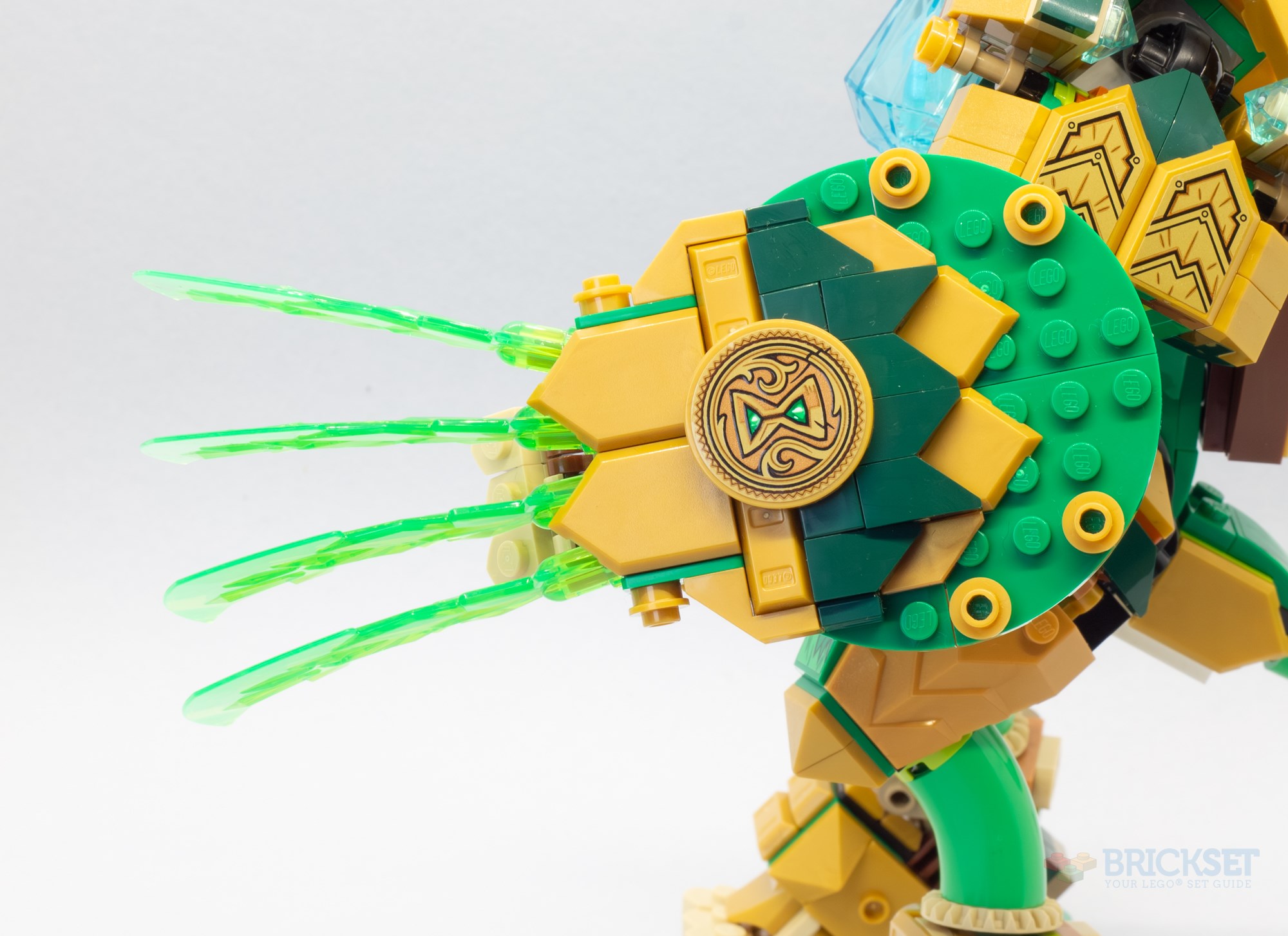 For the other hand, a large green-and-gold shield is built with some of the remaining pieces, and adorned with the hourglass logo. The wing tips have been repurposed as large claw-like protrusions from one side of the shield.