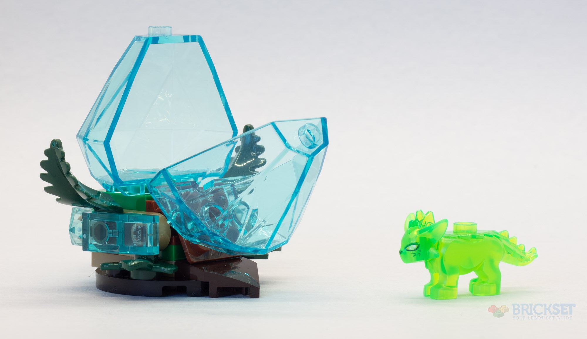 This set also introduces our third colour of the Treasure Creatures, this time in a transparent bright green. As before, a similar blue crystal mini-build is constructed to house it.