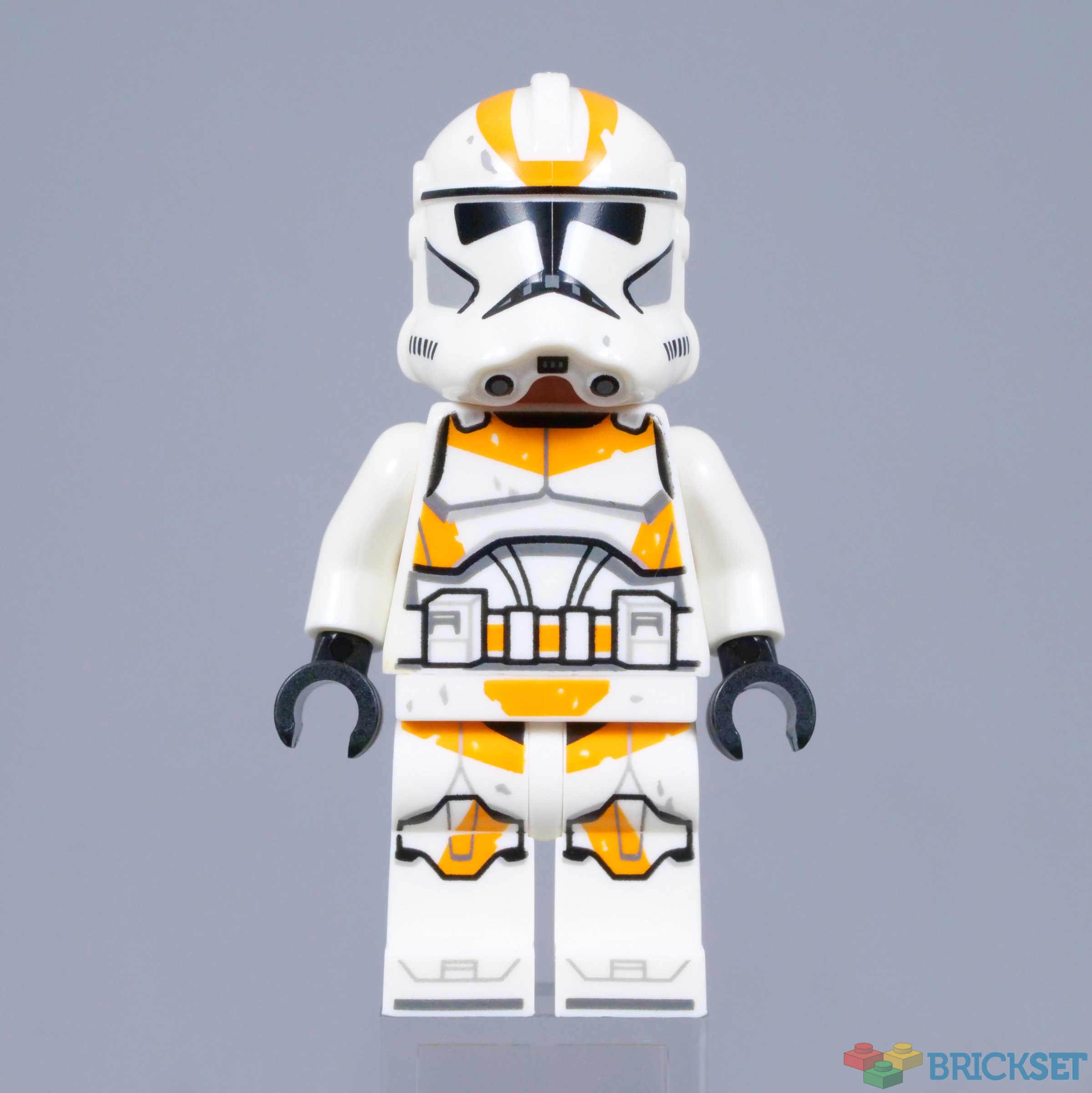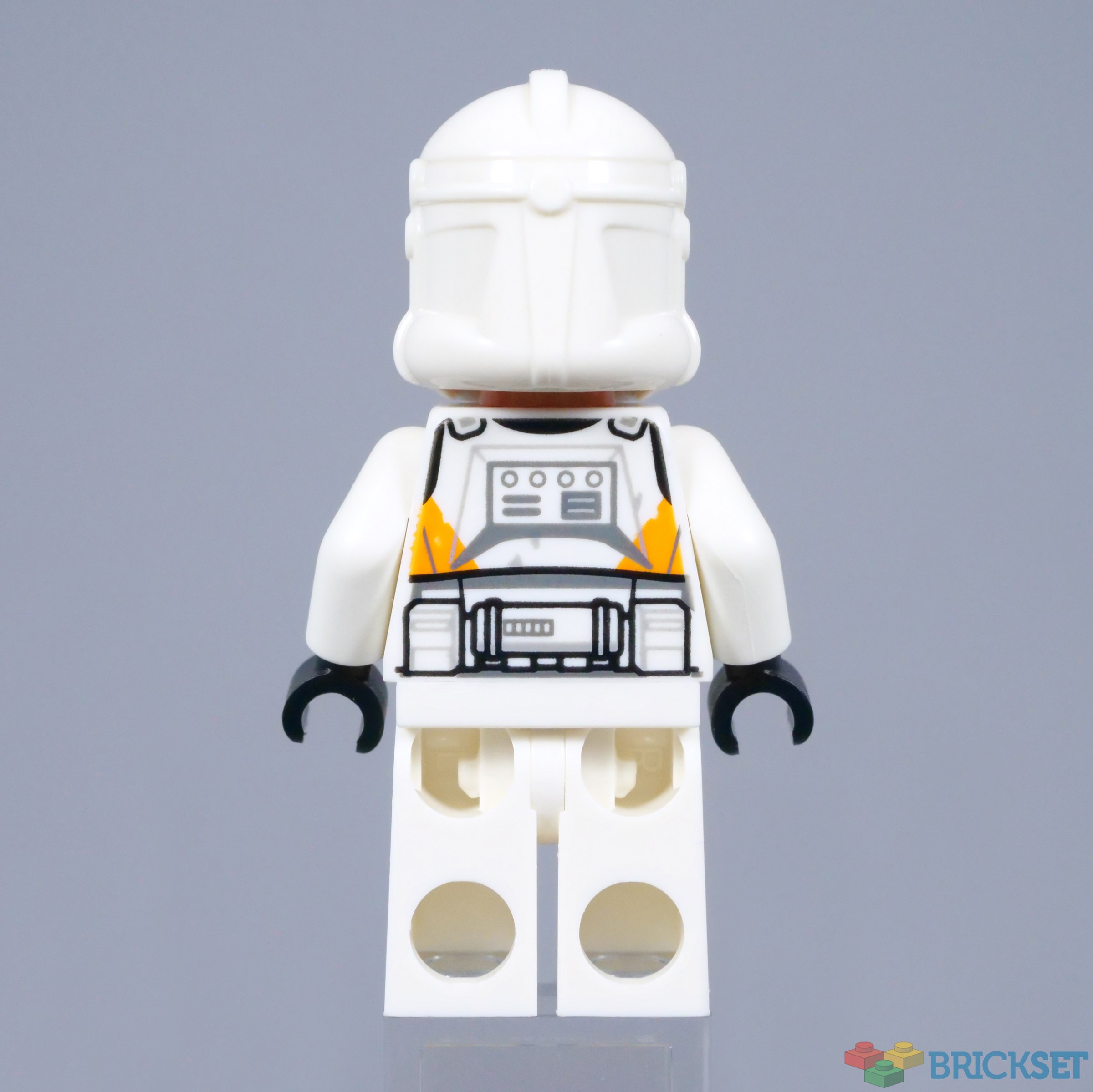 The shape of the orange triangle on the trooper's head remains imperfect, as it should come to a point above his visor, but the design is otherwise superb. The orange stripes on the torso and legs correspond with the onscreen Clone Troopers and the battle damage is also effective, even though I usually prefer Clone Trooper minifigures with clean armour.