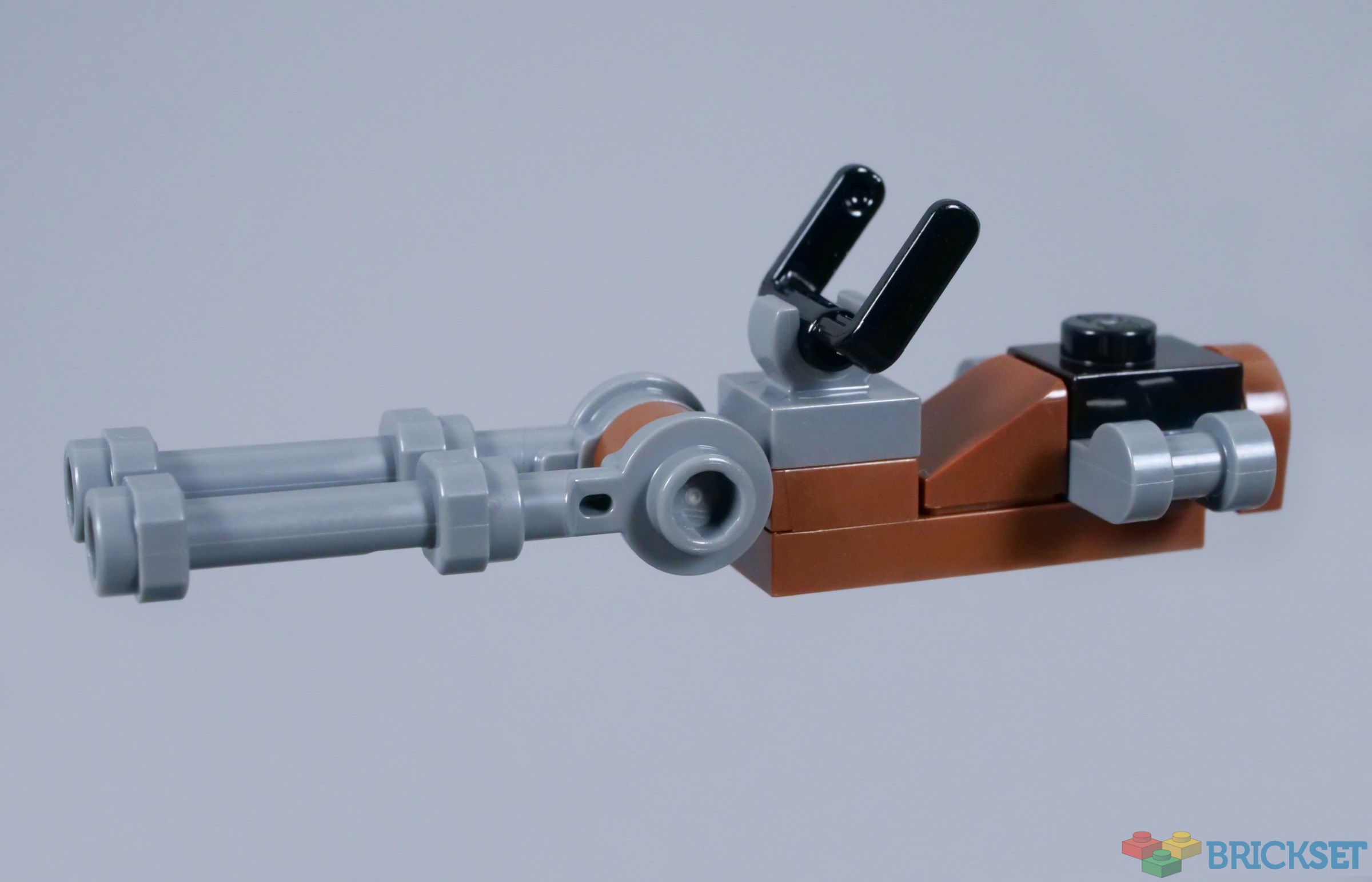 It does indeed, with a great rendition of a 74-Z speeder bike, memorably deployed on the Forest Moon during Return of the Jedi. The proportions of this vehicle are accurate and I love the shape of the saddle and the handlebars. However, I am inclined to add a tan 1x1 tile behind the saddle to represent a folded tarp and the model lacks reddish brown steering vanes at the front. Perhaps a couple of 1x1 brackets could have sufficed for those panels.