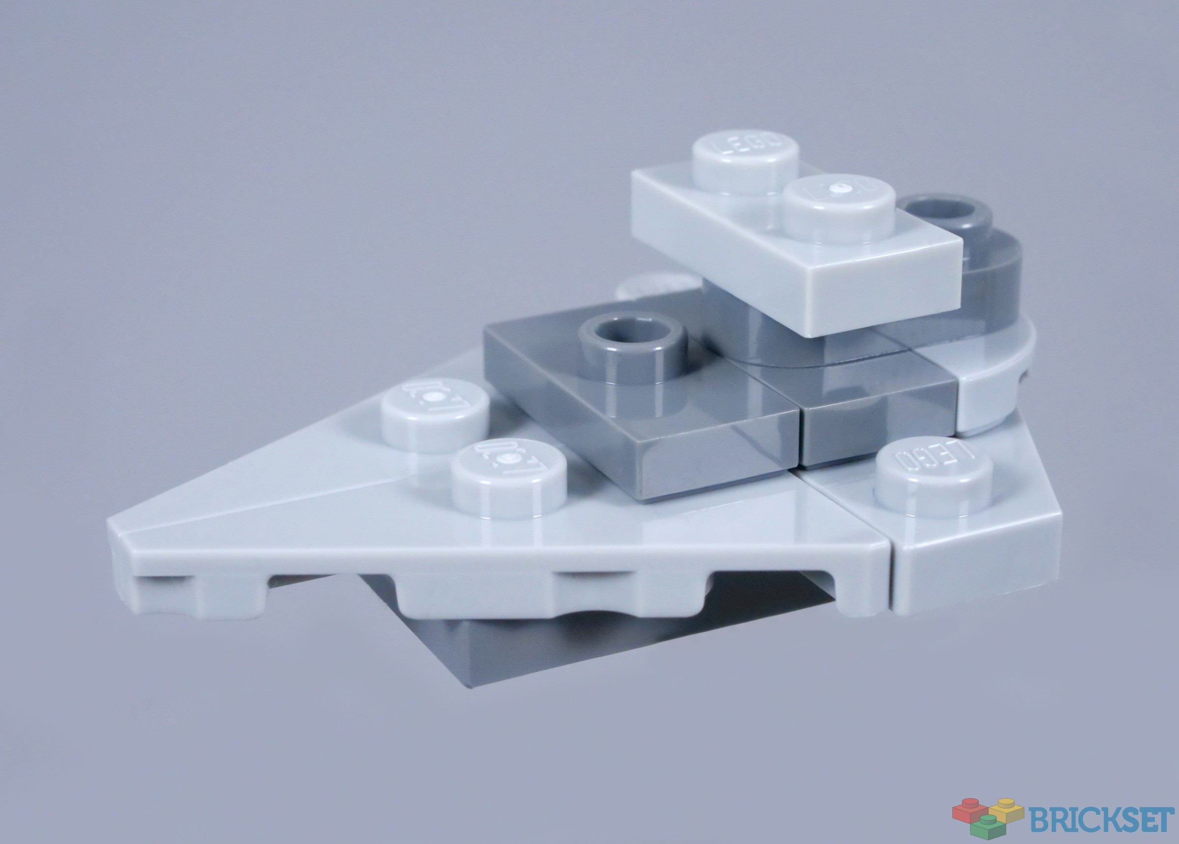 When the new 2x4 wedge plates were introduced in 2020, I thought immediately of their utility for Advent Calendars models and microscale Star Destroyers in particular. Today brings an Imperial Star Destroyer, which puts the wedge plates to superb use and cleverly integrates a 1x2 plate for the command tower, complete with studs forming the shield projectors. 75356 Executor Super Star Destroyer contains a pair of similar Star Destroyers, but this one features some extra dark bluish grey pieces.