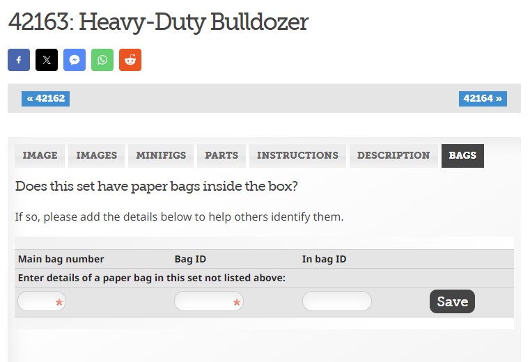 Also, regarding the addition of bag IDs on Brickset... will there be a way to verify/report errors? I know that bags may change over time so there could be a large number of IDs for a given set over its lifespan, but I could foresee actual errors creeping in if somebody, say, mistypes a bag number for one set with a number that ends up actually used for a completely different bag in a completely different set.