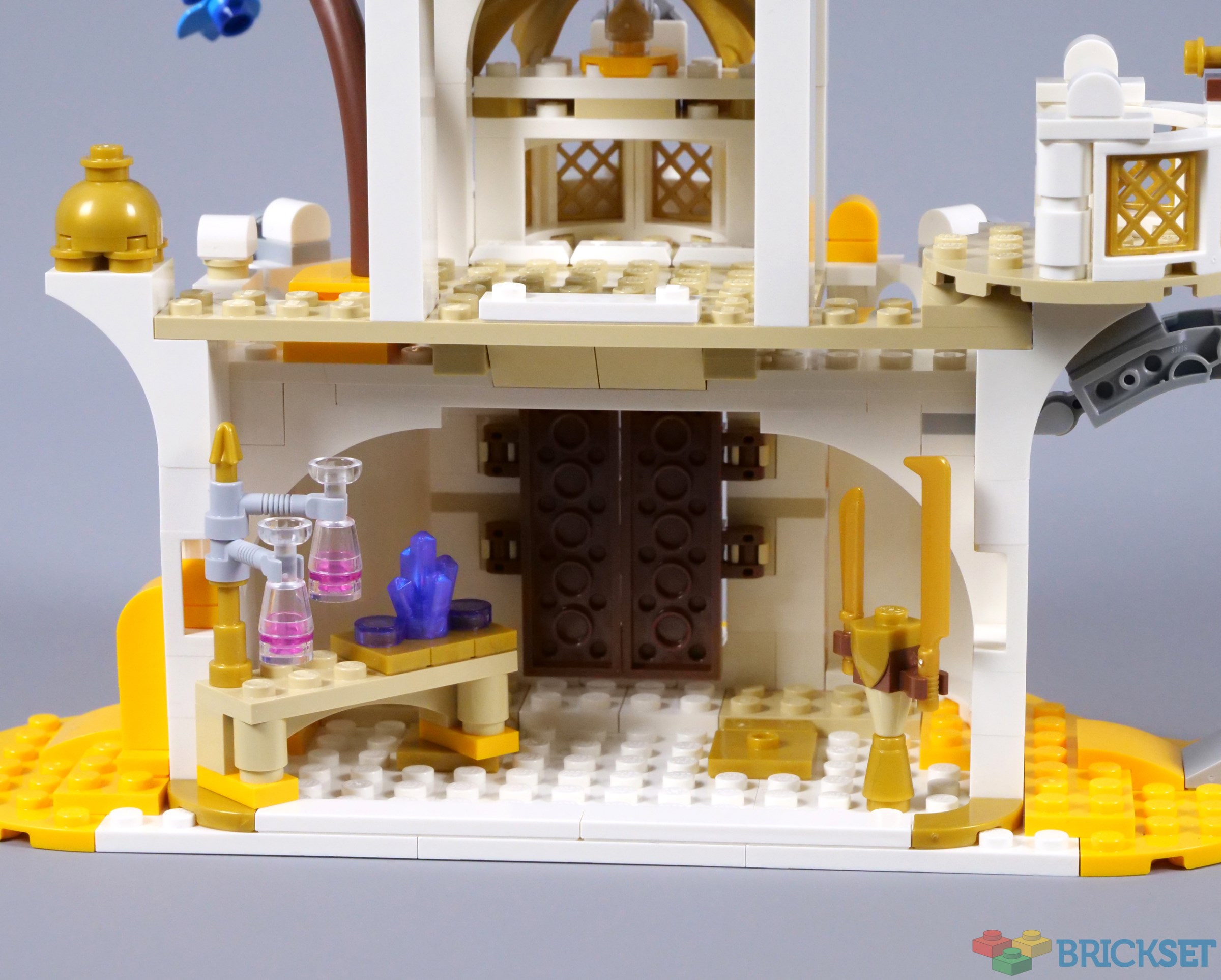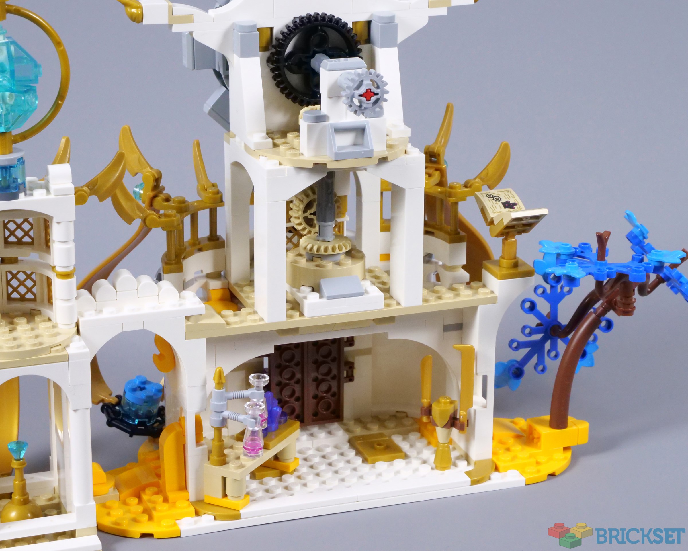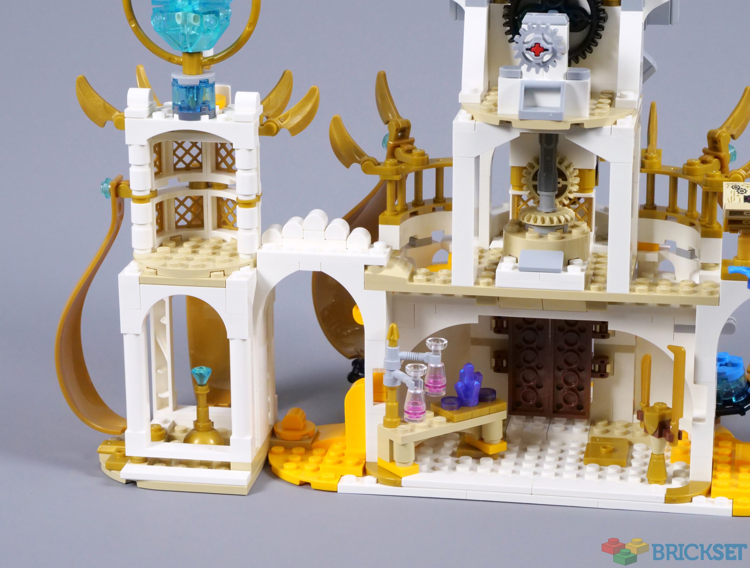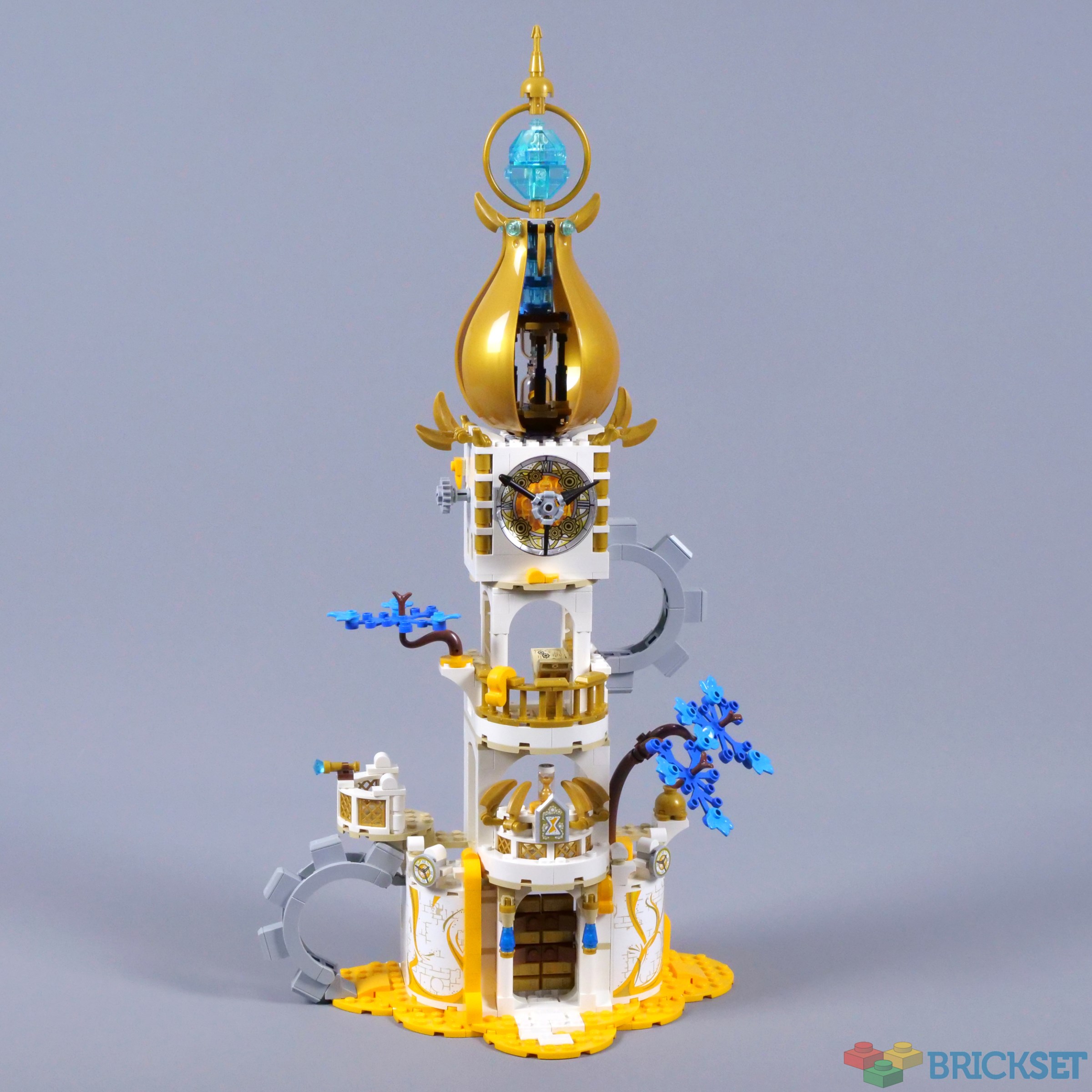 I am impressed with the exterior of the tower though, especially with its pearl gold windows and decorative claws. Again, the tower is finished with a brick-built crystal inside a golden ring, with the hourglass accessory placed in front. I presume the crystal serves as a source of power, so perhaps this is being channelled into the hourglass.