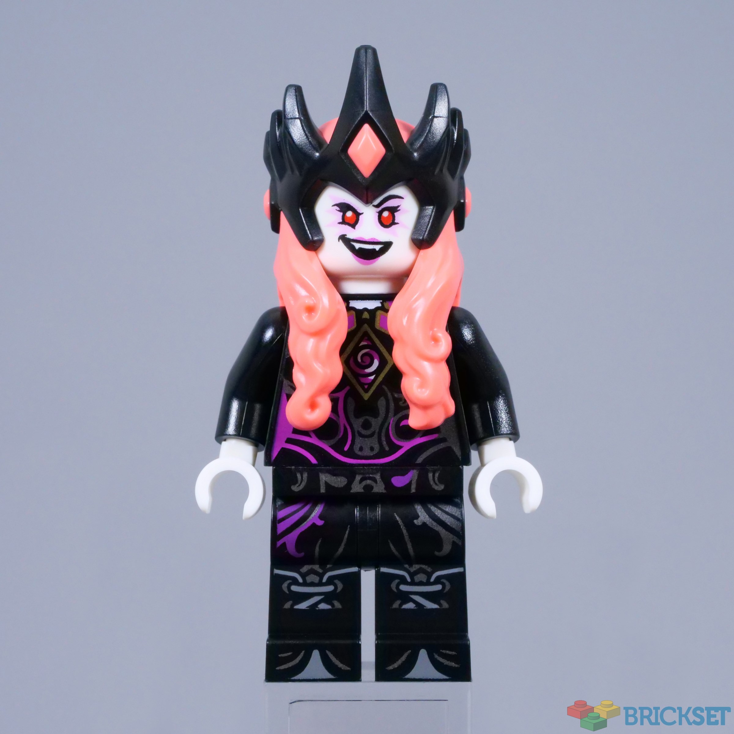 A matching stripe thus adorns the other side of the Never Witch's head, hinting at the villains' prior association. The trans-pink crystal atop her staff continues this colour and completes an exceptional minifigure, certainly rivalling the aforementioned villains DREAMZzz produced last year.