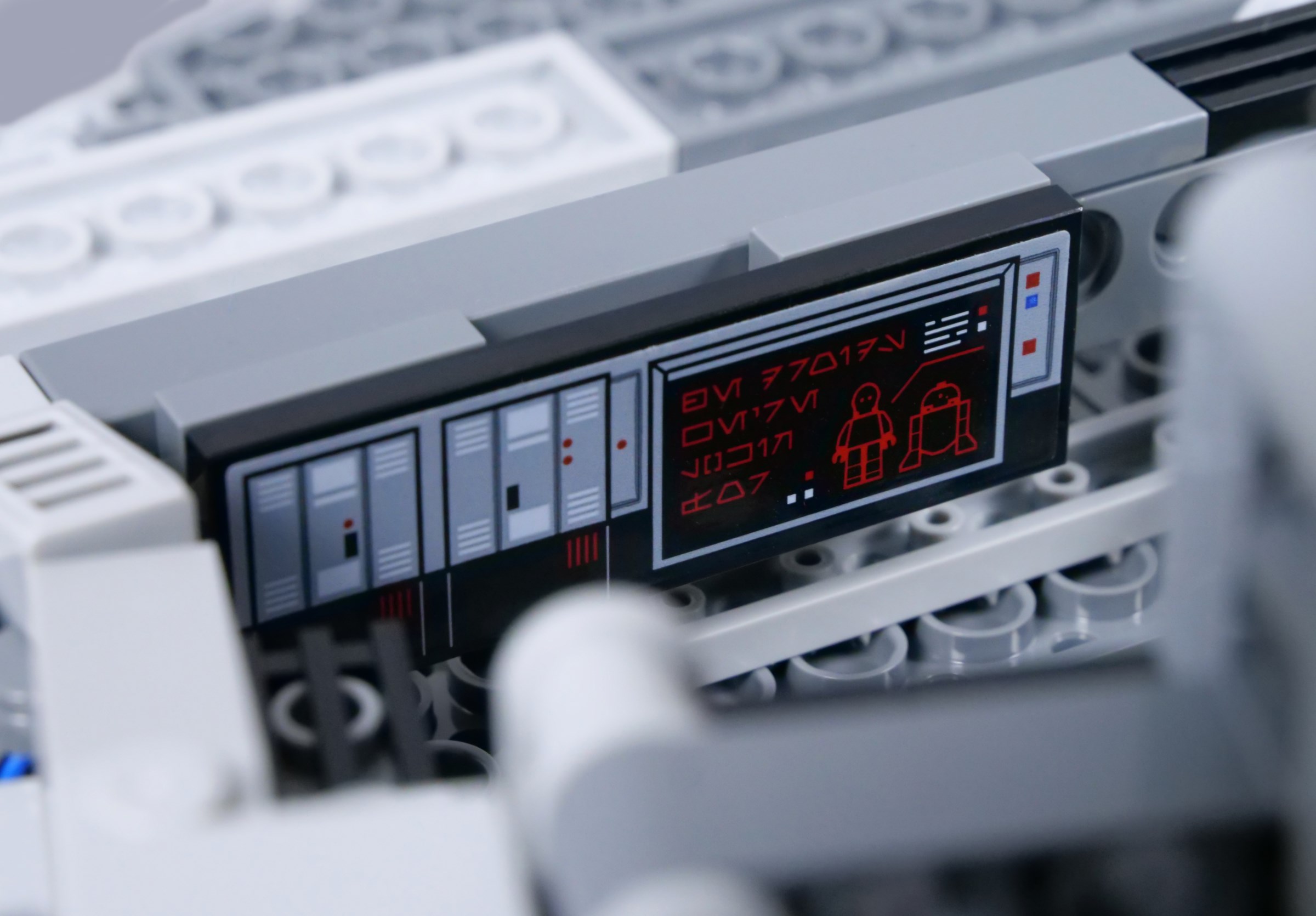 Several stickers are applied to 2x6 tiles along the walls, mostly featuring generic controls. This one opposite the desk is special though, as shots of C-3PO and R2-D2 are shown on a screen. Appropriately, the red Aurebesh text identifies them 'the droids we're looking for', which is a nice Easter egg!