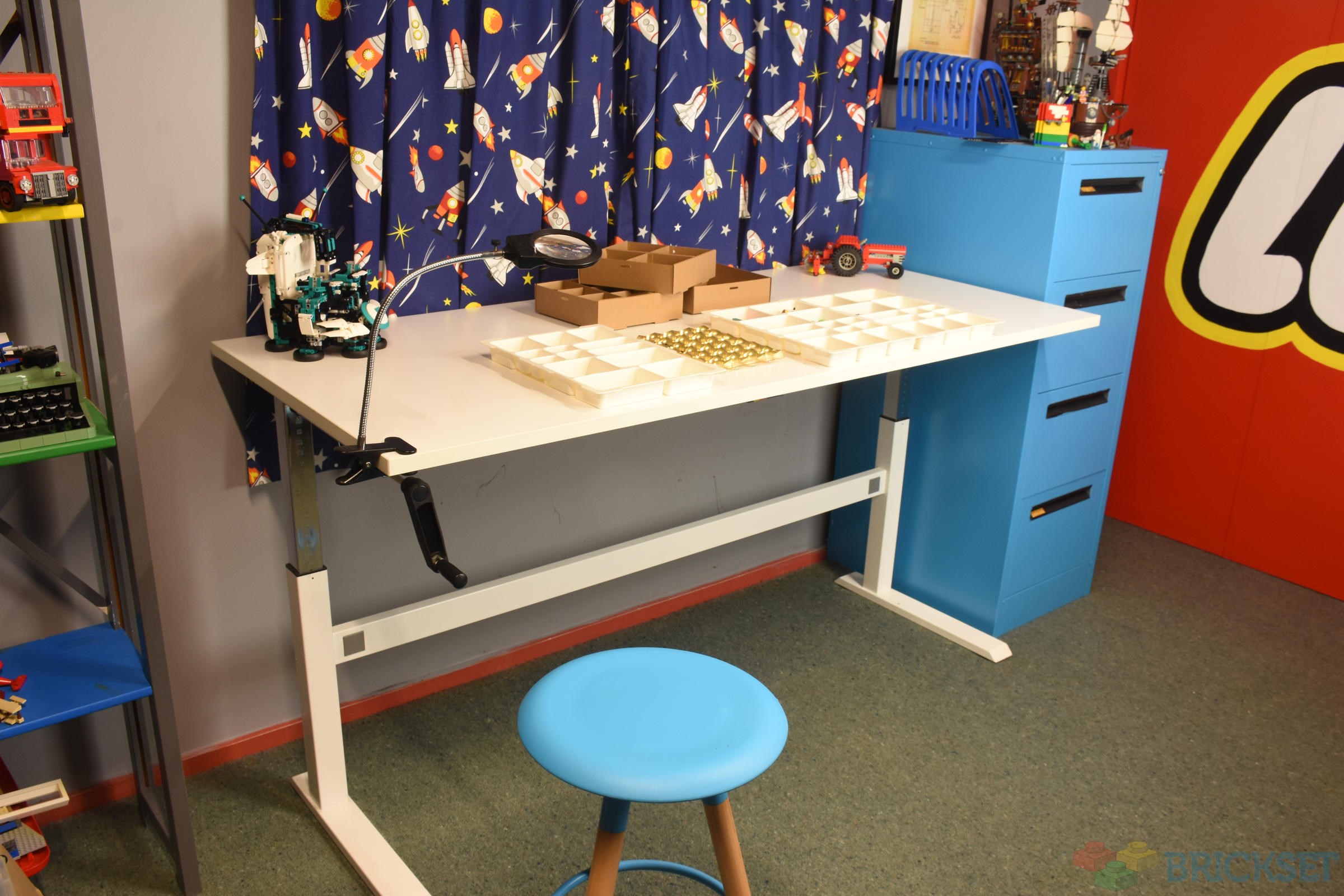 I own an adjustable work table that is behind a fold-out plastic table. You can see one of the two four-draw filing cabinets that I use for storing LEGO instructions.
