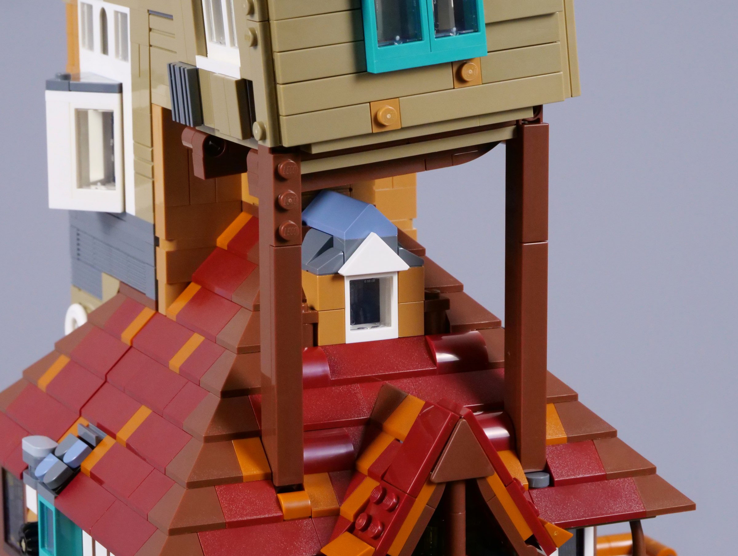 Technic beams support the upper levels of the house, recreating the wooden columns shown in the movies. Plates and tiles conceal the pin holes along these beams and their slightly differing heights are all that is needed to angle the structure on top, without affecting stability. However, there should be smaller braces behind these pillars, so it is a shame those are not included.