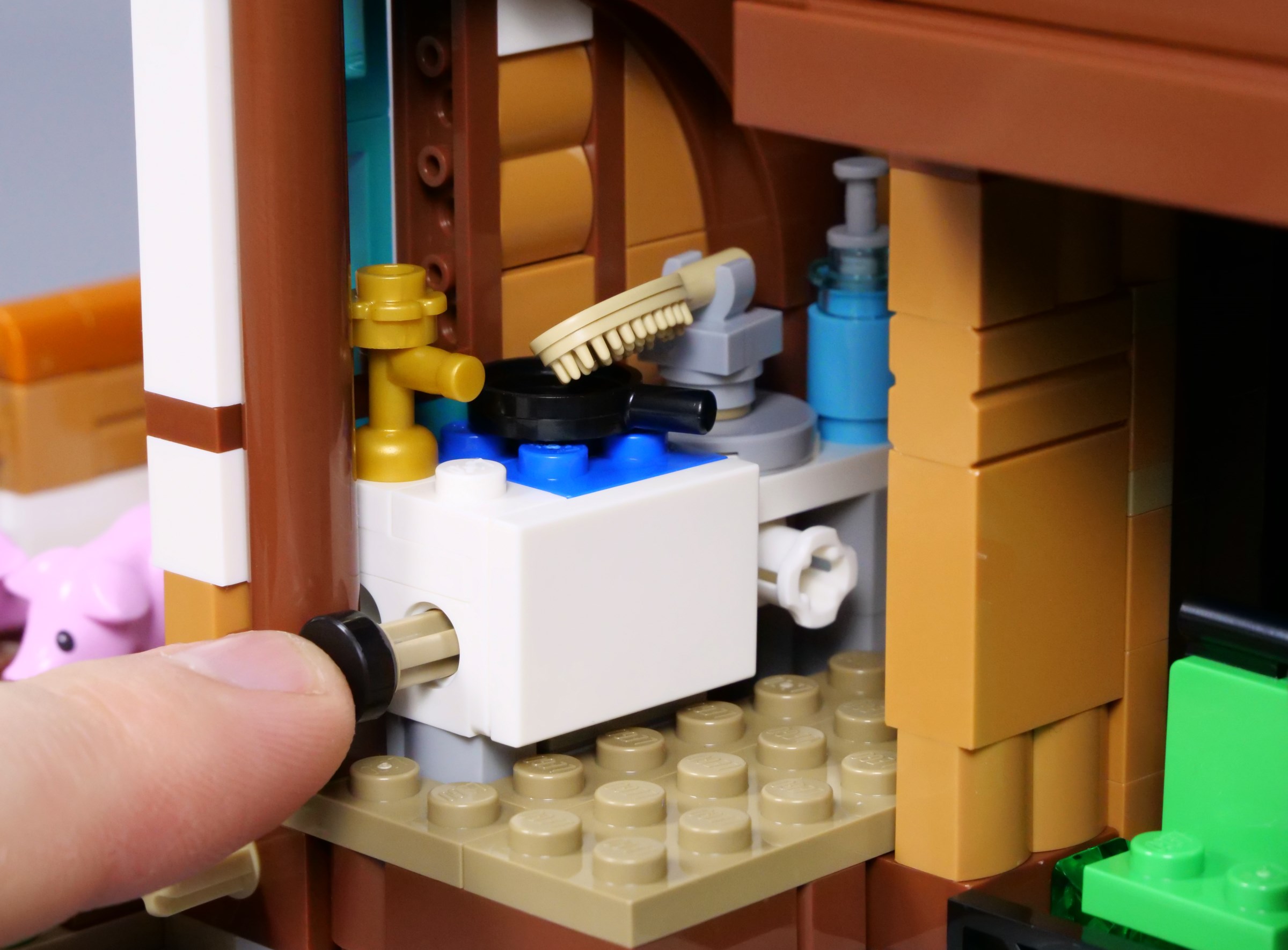 All sides of the house are similarly detailed, featuring the same combination of white, medium nougat and reddish brown parts. Even the hinges to open the building are disguised quite well, but the Technic gear between them looks out of place. This controls a function inside and could surely have been disguised somehow.
