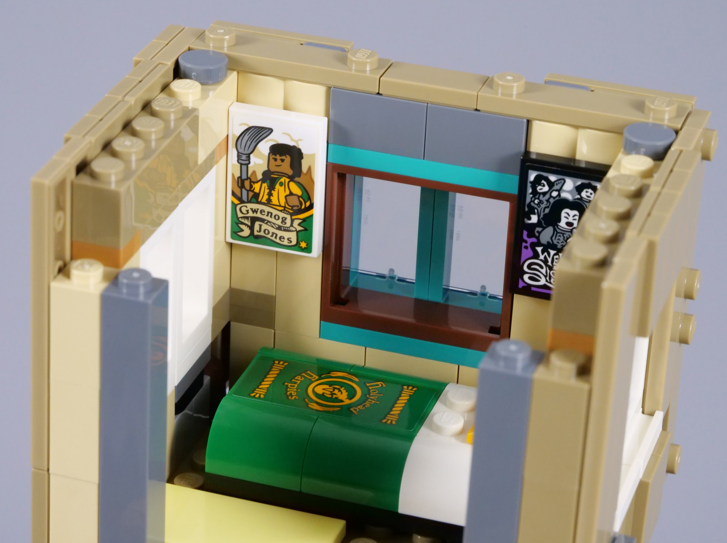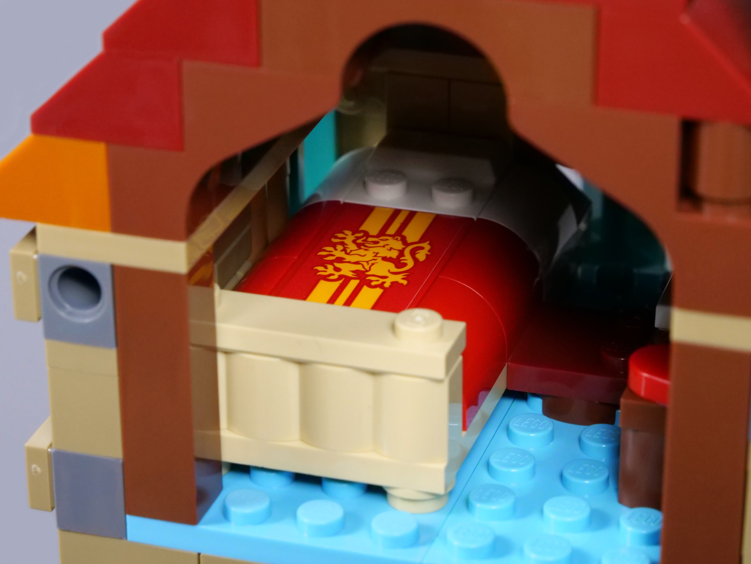Percy's bedroom occupies the top floor. This is another area that is difficult to access for play and should probably have included a detachable roof. The furnishings inside look good though. Percy's bedding is suitably decorated with Gryffindor's colours and rampant lion sigil, while the headboard incorporates 1x1 scroll bricks for detail.