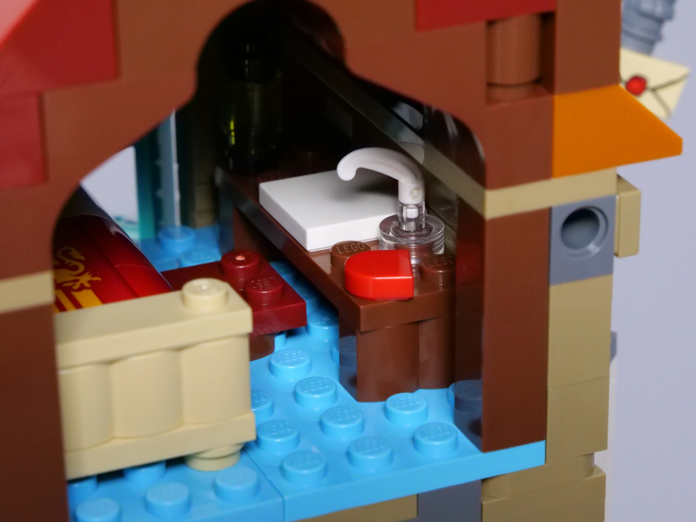 The fireplace is very prominent in the film, so I can understand prioritising this feature and the result is stunning. I love the silver cup of floo powder beside the fireplace and the mechanism inside is clever, comprising bright green parts to mirror the green flames seen when using floo powder. Even so, some more traditional green flames would have been a helpful alternative for display.