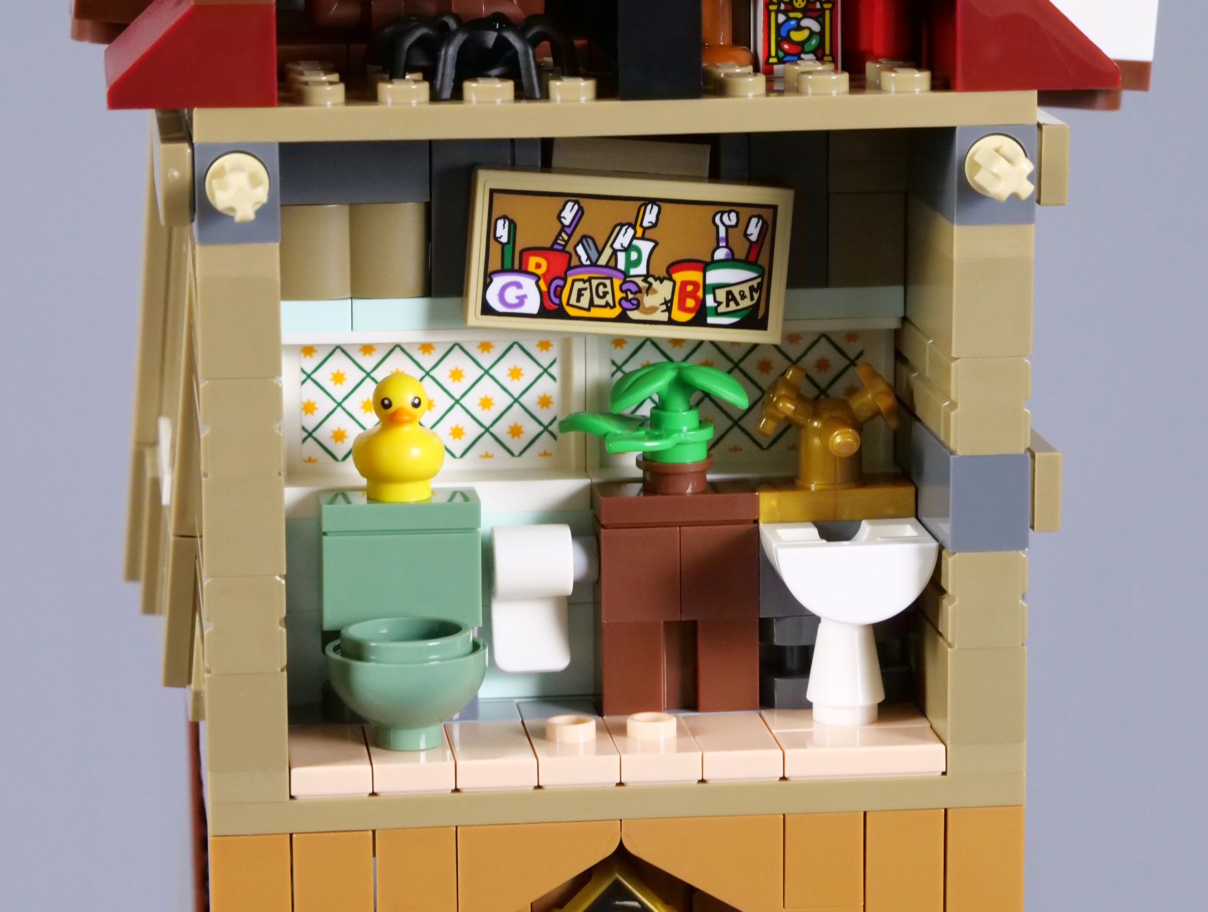 Returning to the other side of the Burrow, we find the family bathroom. This room is quite shallow to accommodate a second room behind it, but there is still plenty of detail, notably including a rubber duck, about which Arthur memorably ponders. I like the tiled floor too, as well as the stickered pattern on the wall.