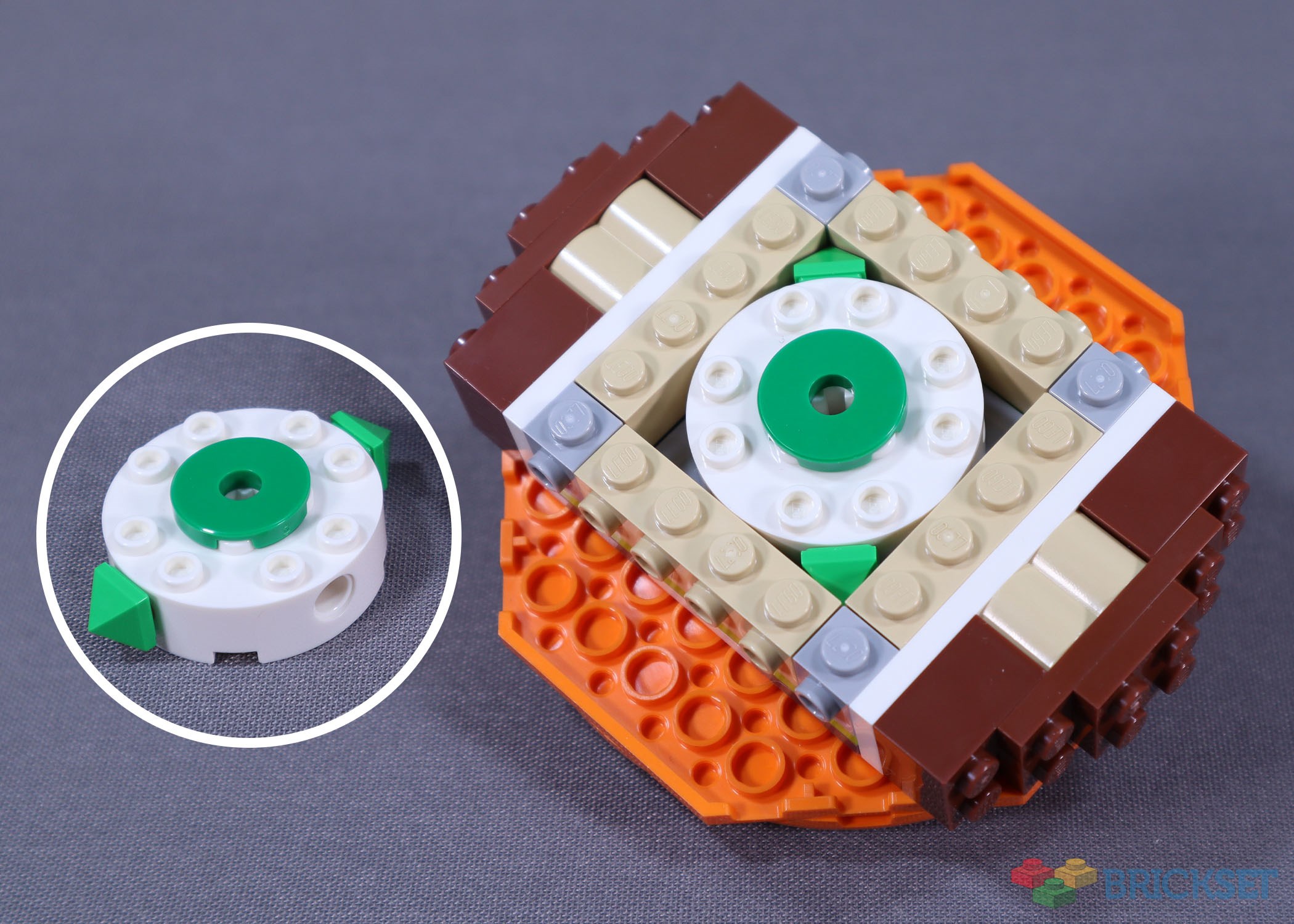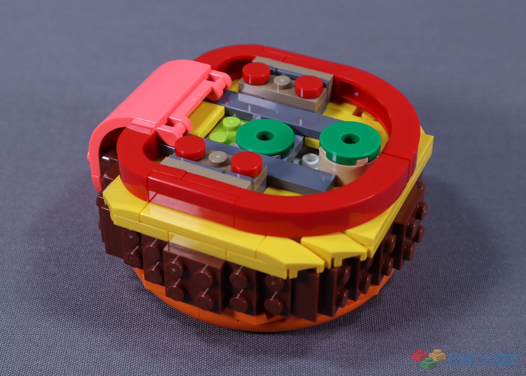 When looking at the completed model on the box, I thought I could imagine how each layer of the burger was assembled. To my amazement, the construction wasn’t as straightforward. The layers are held together with a 9M cross axle rather than a studs-on-top method. The 4x4 round brick held in place by 1x1 pyramids to ensure the correct angle for the axle to pass through was intriguing. For a 9+ set, it’s great to see LEGO introducing advanced techniques like this to young builders.