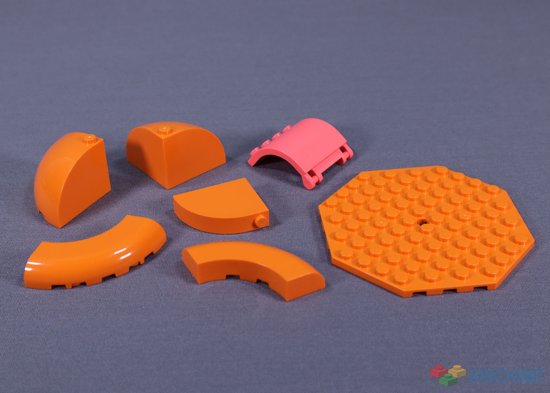 An exceptional number of new pieces were required to accurately represent the Durrr Burger. The 10x10 octagonal plate, 1/4 sphere, 5x5 arch brick, and curved slope, all appear for the first time in orange, and the curved panel for the first time in coral.