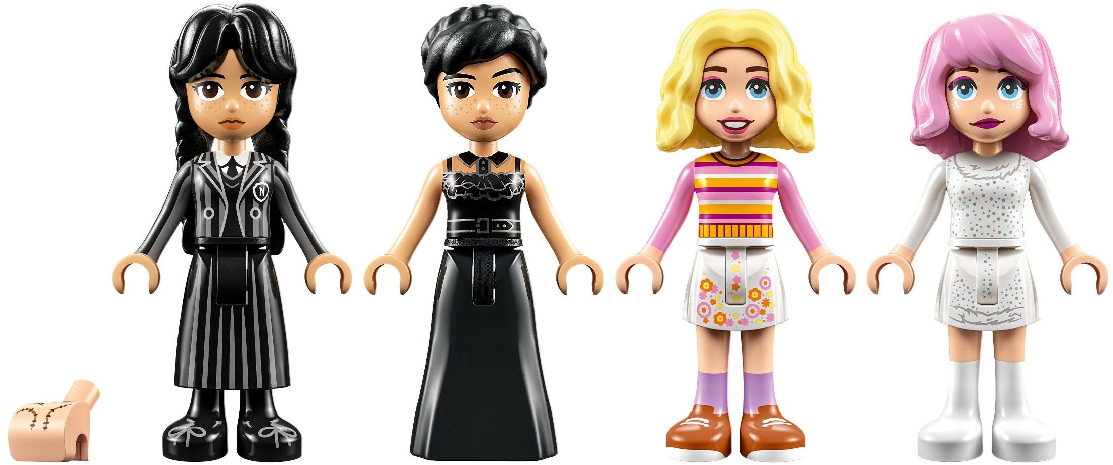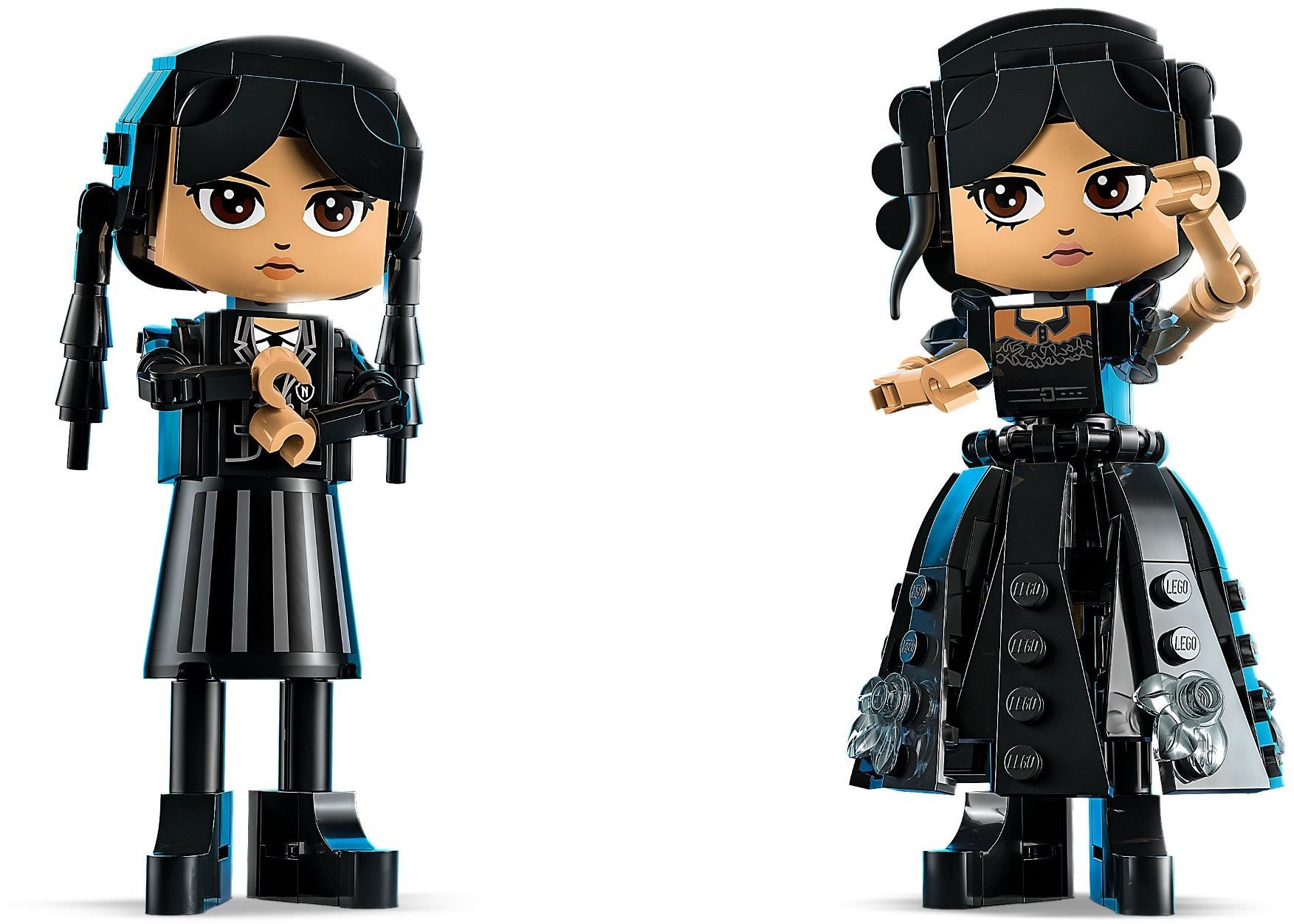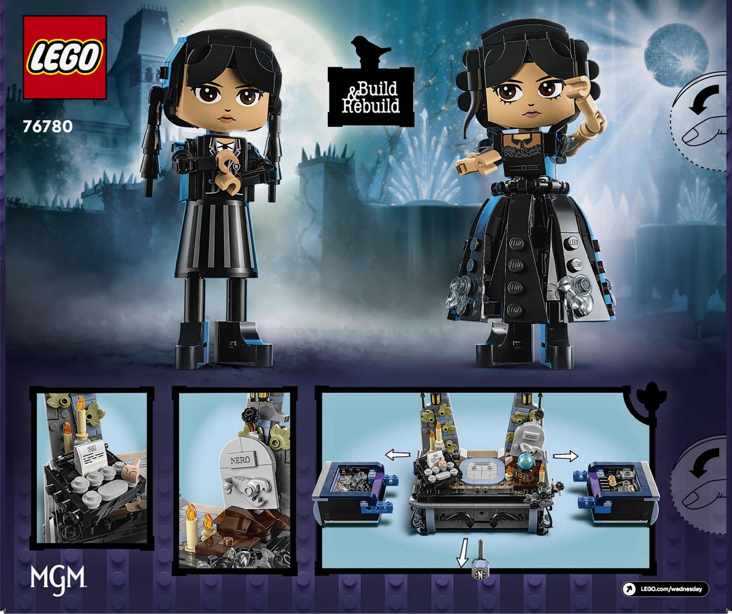 A 702-piece play set inspired by the TV series, suitable for ages 10+. It features two faces and outfits, allowing fans to recreate Wednesday with her deadpan gaze in her Nevermore Academy uniform or her kooky side-eye look and black dress from the Rave’N Dance scene. The set includes hidden compartments, the eerie Nevermore Academy gate, her typewriter, pet scorpion, Nero’s grave, black dahlia flowers and crystal ball. Also included in the set is a brand new, adapted LEGO element for a hand, printed with all the iconic scars, to impersonate Thing.