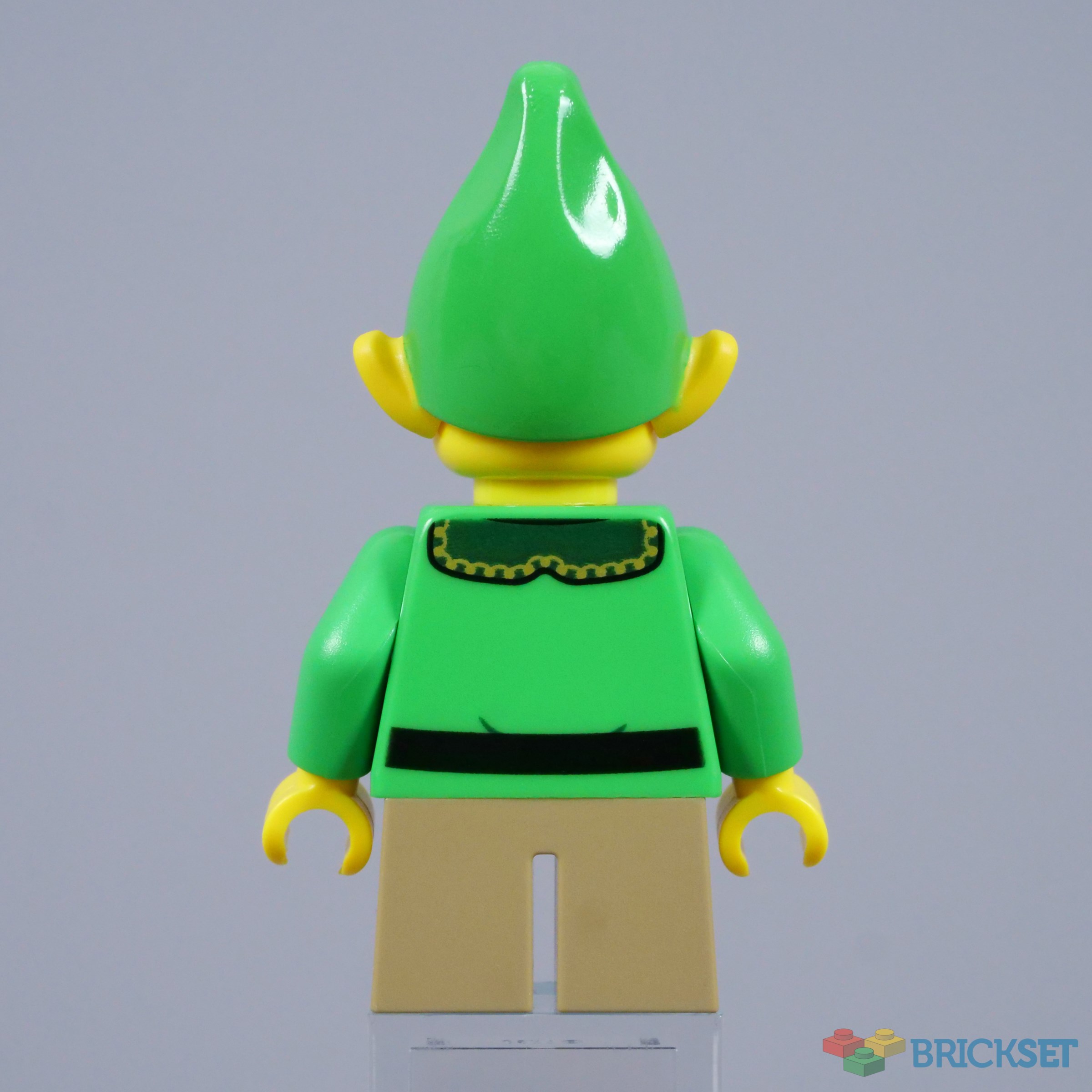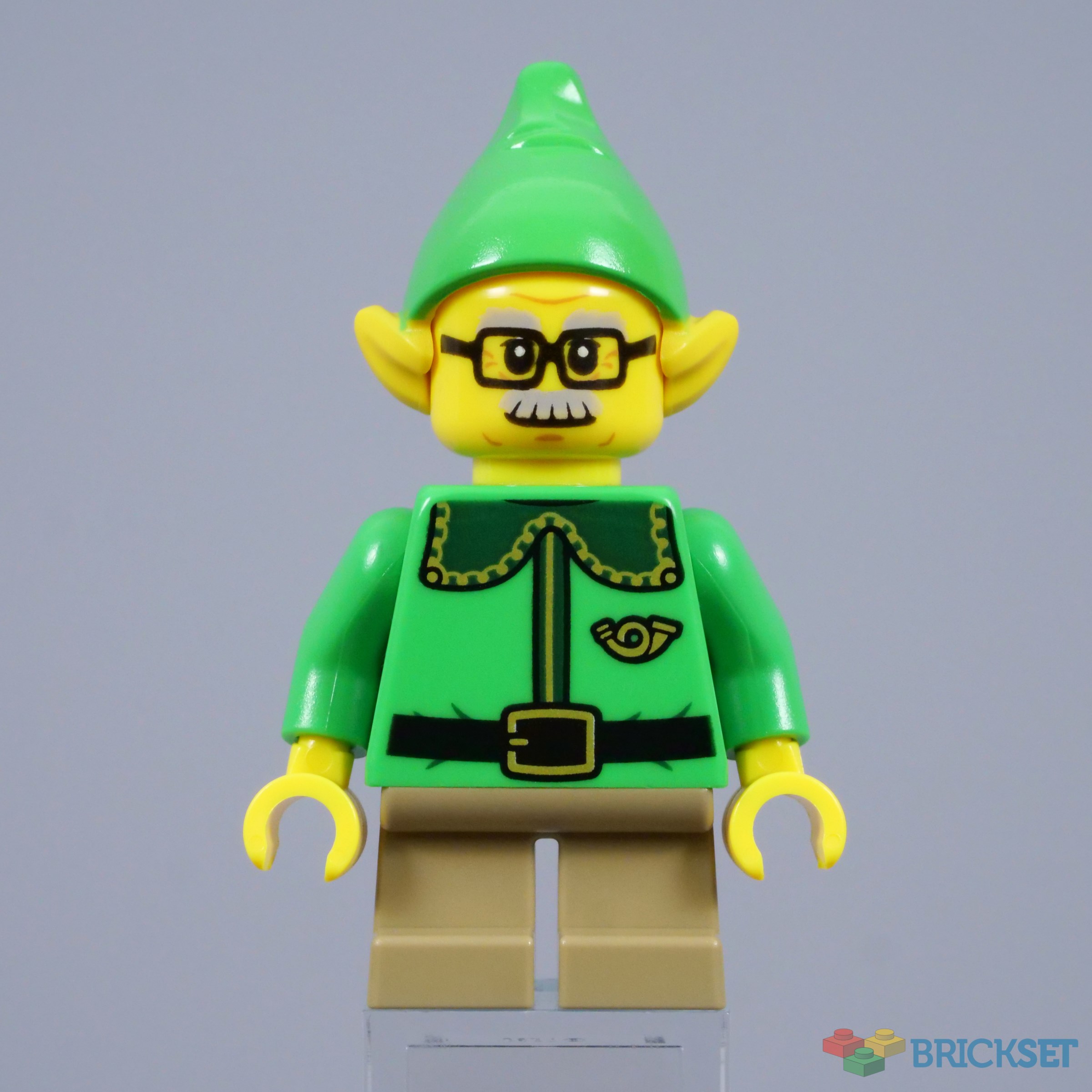 This driver wears the same uniform as the elves working at the post office, albeit with dark tan legs instead of green. The combined hat and ear component is identical though, also matching the elves in 10275 Elf Club House. A moustachioed head completes the figure, so this character looks a little older than his colleagues in 10339 Santa's Post Office.