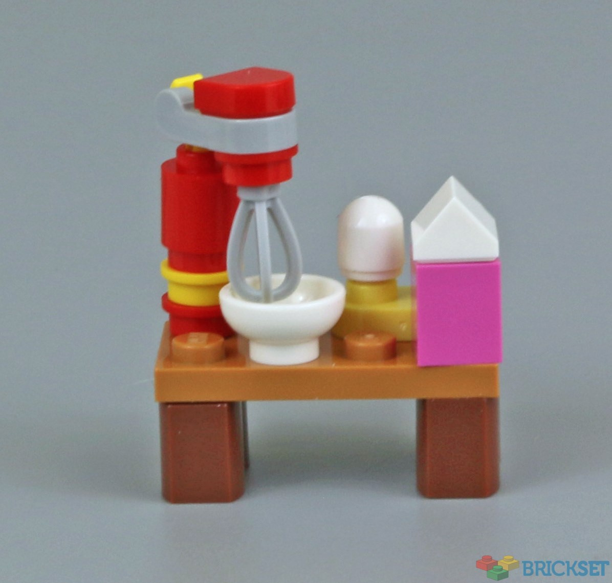 Today is another nice build, showing a standard holiday activity - making cookies! There's a table, with a stand mixer along with two ingredients - eggs and (perhaps) sugar? (I'm assuming not milk because the 1x1 brick isn't blue)