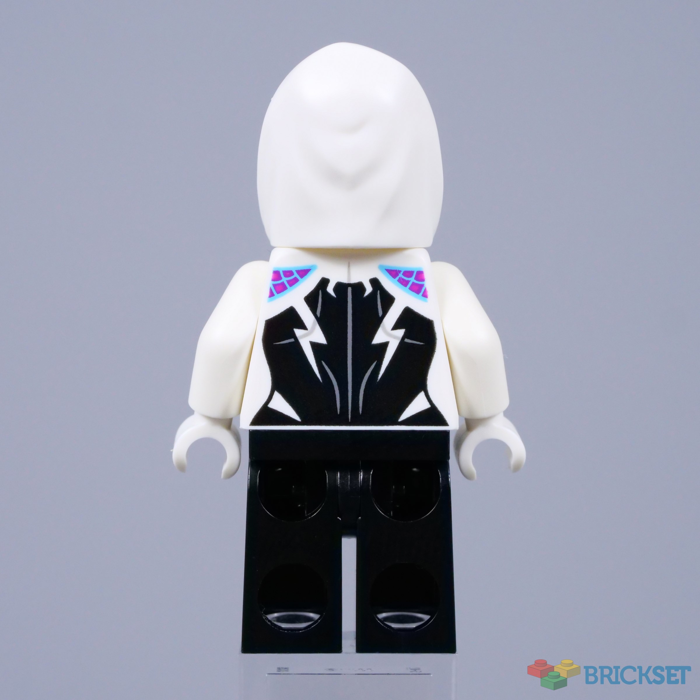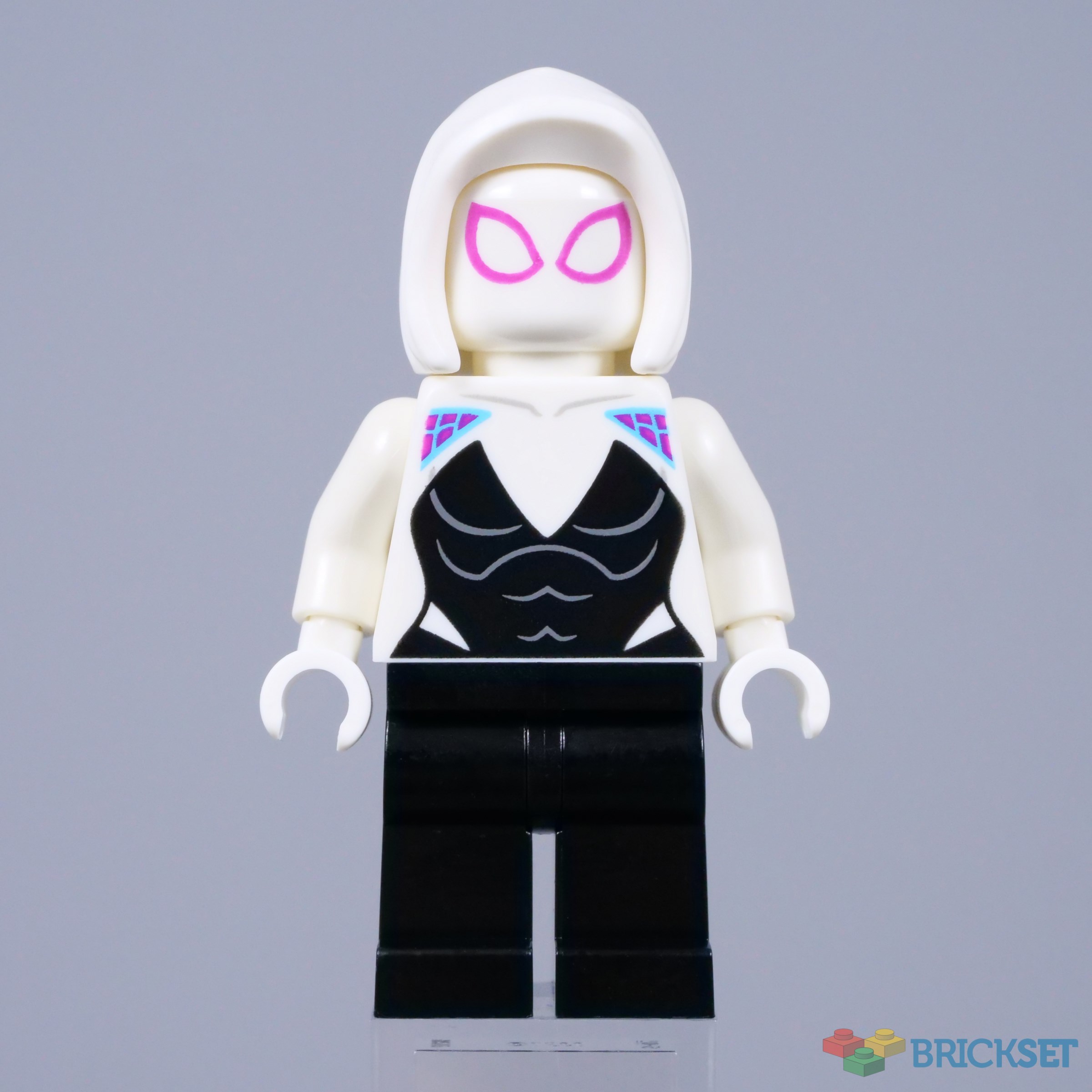 As always, I like the magenta accents on her torso and Gwen's pink eyes look perfect beneath the hood. However, it would be nice to see a second pair of more expressive eyes on the other side, since they will be hidden by the hood. Technically, the inside of the hood should be pink as well, but I am not sure how that could be achieved.