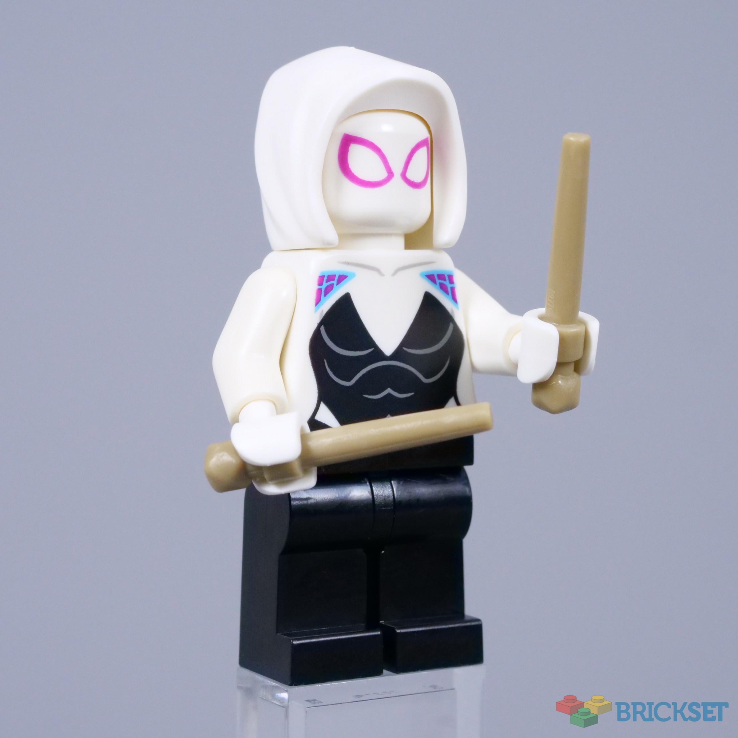 "The minifigure comes with a pair of dark tan wands, representing drumsticks. Gwen is shown to be a keen drummer in Spider-Man: Across the Spider-Verse, so I think these are a fun choice of accessory."