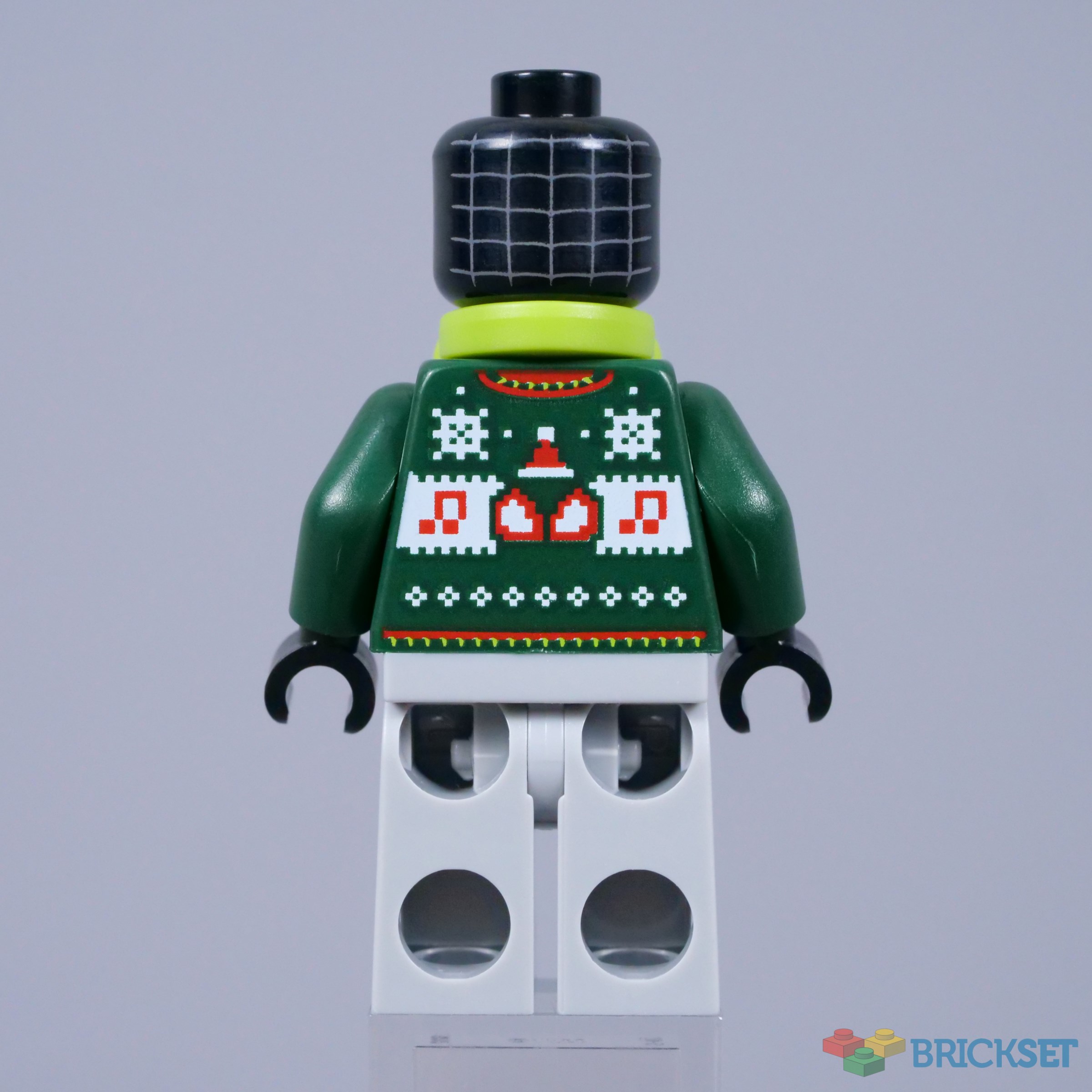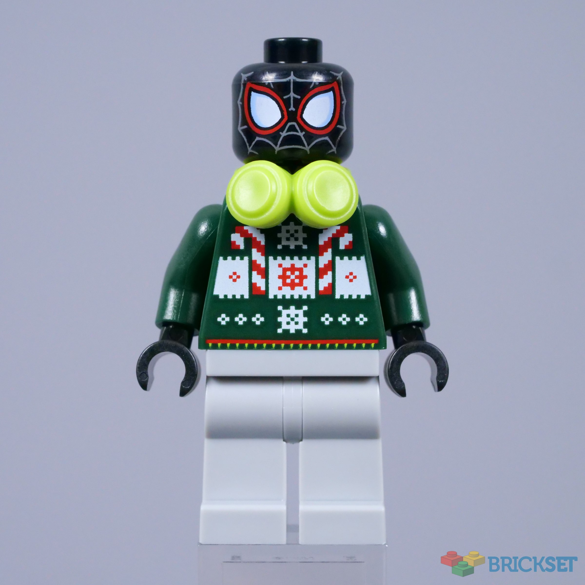 Our first exclusive minifigure is definitely a welcome change of pace, as Miles Morales arrives with a festive jumper! The knitted web designs on this jumper are quite abstract because of the stylised printing, but they are thematically appropriate. The eyes on the back are similar, topped with a Santa hat to create the impression of a silhouetted face.