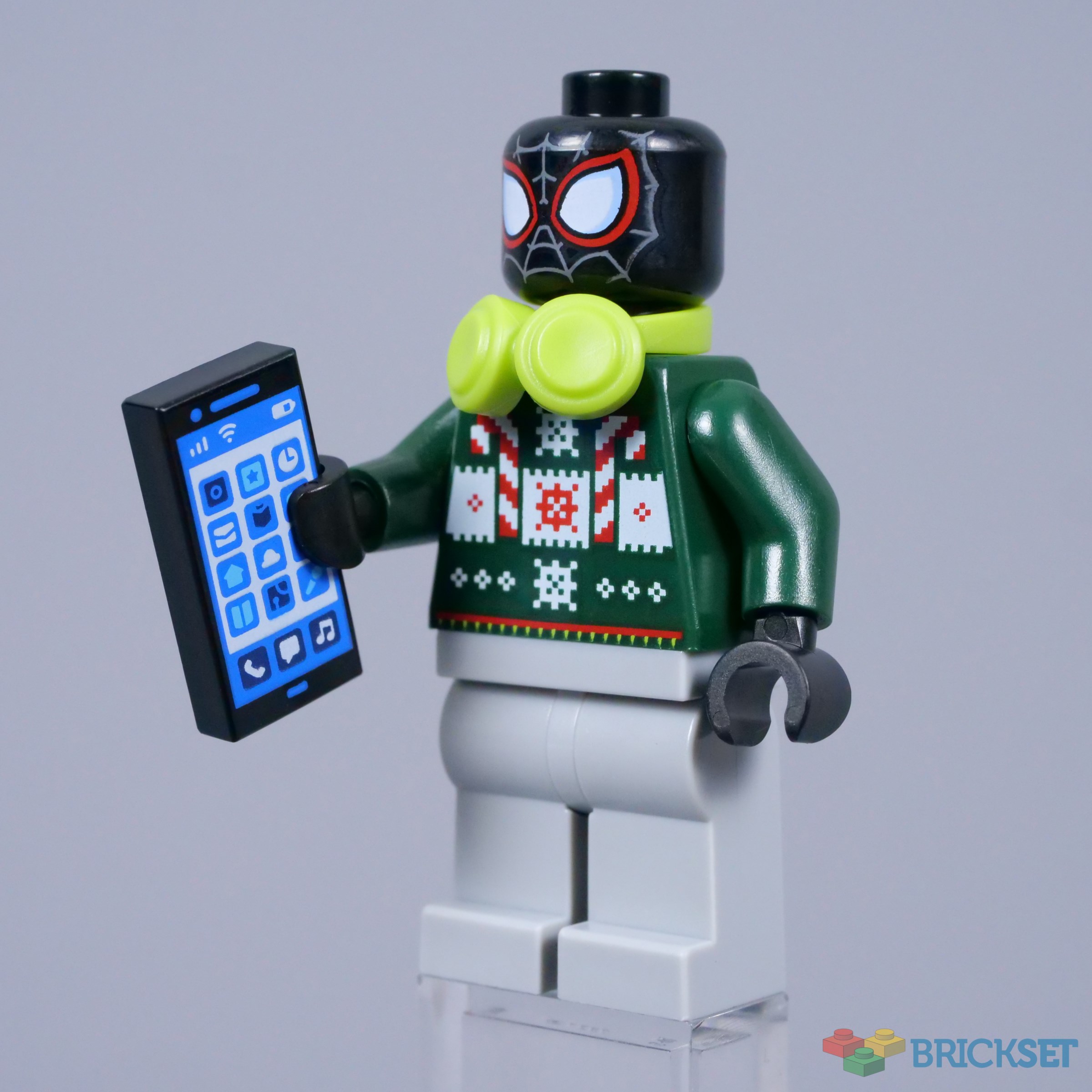 However, I do like Miles' printed mobile phone. This is a common element, but it complements the headphones and the musical notes on the back of the jumper. Of course, a unique tile with something specific to Miles Morales would be even better.