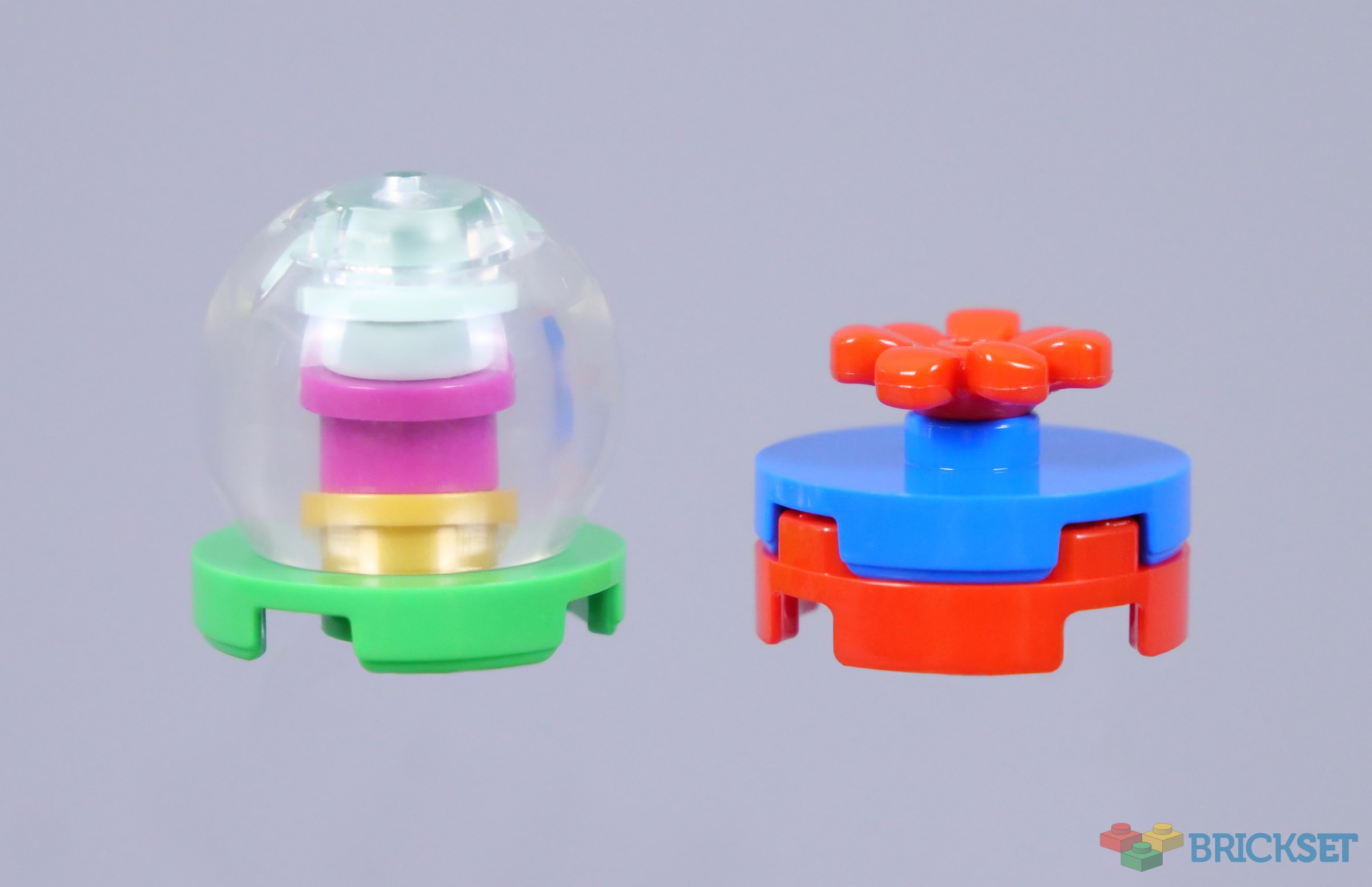 We do indeed find a gift wrapped in Spider-Man's colours with a Mysterio-themed snow globe. The latter is a clever idea and I like how Mysterio himself is represented by stacked 1x1 round plates inside, although the villain's costume is quite abstract at this scale. Fortunately, the trans-clear sphere helps for context, usually worn as Mysterio's helmet.