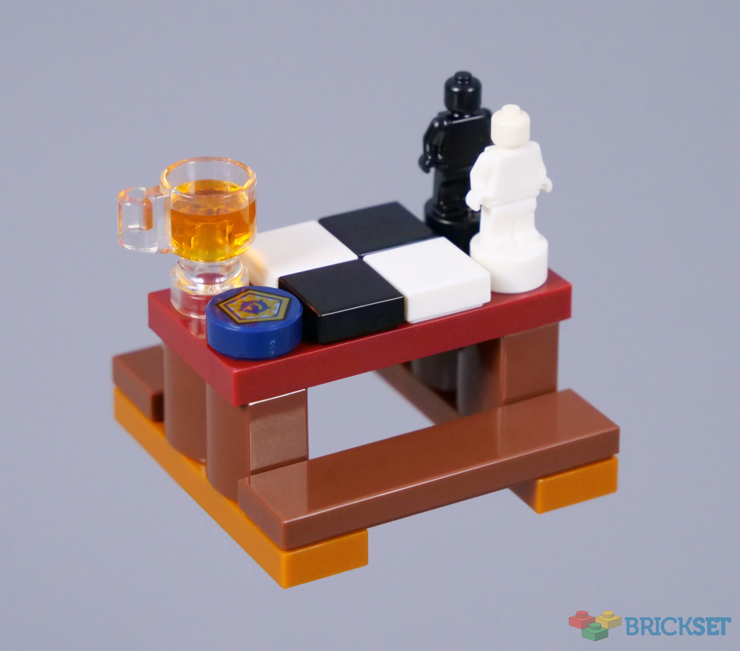 Just as the Gryffindor statue was followed by Hufflepuff's dining table last week, so the Gryffindor table arrives after Hufflepuff's statue. The dark red tablecloth looks great, but far more interesting are the accessories on top, including a chessboard with two chess pieces, a decorated chocolate frog box and a glass of butterbeer. The chessboard is particularly fitting, as we see Harry and Ron playing Wizard's Chess shortly before Christmas in The Philosopher's Stone.