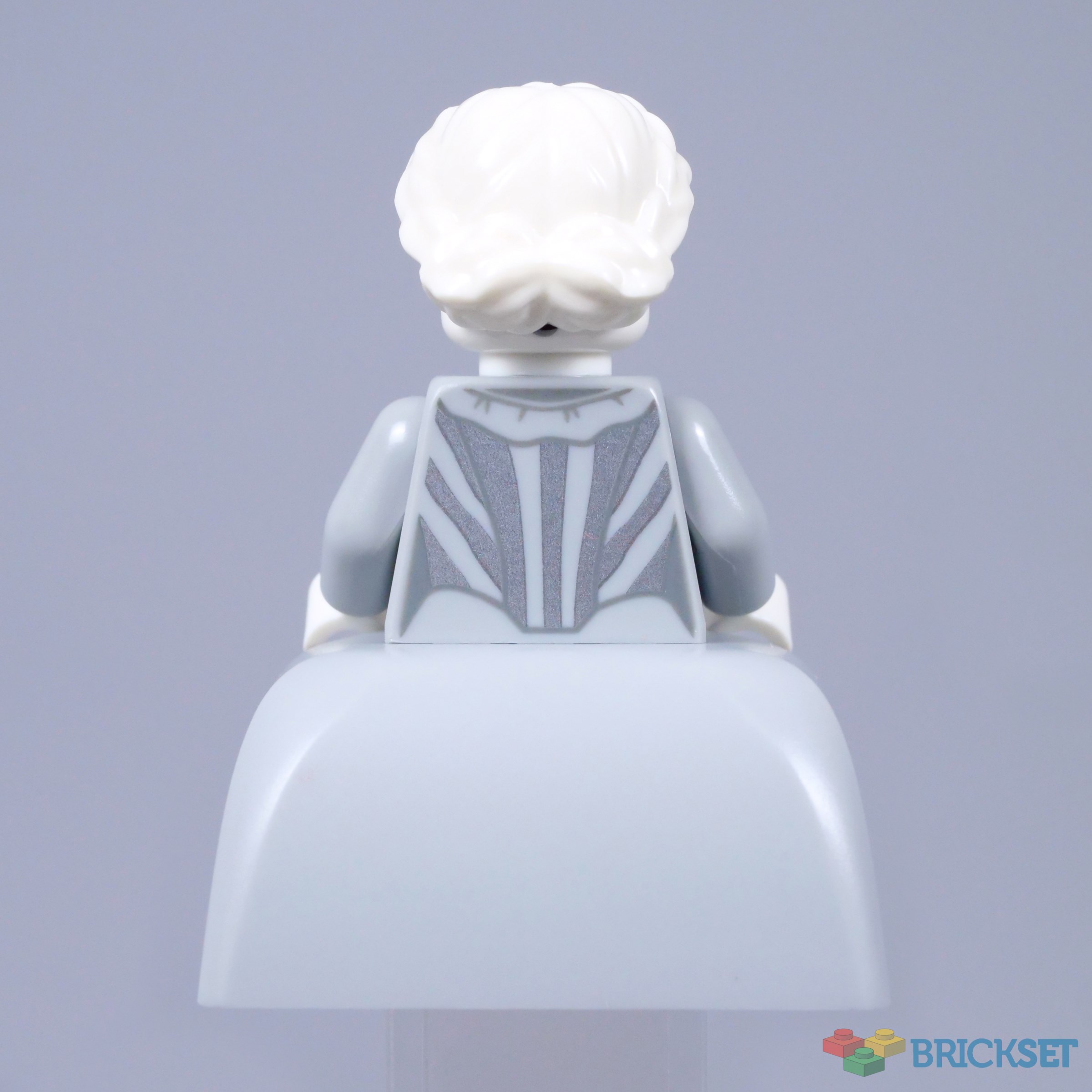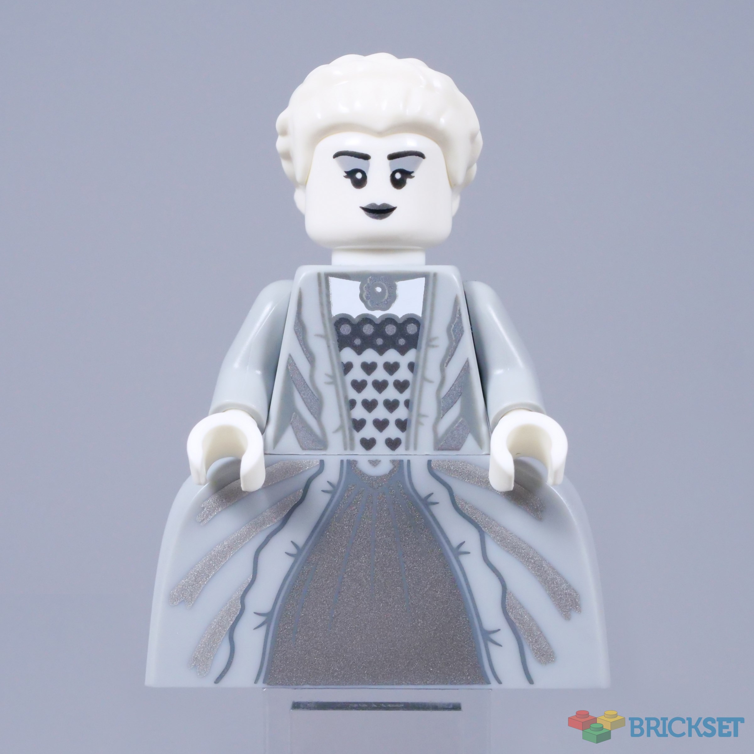 The colour combination of light bluish grey, metallic silver and white matches other ghosts from recent Harry Potter sets, such as the Fat Friar in 76435 Hogwarts Castle: The Great Hall. Their consistent style is effective and this ghost in particular is beautifully detailed, with rows of hearts on her bodice and even a little necklace.
