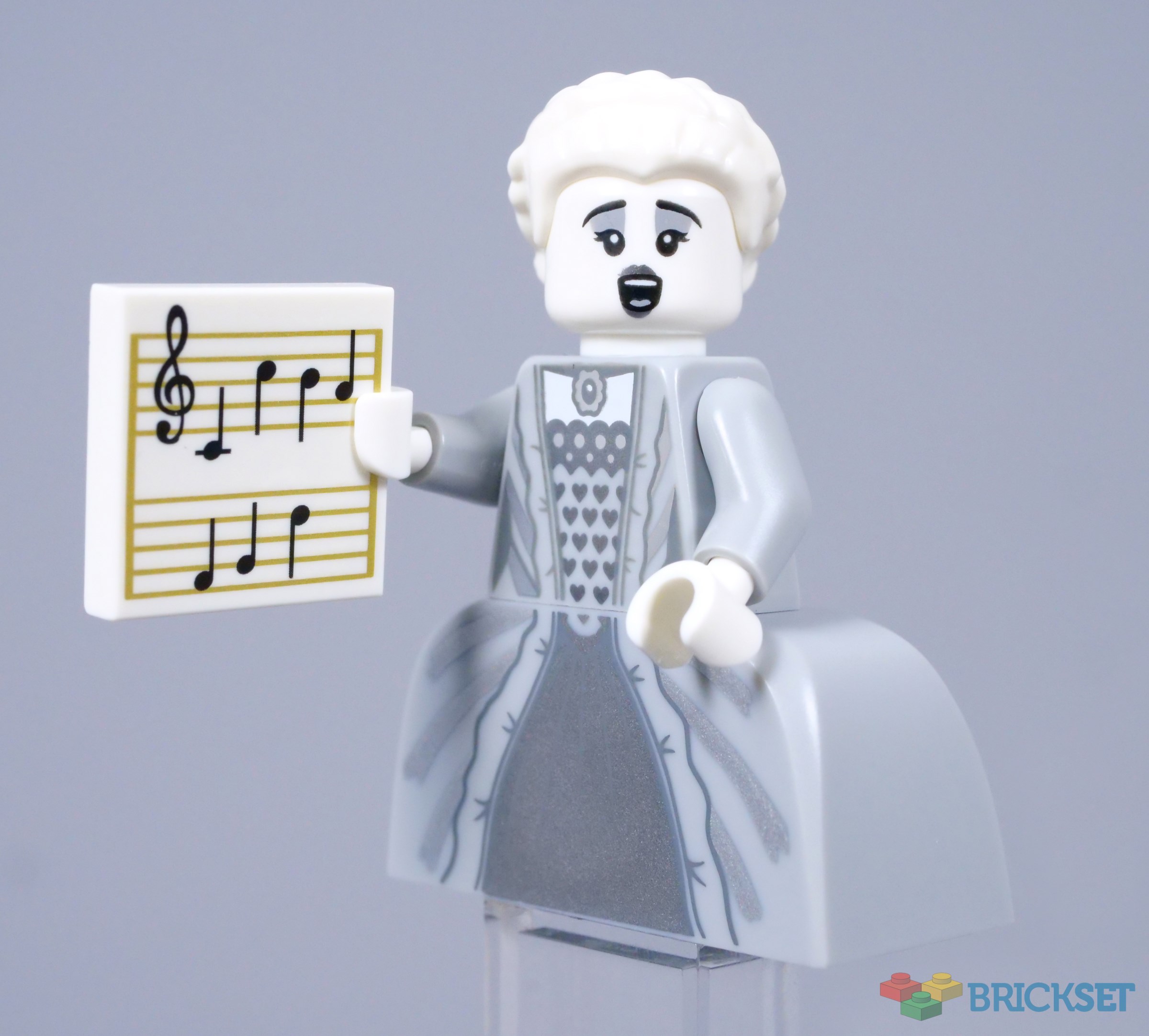 The minifigure features an appropriate double-sided head as well, with a demure smile on one side and a singing expression on the other. Even the hair piece is well chosen, likely based on the most distant of the ghosts shown above. A decorated sheet music tile completes the figure, found normally in Friends and Disney sets.
