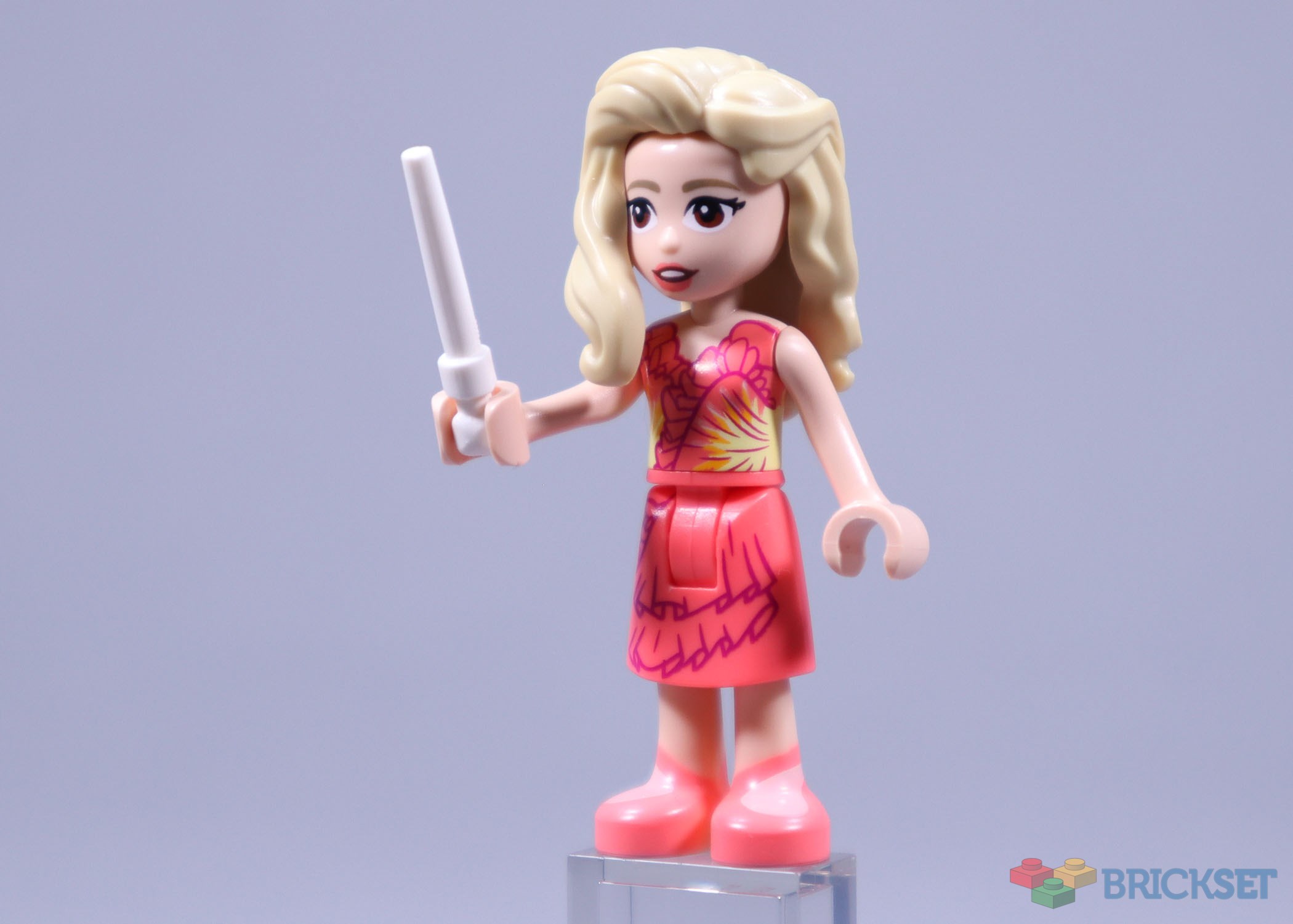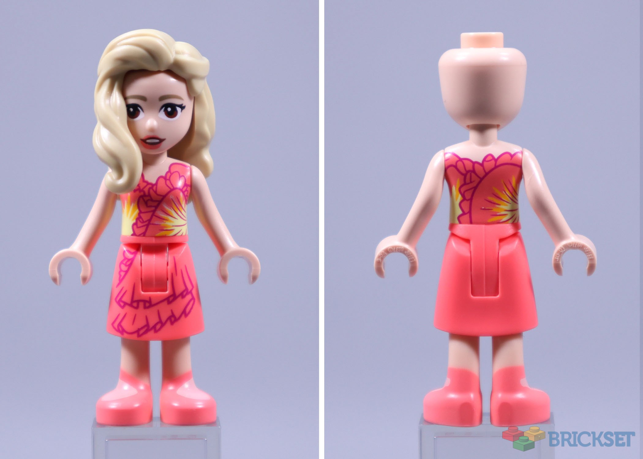 Coral is a good match for the colour of the dress, and because the other elements are well represented the slightly flat frills of her skirt aren’t a problem. The printing also captures the angled straps of her shoes.