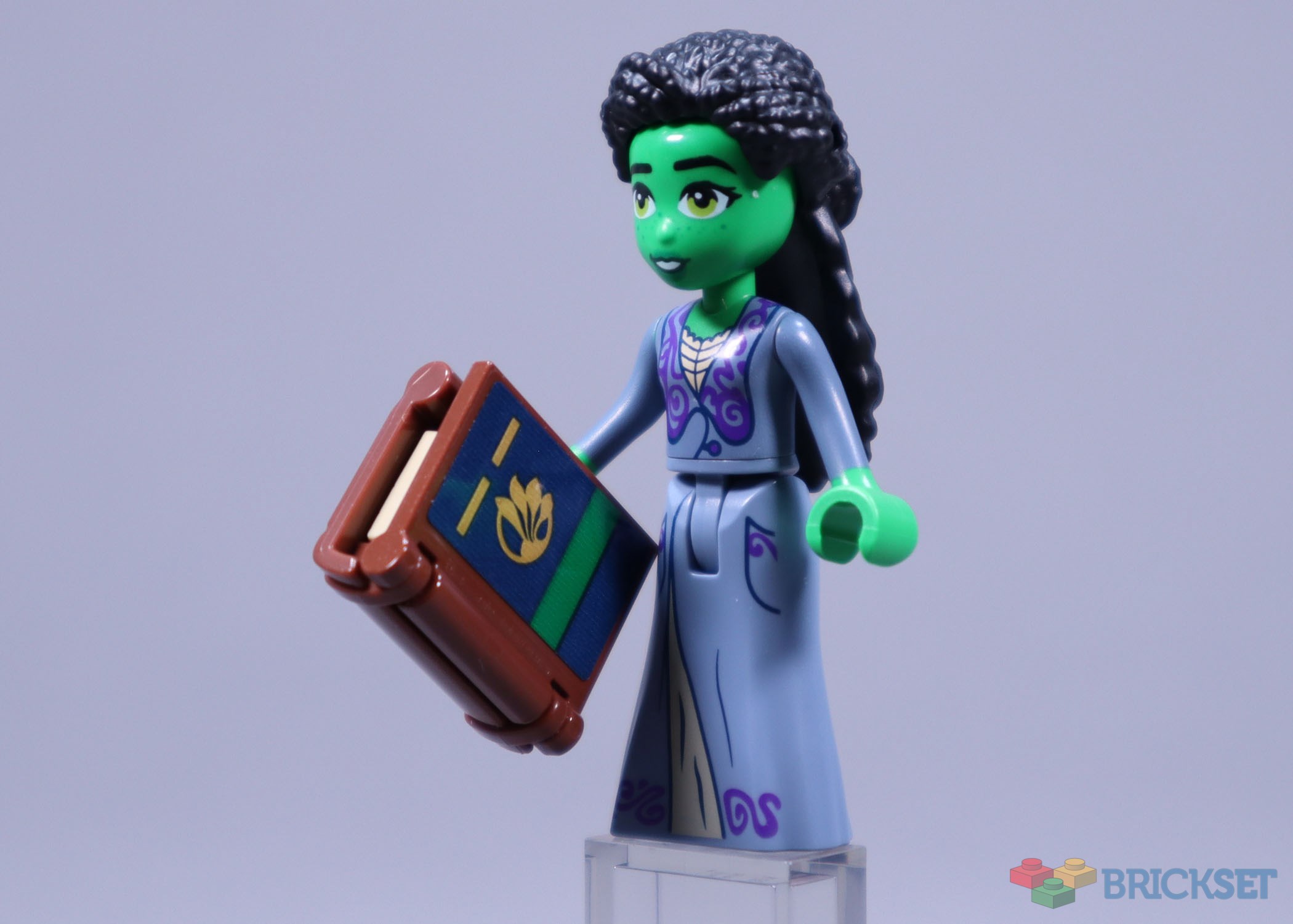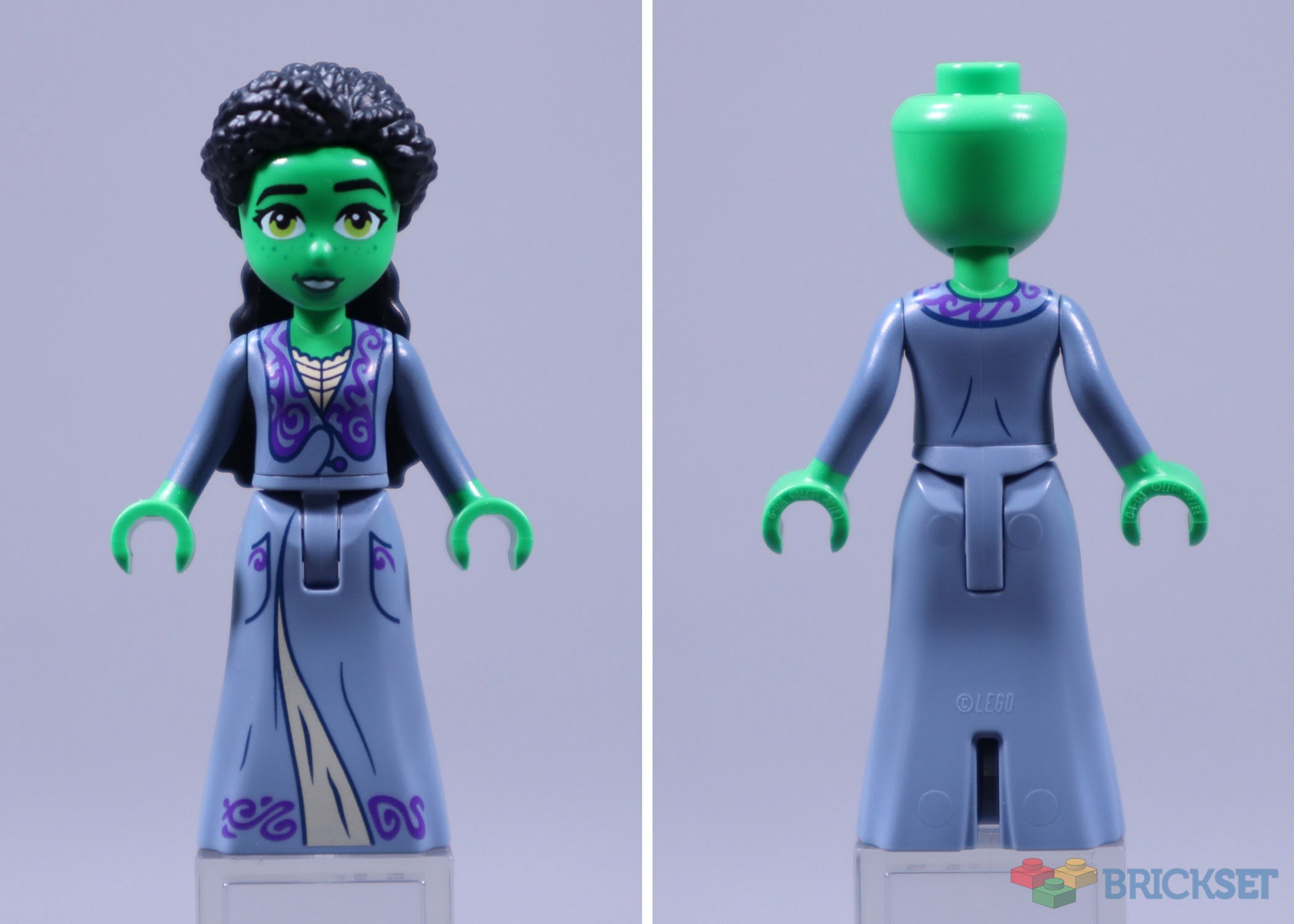 Elphaba’s nightwear is much better suited to this minidoll skirt mould. The subtle glimpse of her off-white pyjamas under the long dressing gown could be brighter, as is usually the case for light-on-dark printing, but the torso has much better opacity on the arm printing than we saw in 75681 Glinda, Elphaba & Nessarose at Shiz University. The printing of this unique clothing is highly accurate.