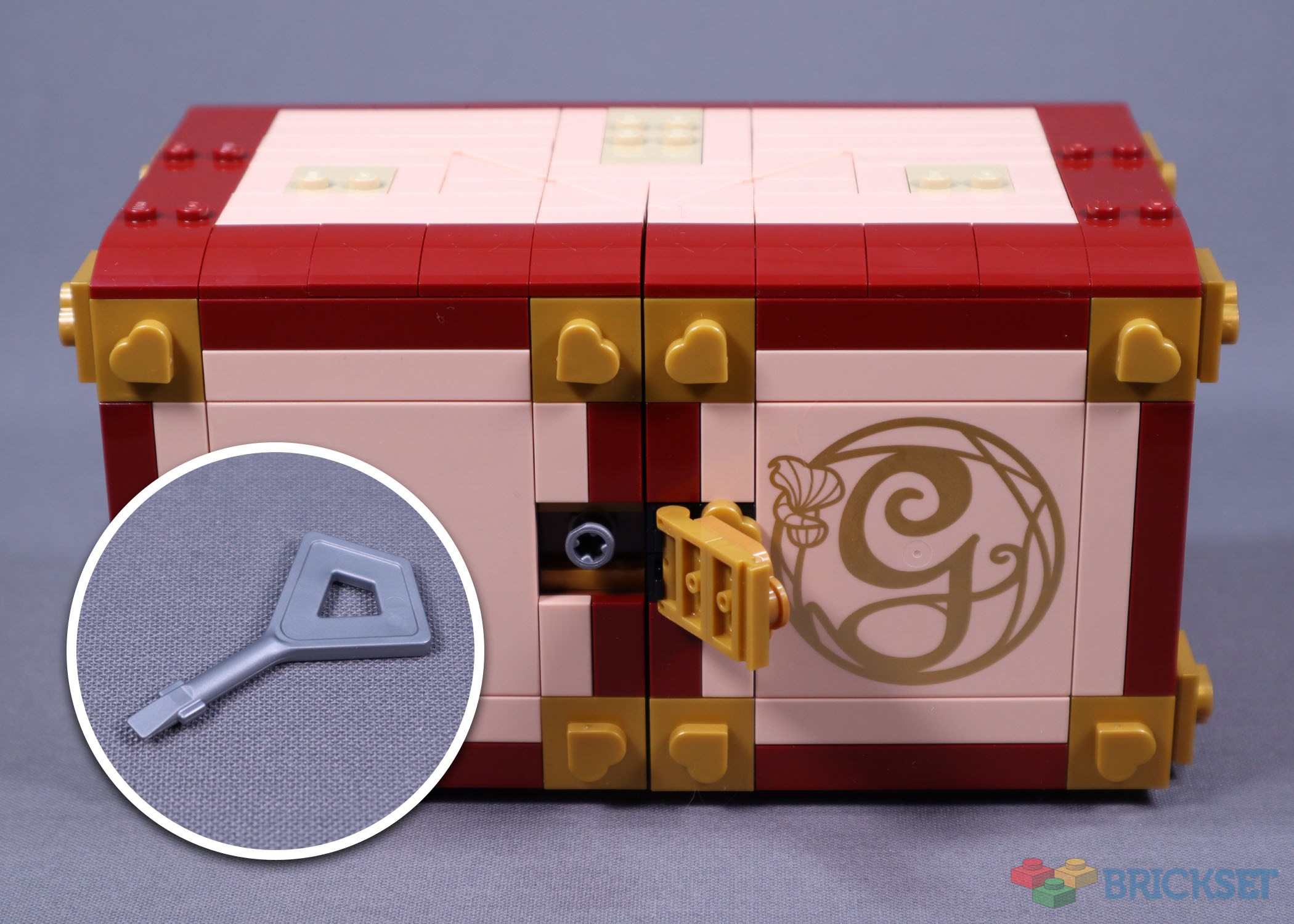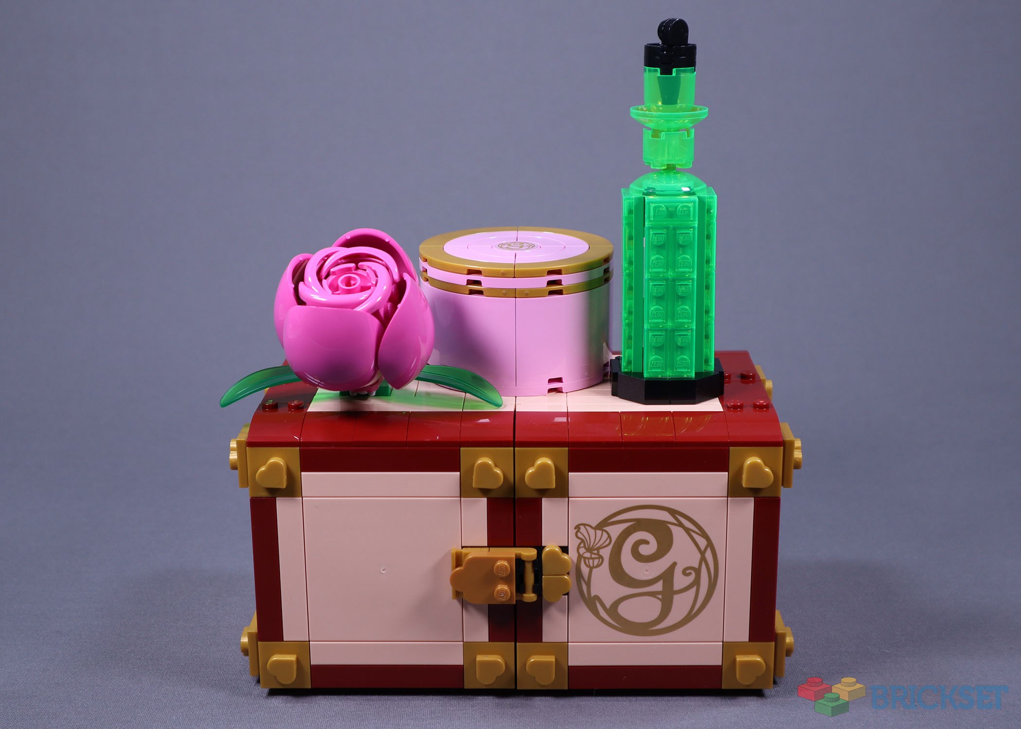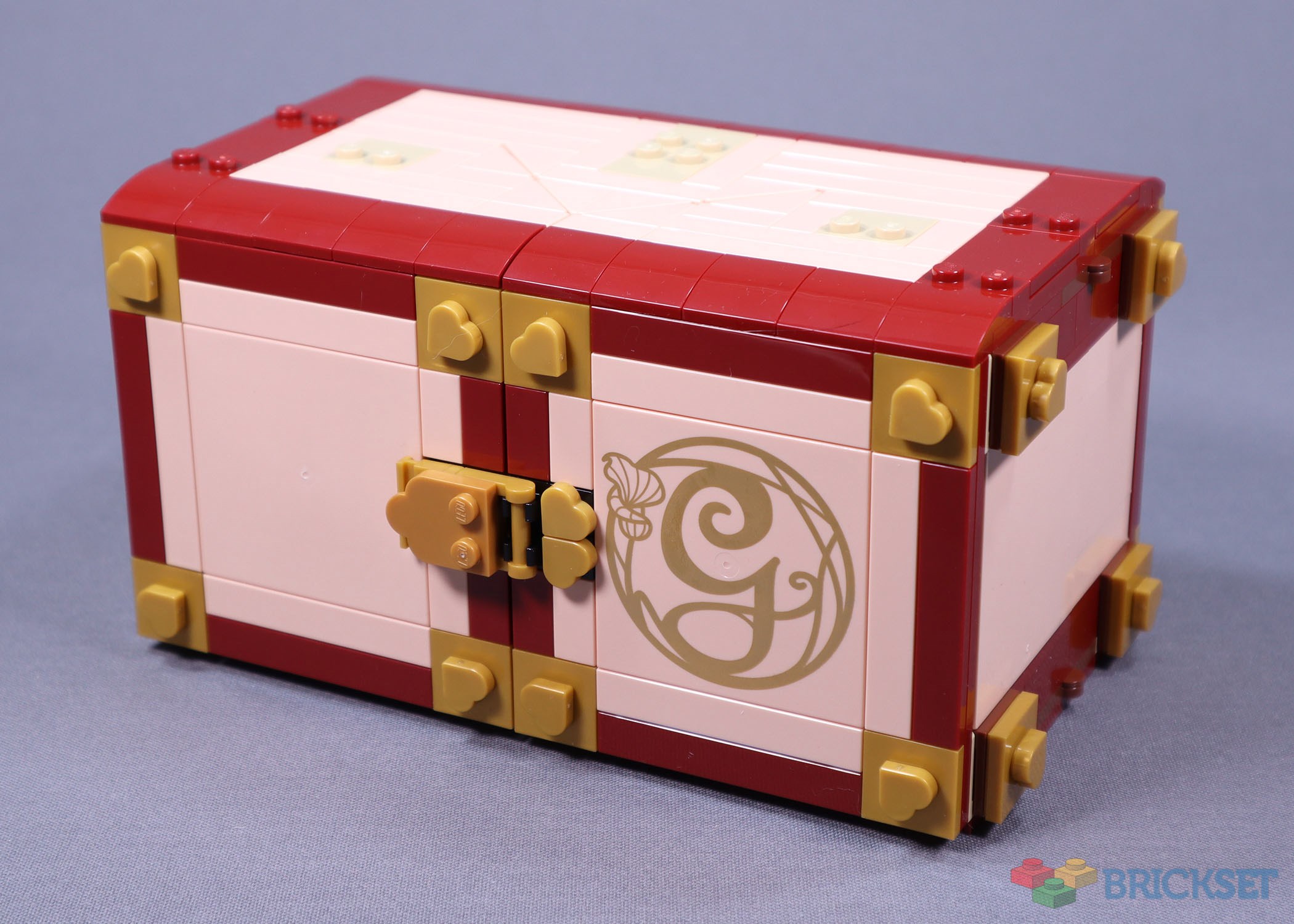 The completed model is a neatly enclosed box, with three detachable decorative objects on top. Immediately visible on the box’s exterior is the large elaborately printed ‘G’ tile, and a generous range of light nougat parts.