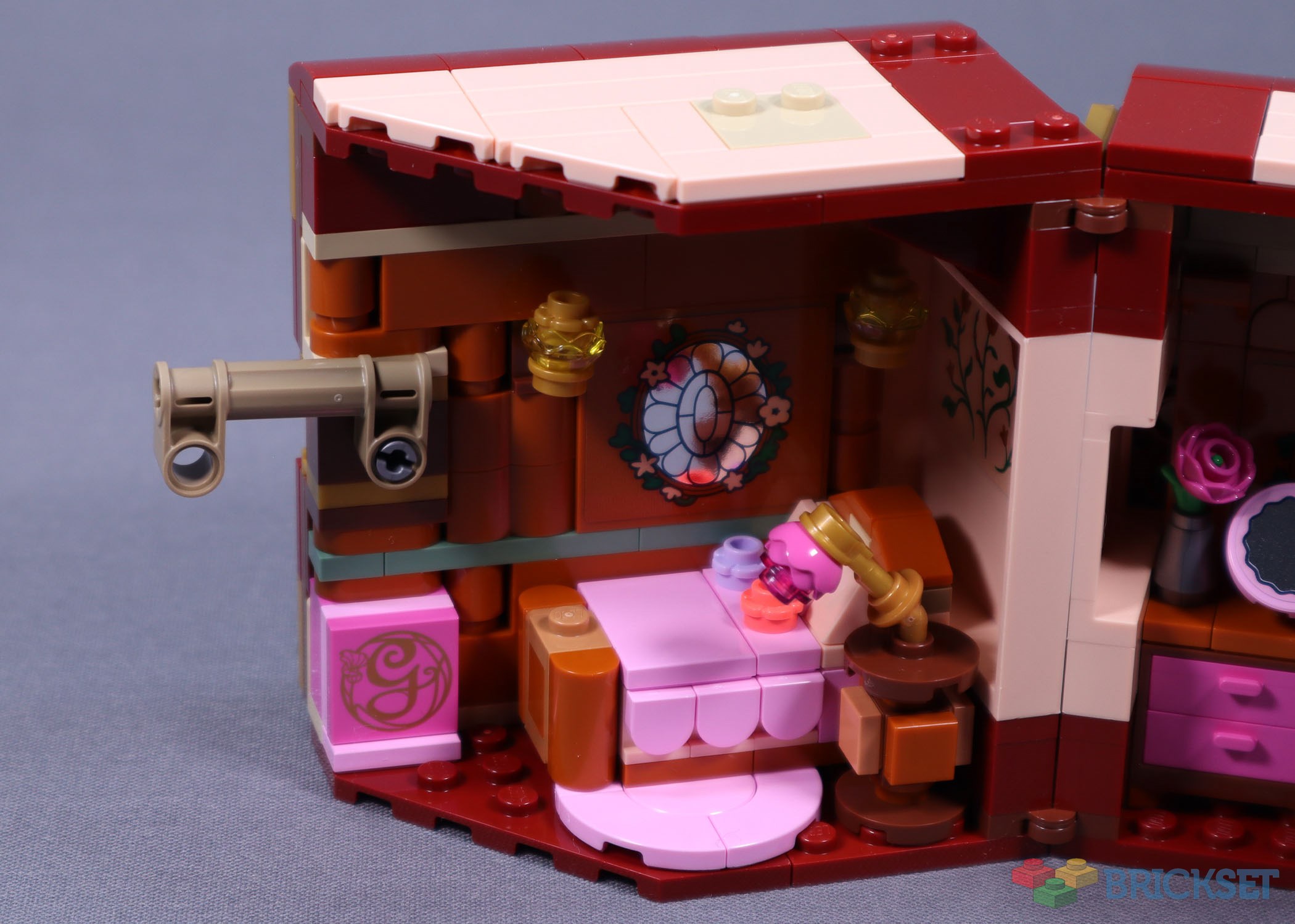 On Glinda’s side of the room, aside from the obvious pink bed, our eyes are drawn to the fantastic use of the new rose piece in transparent yellow as intricate Tiffany-style glass lamps or sconces. It’s also used in dark pink as a frilly lampshade for her bedside lamp, angled nicely on the minifigure posing element—new this year in pearl gold.
