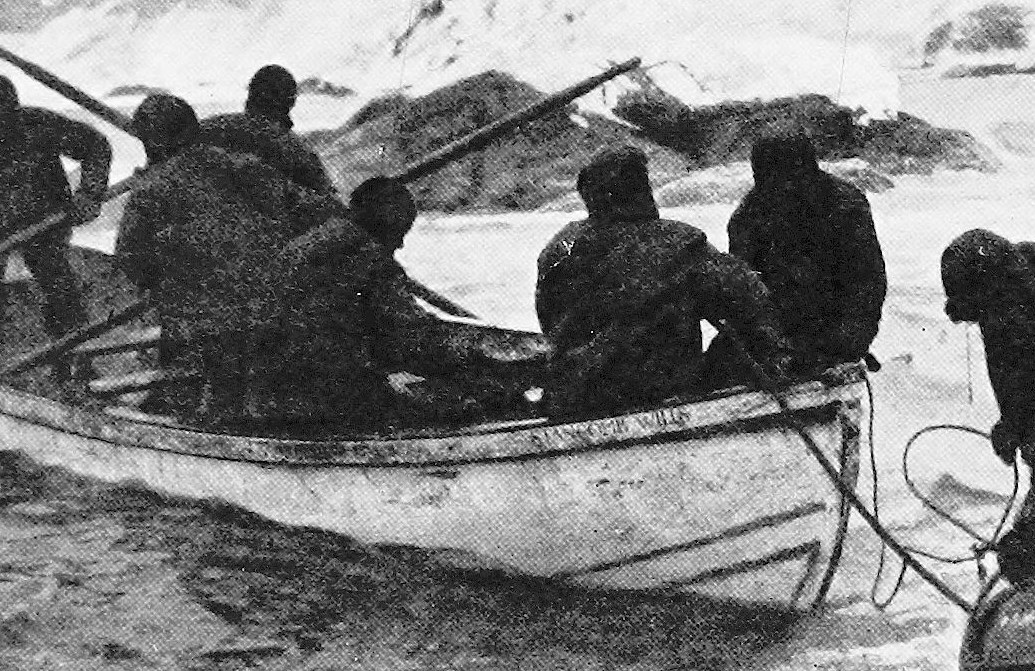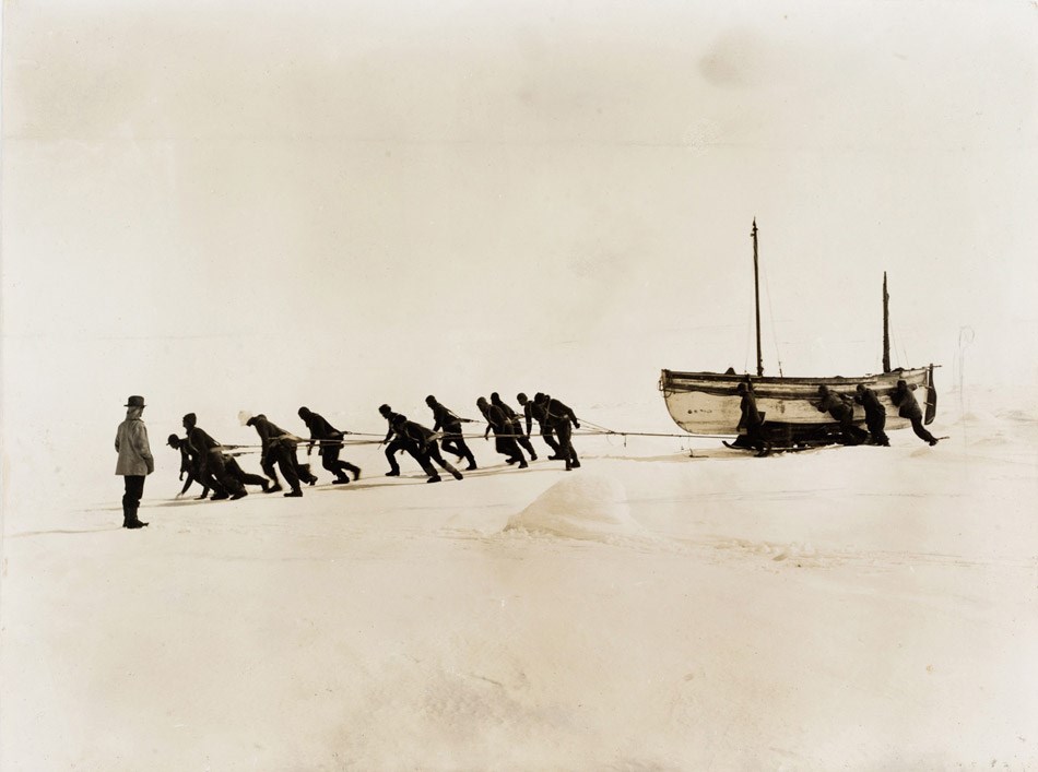 The boats, drawn by fifteen men harnessed in traces under Worsley's command, were the last. It was killing toil. Because of their weight, the boats sank into the soft surface of the snow. To move them, the men in the traces had to strain forward, at times leaning nearly parallel with the ground, and the whole operation was more like ploughing through snow than sledging.