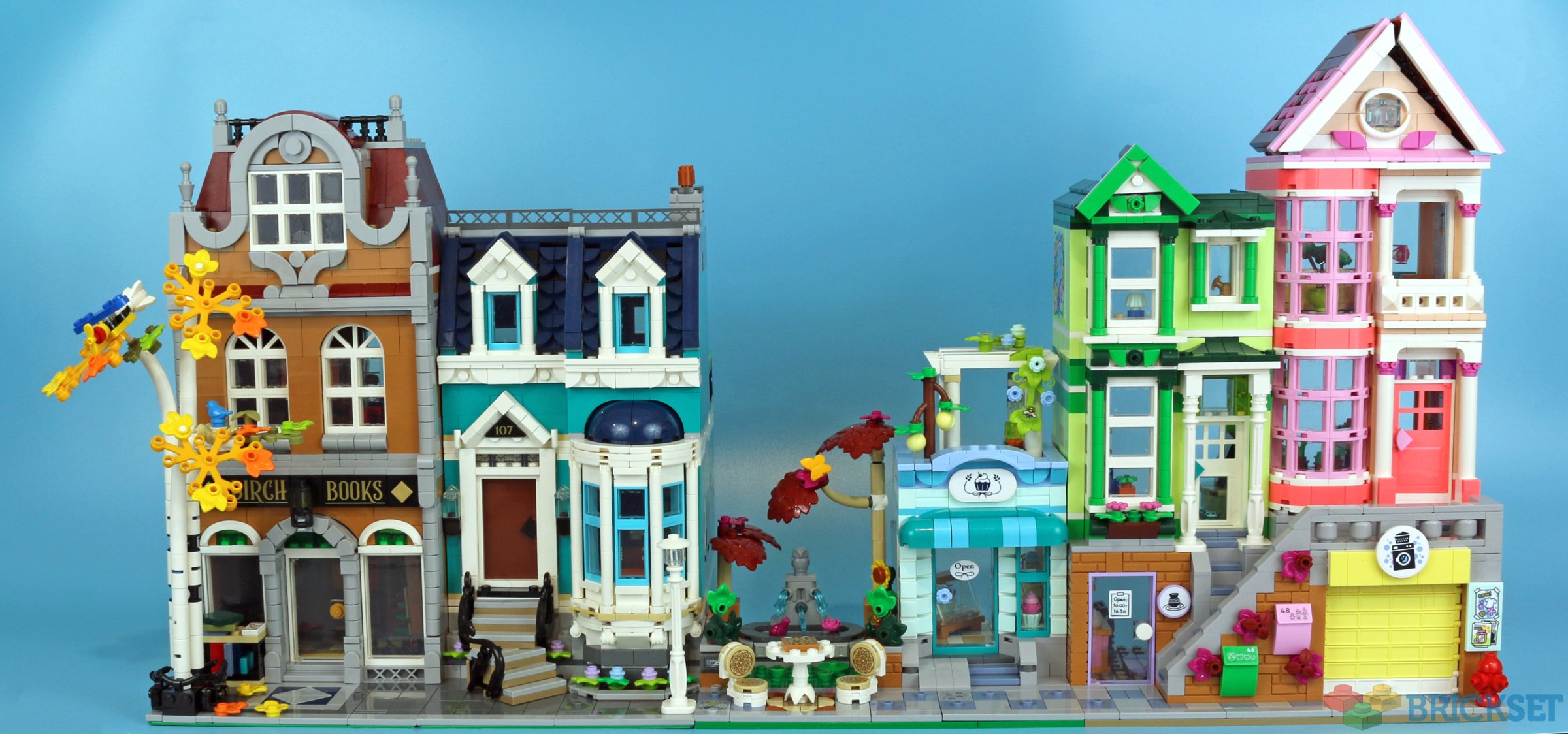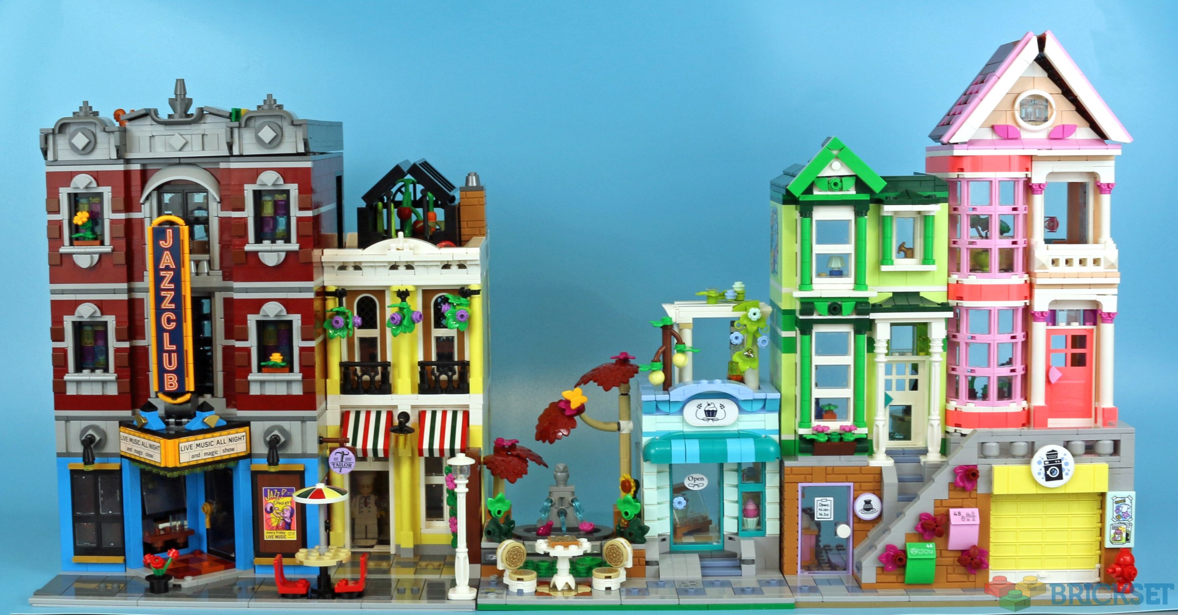 Placing the buildings next to each other looks okay, but the park looks like an afterthought. 42670 is definitely much more colourful than the Bookshop and really brightens up the street. Still, I don't think it looks particularly out of place.