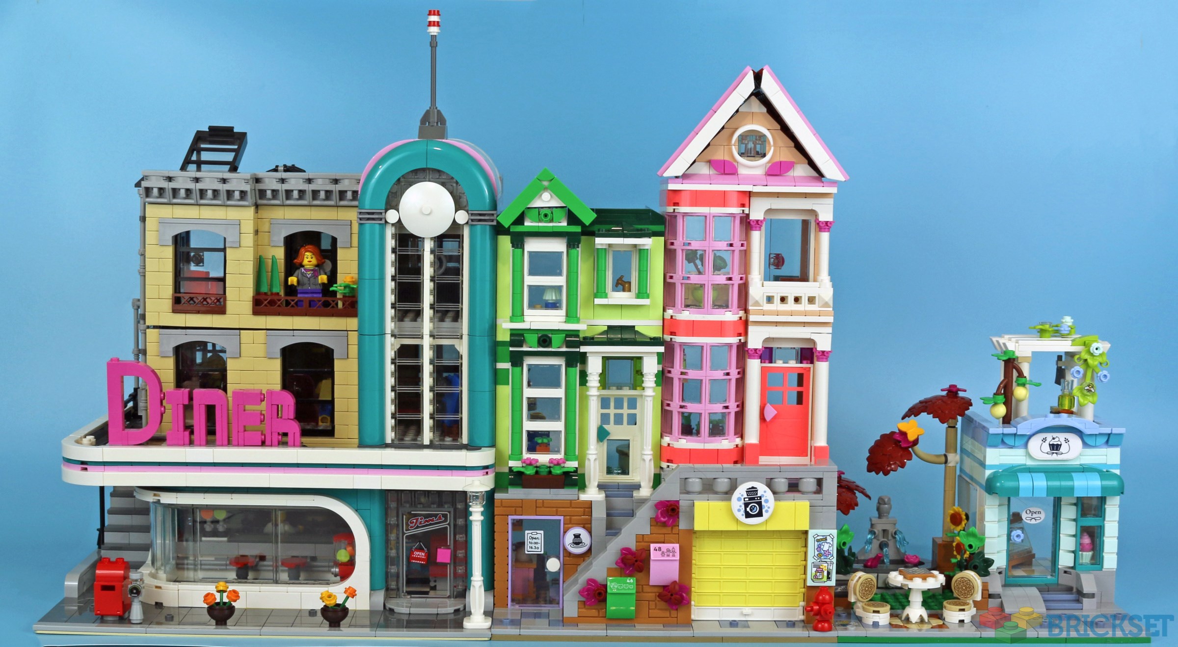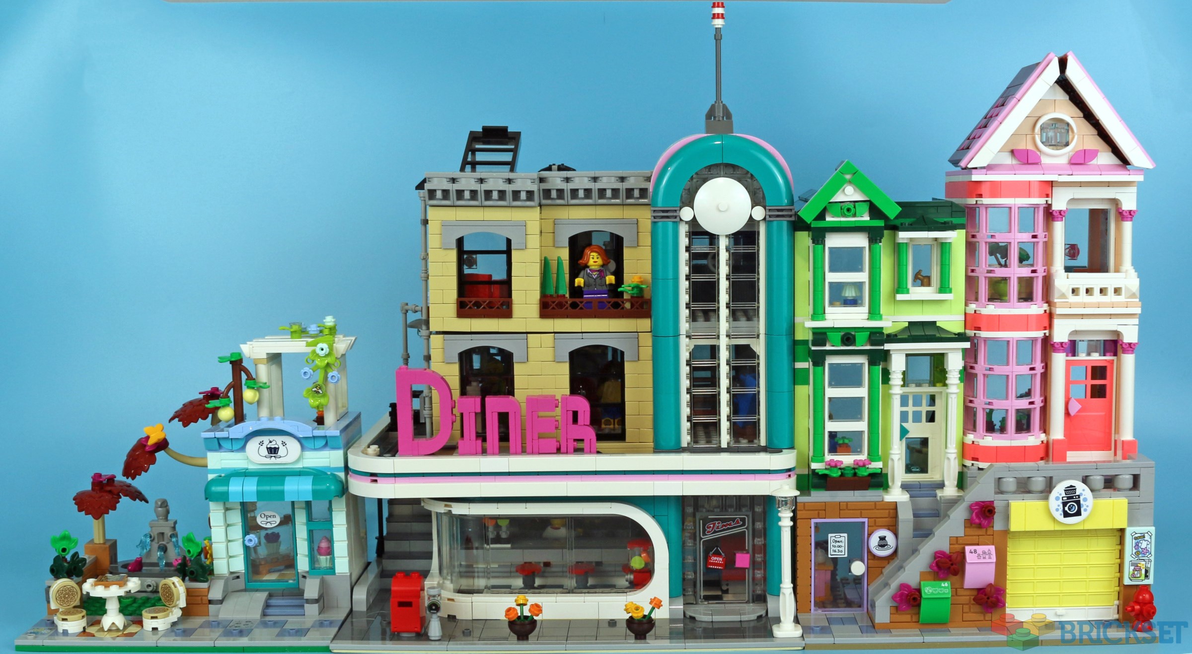 Ooh, I'm very impressed how seamlessly these blend in! Really showcases how well the apartment earn their 12+ age marking with both their size and their level of detail. I definitely think this set pairs better with the Bookshop, Pet Shop, and Jazz Club than with the Downtown Diner, though. Despite the similar embrace of bright colors, the Diner ends up feeling out of scale with these buildings due to its 32-stud-wide facade, and its art deco aesthetic and giant neon sign also seem like they belong to a different neighborhood than these more coordinated row houses (perhaps a commercial district).