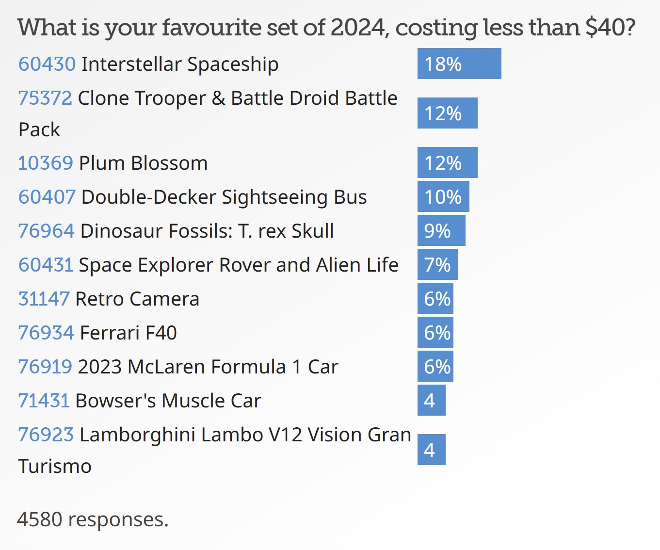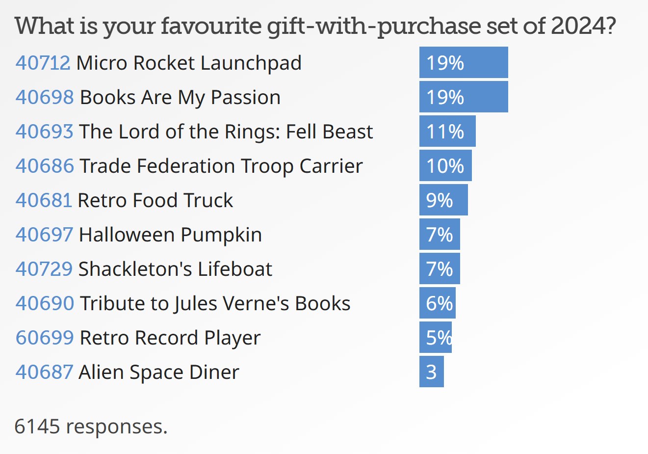 2024 was no exception, so we invited Brickset readers to vote for their favourite gift-with-purchase sets of the year and their favourites among sets costing less than $40. Nearly 11,000 votes have been submitted between the two polls, which is more than ever in these categories.