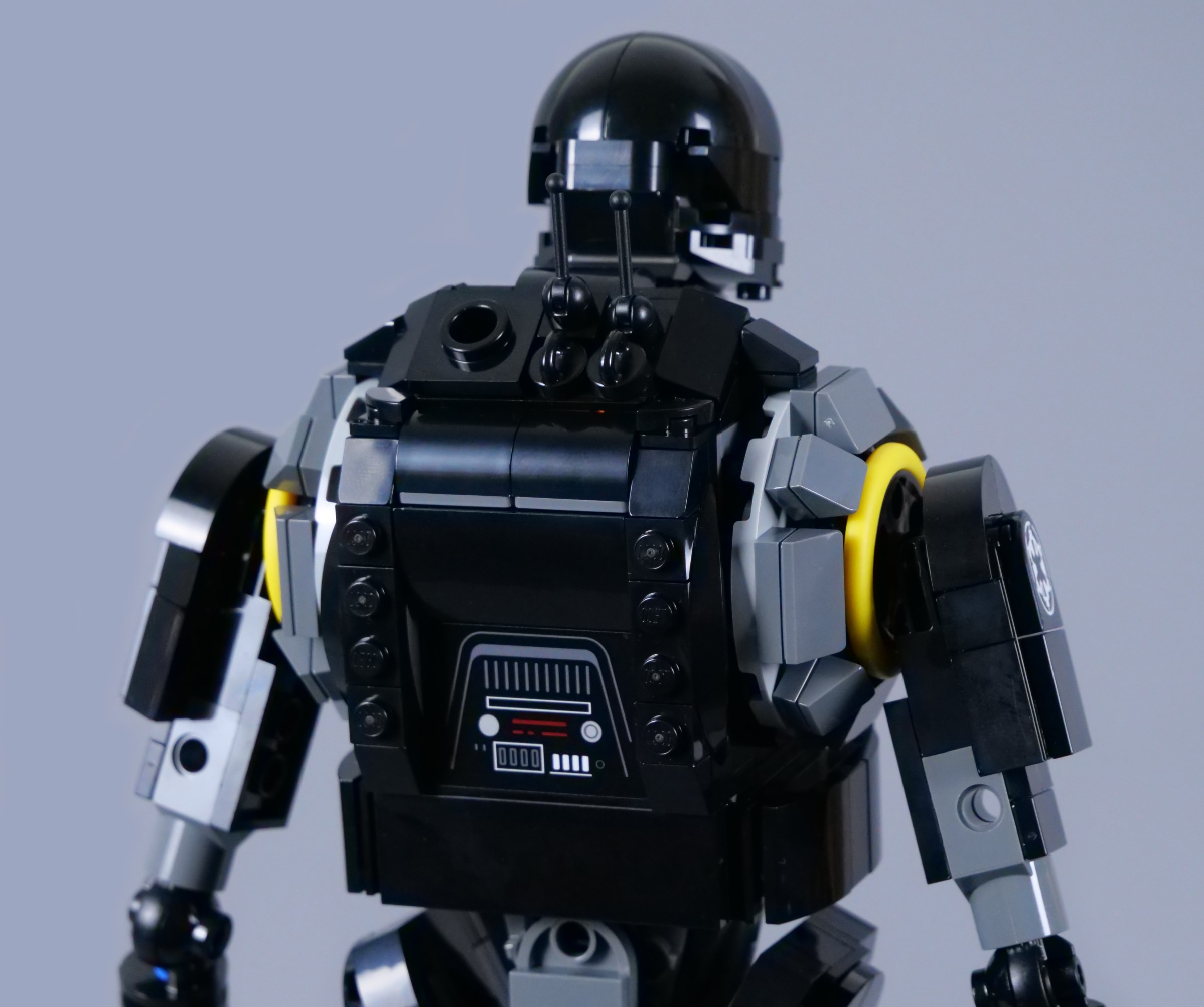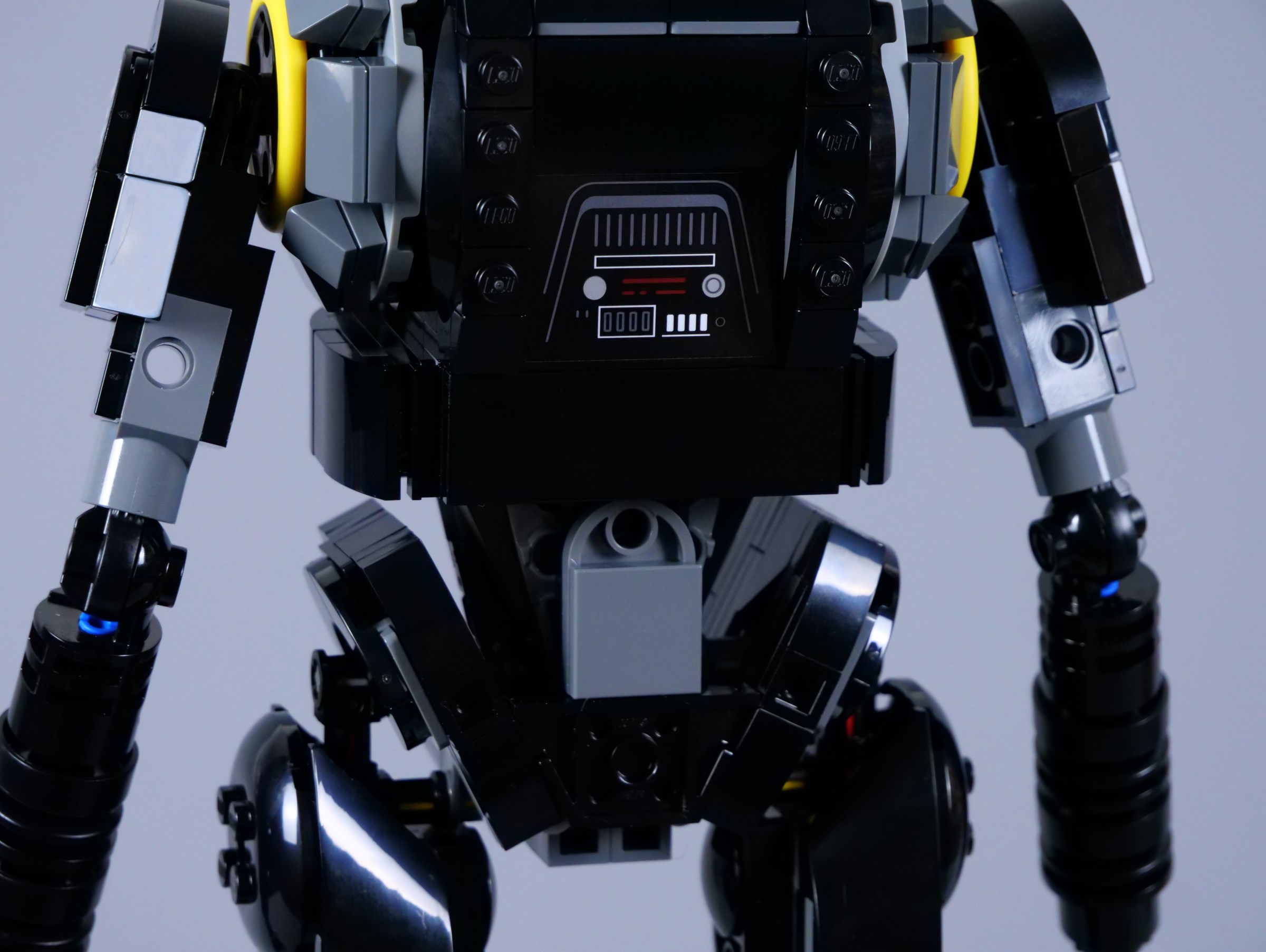 KX security droids are well over two metres in height onscreen and 75434 K-2SO captures the droids' lanky proportions perfectly. The slender legs and relatively small body are excellent and black was a fitting colour choice for K-2SO, with occasional dark bluish grey accents and yellow stripes around the shoulders.