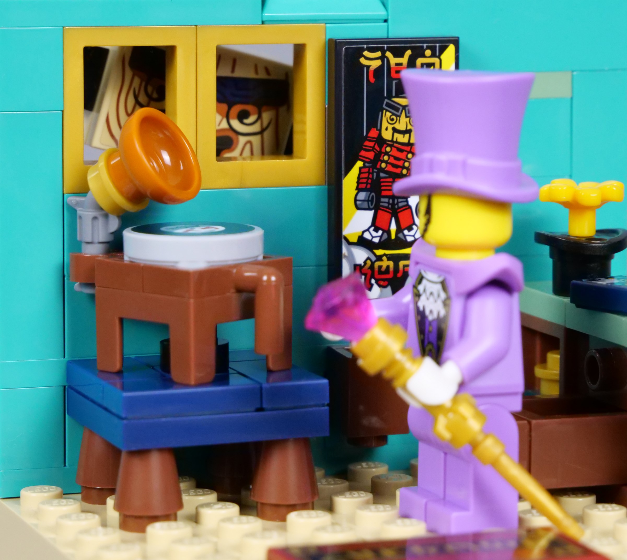Dorama is known primarily as an entertainer, but I can envisage him owning a magic shop too, perhaps to fund his passion for invention. Spring yellowish green and teal is an unusual colour scheme and works remarkably well, with the backs of 1x2 masonry bricks adding texture to the walls. In addition, the black chairs comprising the roof look marvellous.