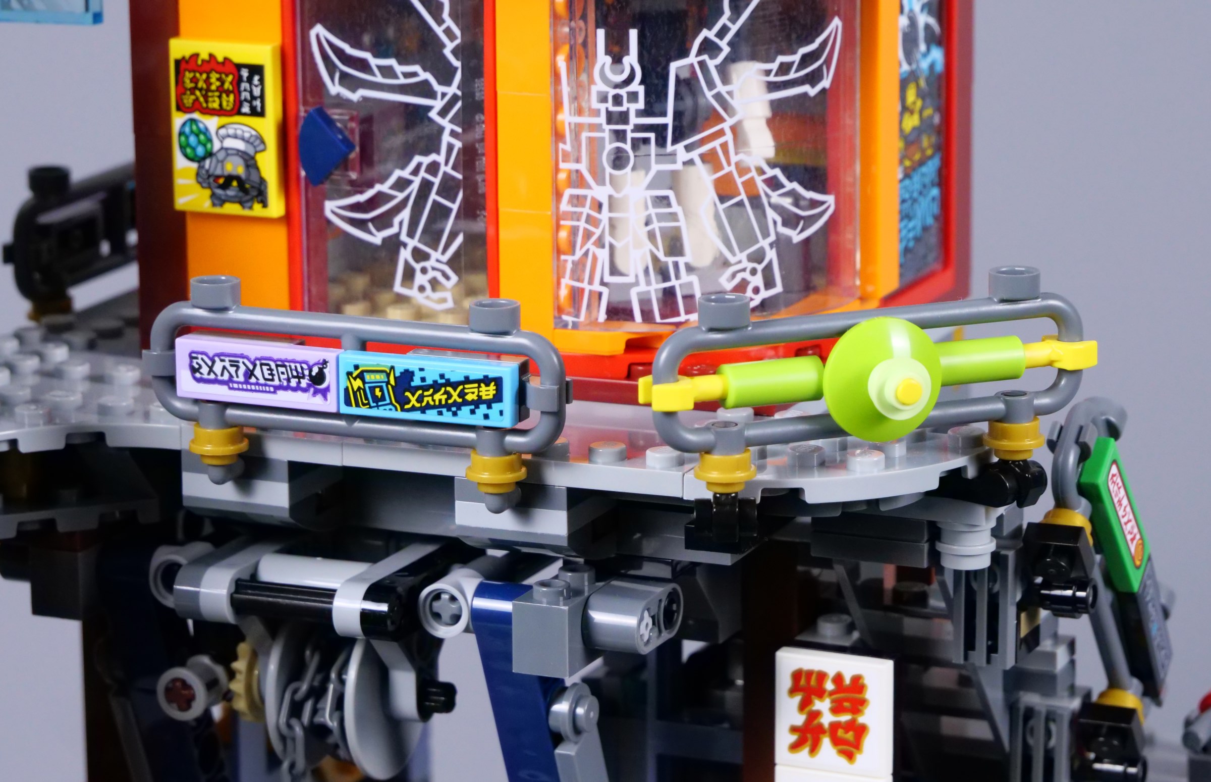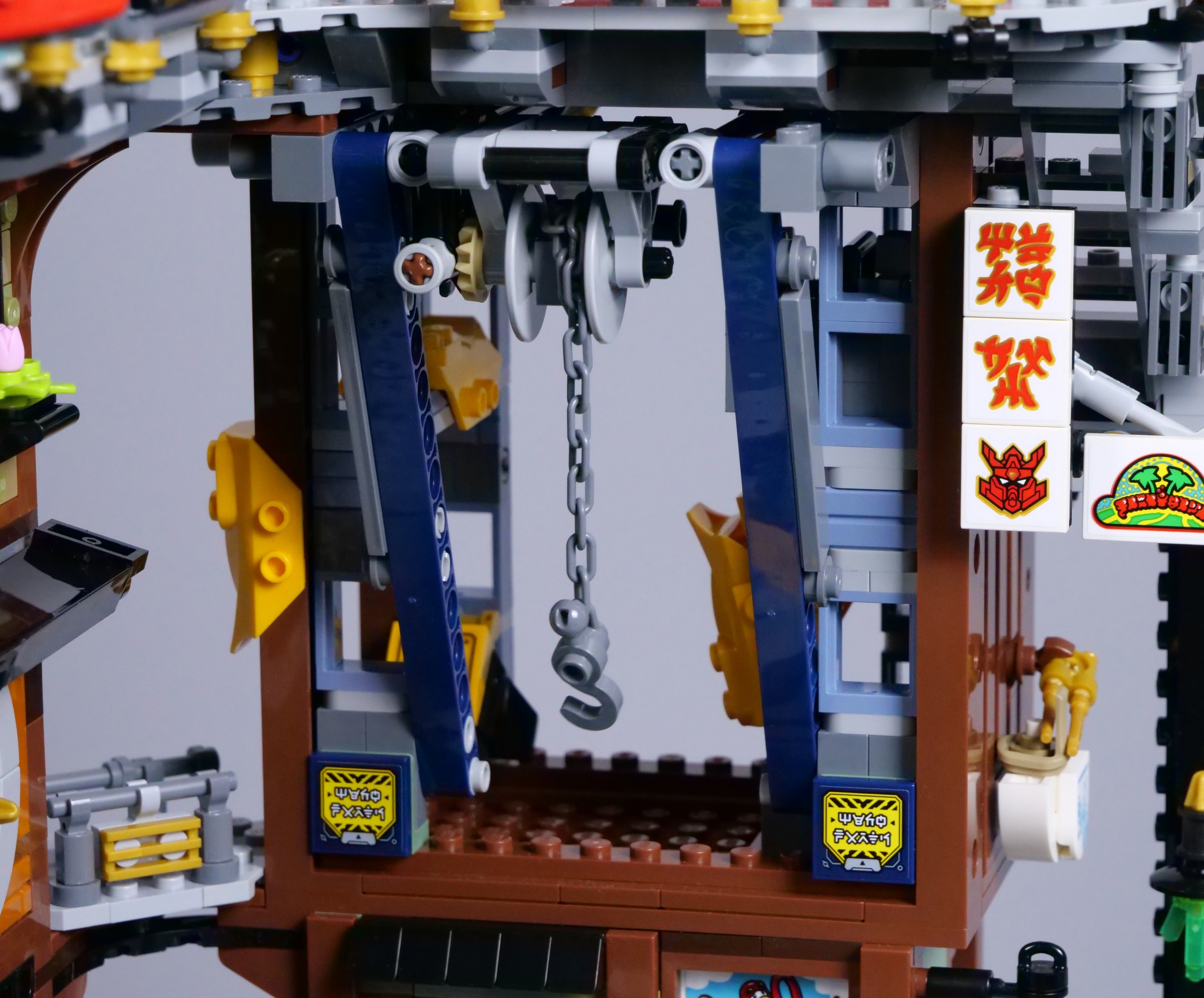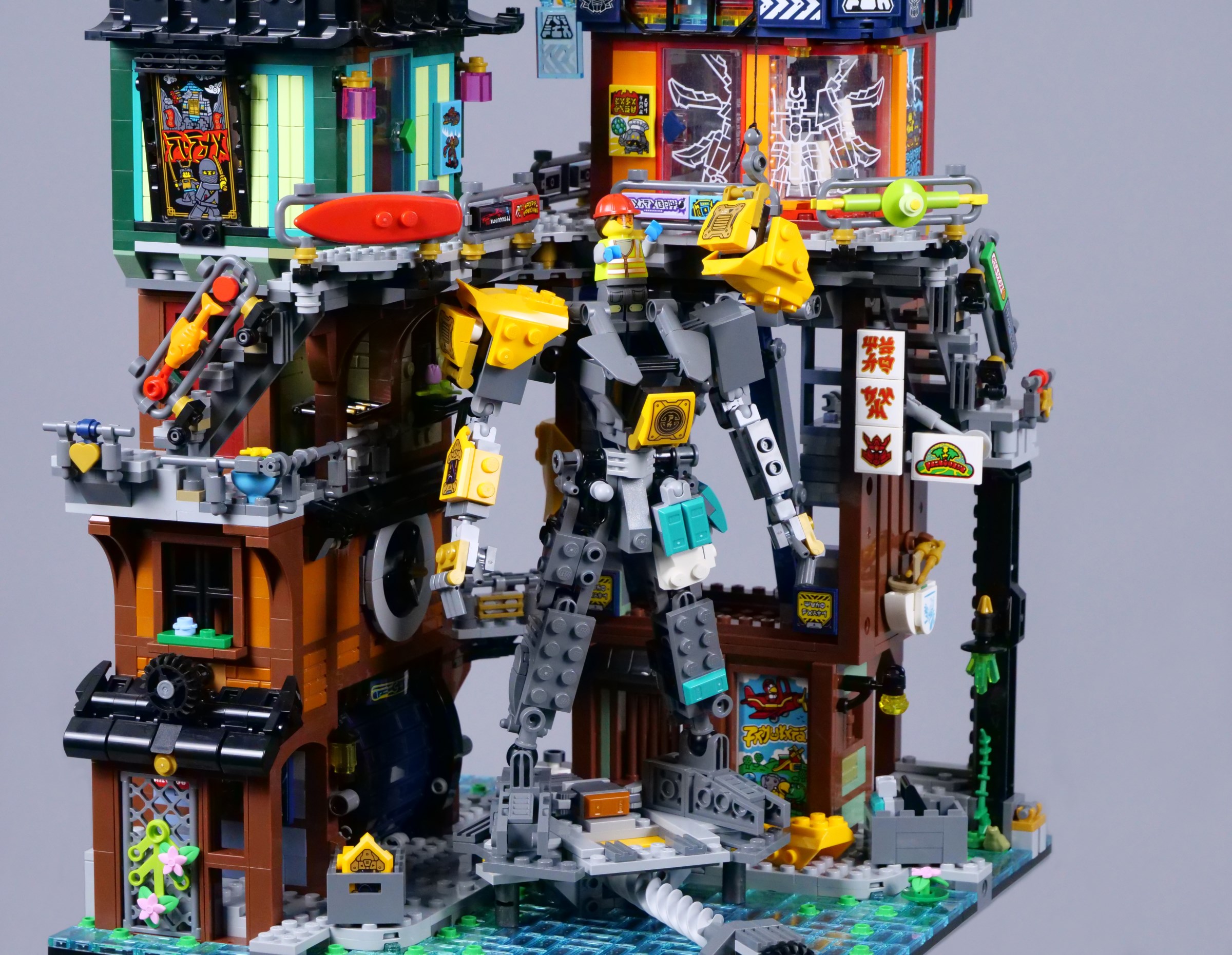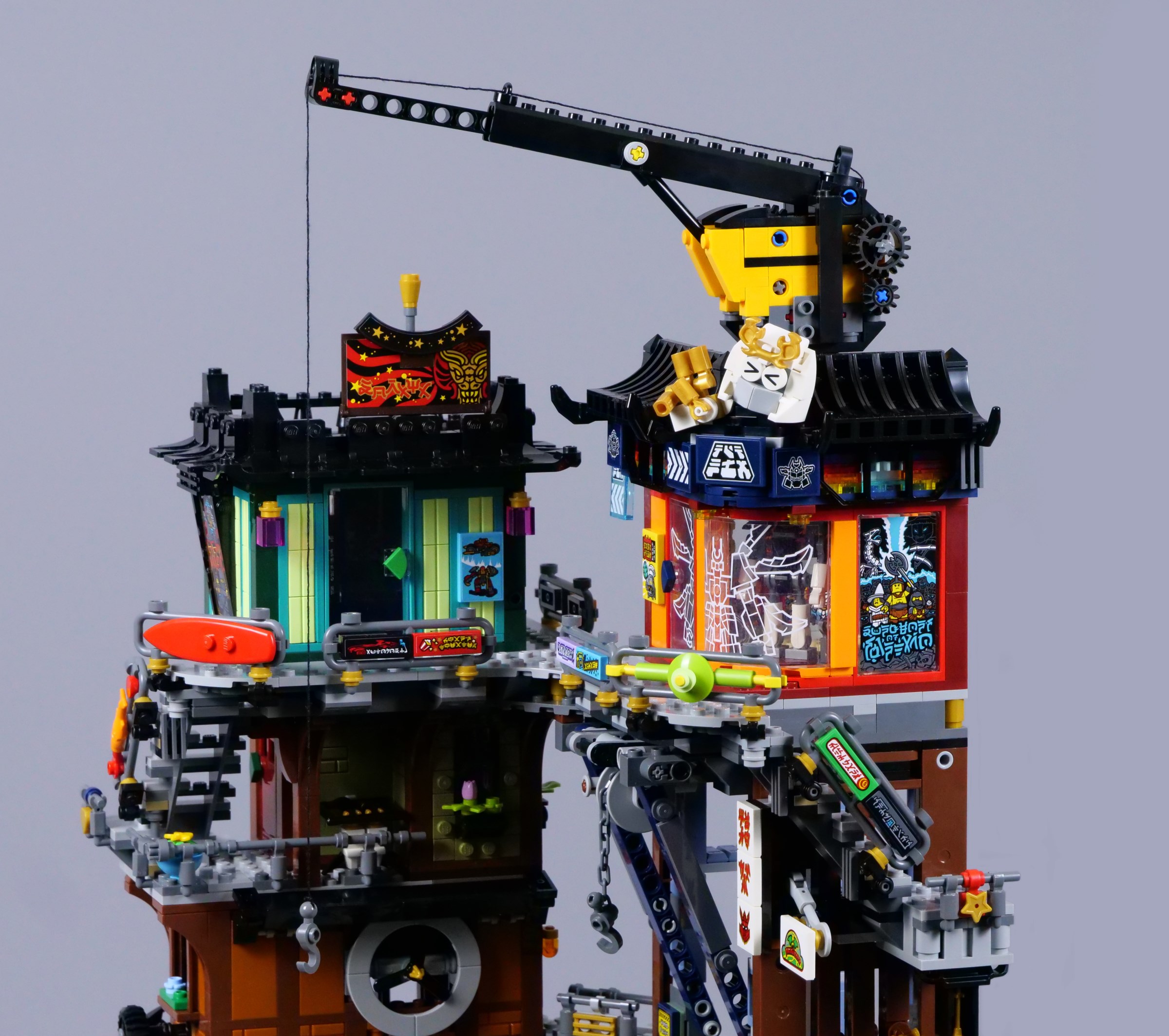 I mean, these have always been playsets. The very first Ninjago City set had integrated play functions like an elevator, a working ATM, a conveyor-belt sushi restaurant, and a grill that transformed a crab from raw to cooked. I don't really feel like functions such as the Markets' elevators, cable car and flushable toilet or this set's retractable mech platform, cranes, and opening garage doors are in any way a departure from that.