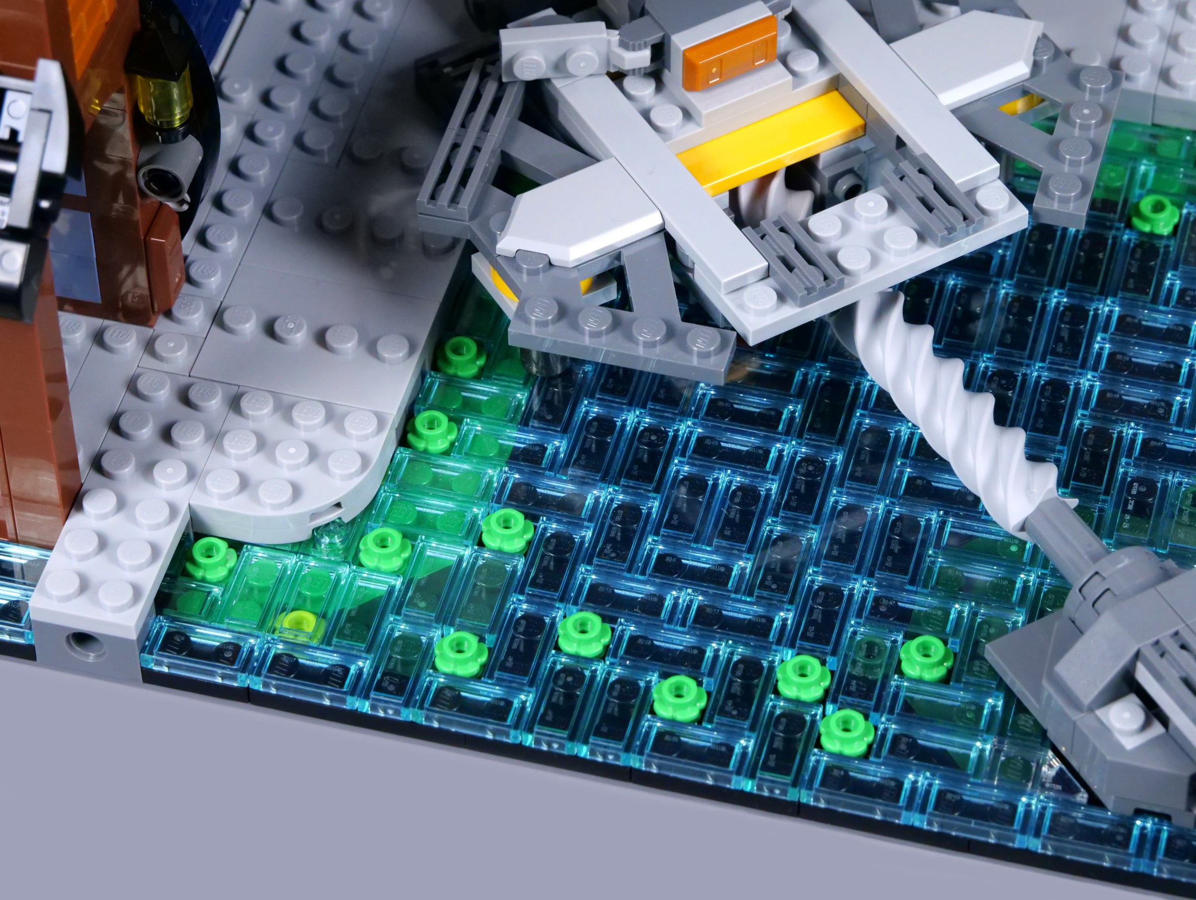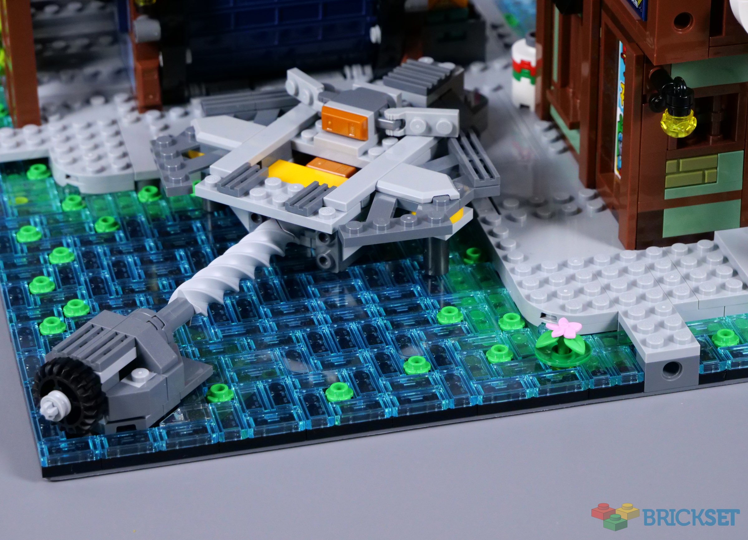 The green and dark green plates used around the edges of the walkway are excellent as well, where plants are growing in shallower waters. However, I wish there was something related to the industrial setting, similar to the outflow pipes in 70620 NINJAGO City and 71799 NINJAGO City Markets. An oil slick on the surface would have been an interesting detail, for instance.