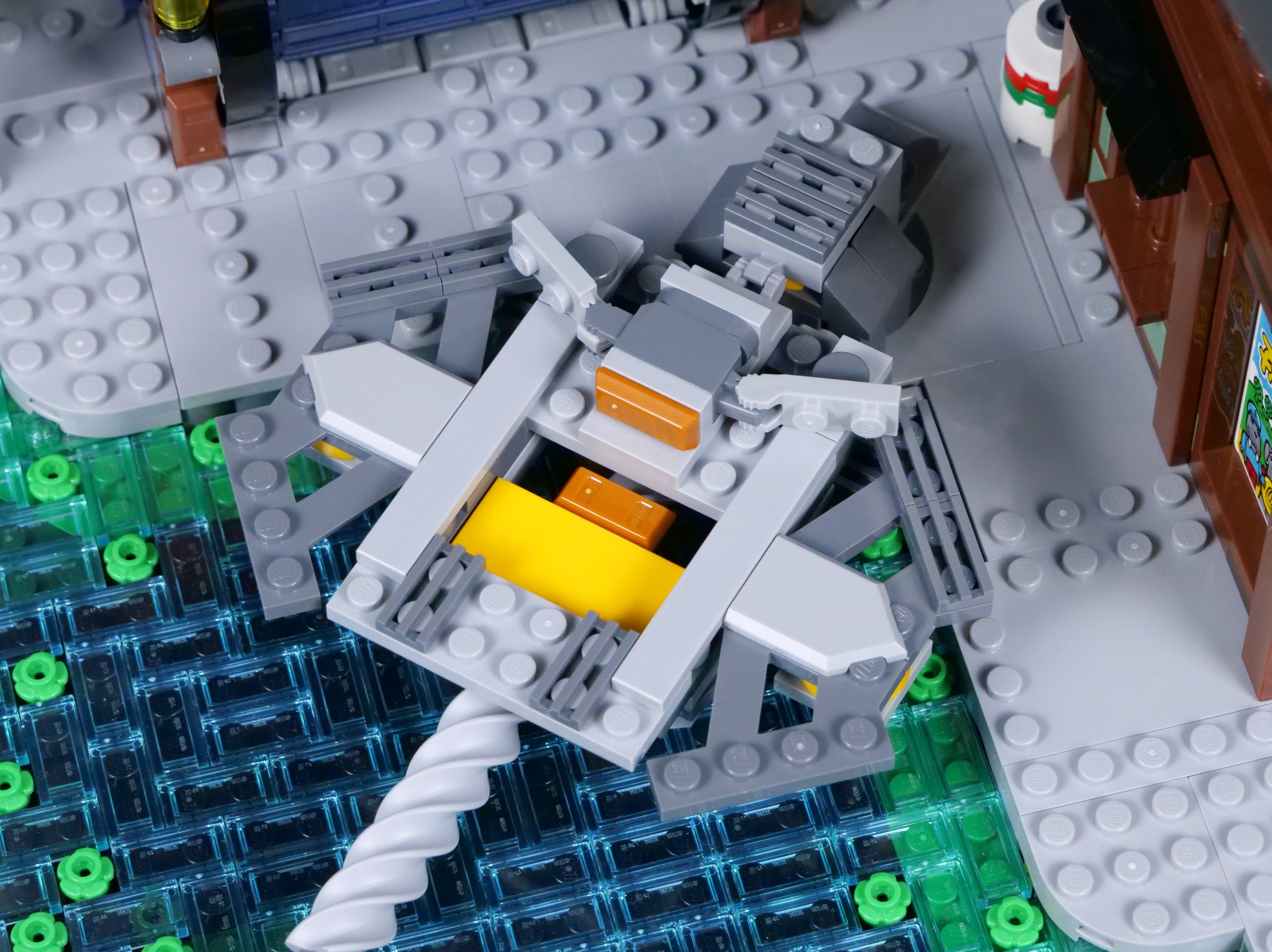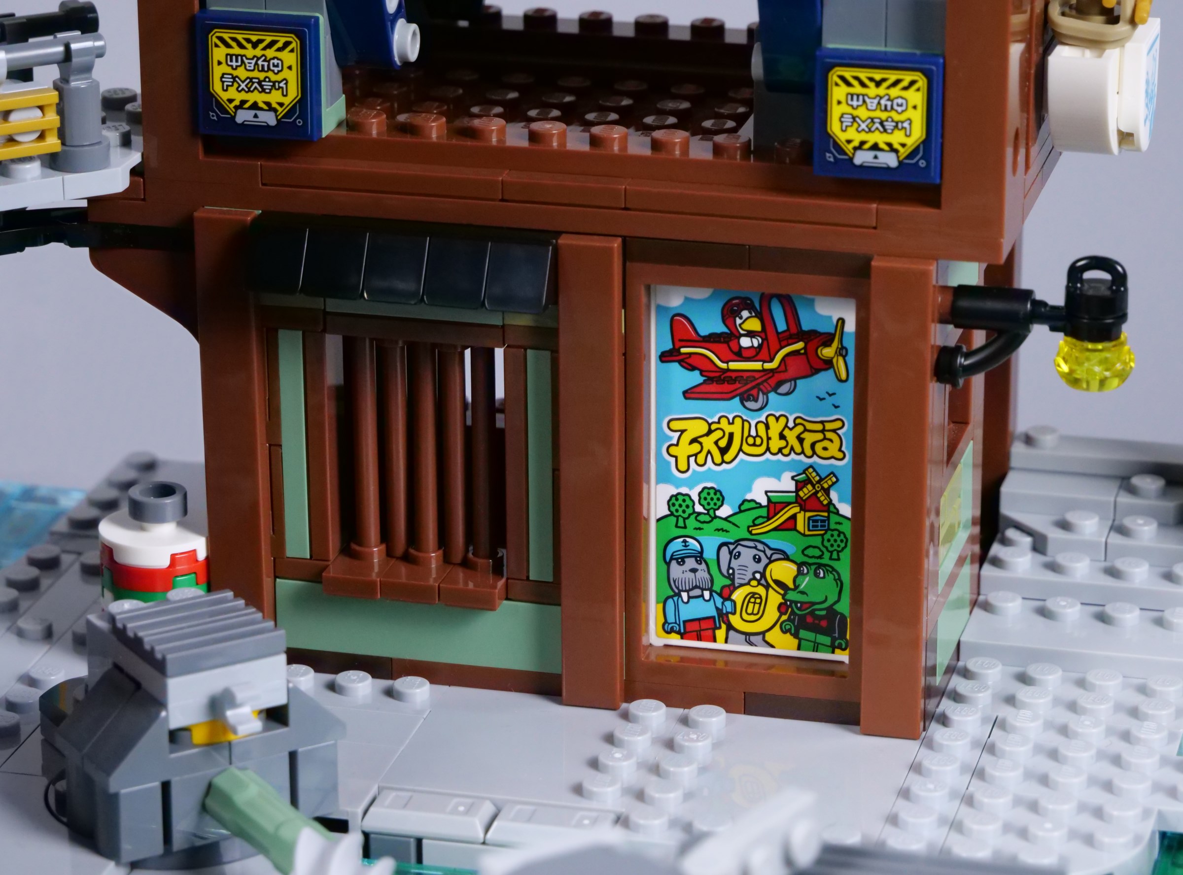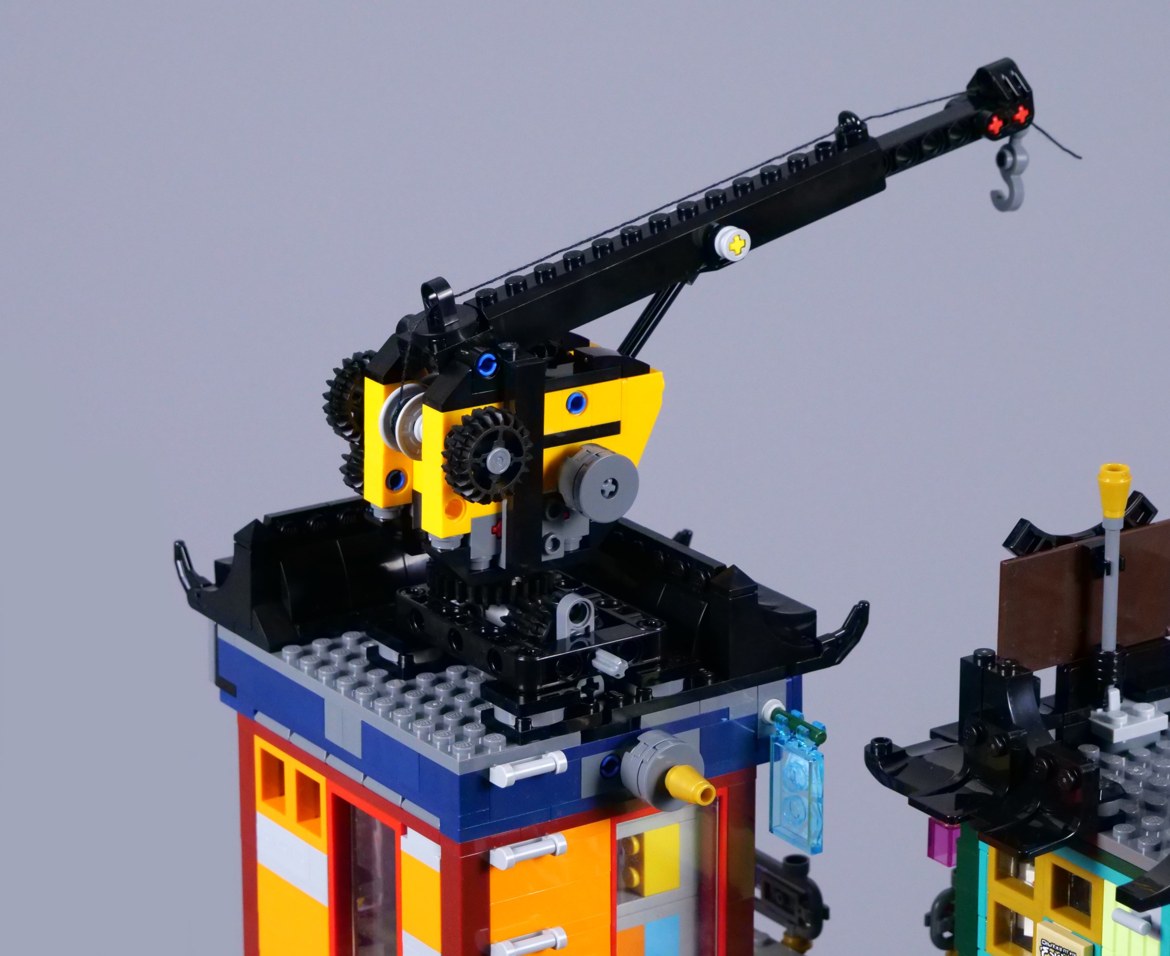 Moving back outside, a large crane is mounted on the Ninpla shop. This is definitely my least favourite part of the set because it feels like an afterthought, plonked on top without fitting the architecture. I suppose this is logical in some regards, as the crane could be a new addition to the Workshops, but it lacks detail relative to the structures below.