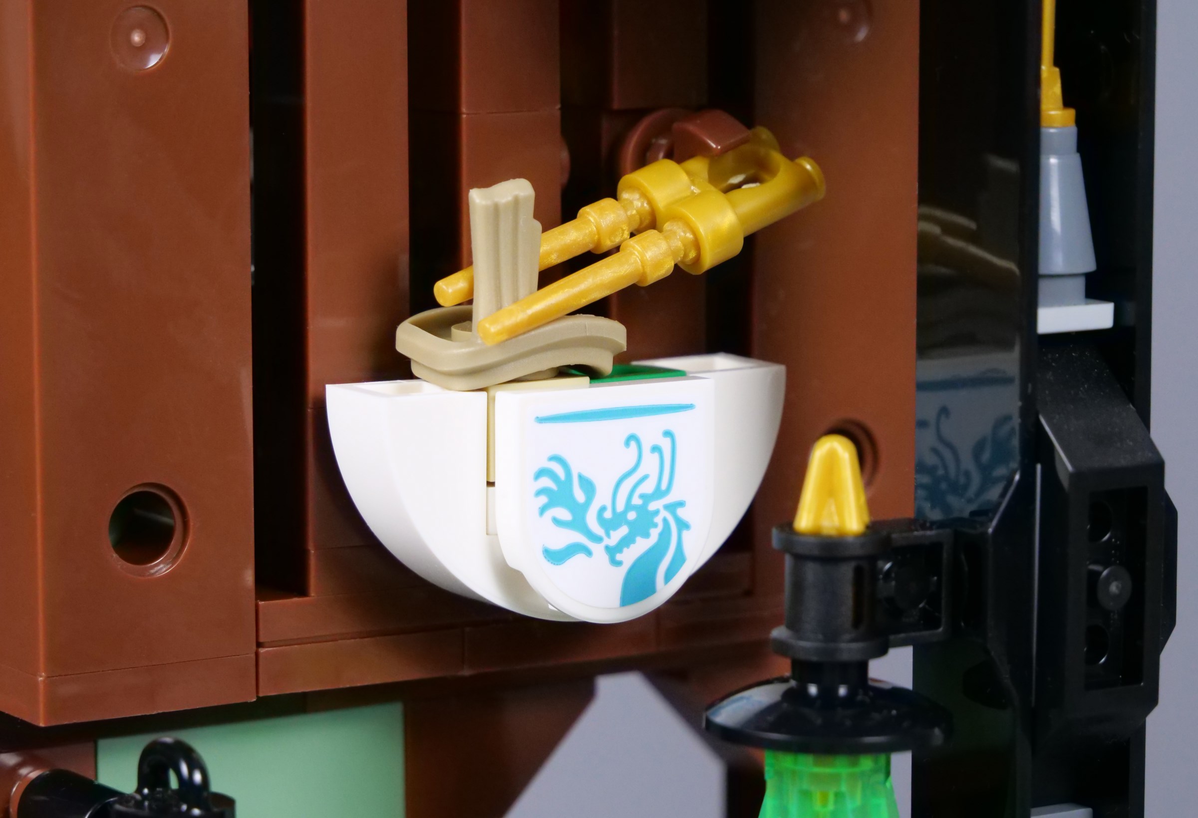 While the crane arm forming a column and the peony serving as a lamp are clever, I think the dark tan scarf representing noodles is even better! This element looks stunning on the noodle shop sign, between two wands as chopsticks. The bowl is also neatly assembled and features another sticker, with a dragon design reminiscent of the Tea Vendor in the Markets.